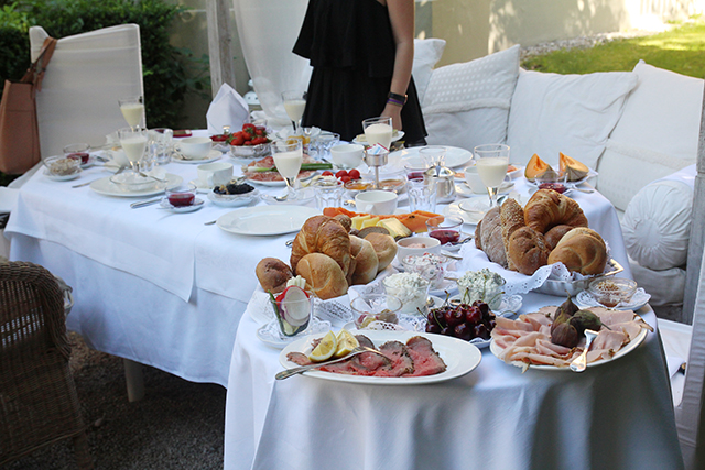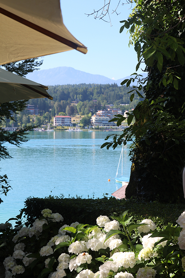 Wohnen wie eine Prinzessin, Frühstücken mit Blick auf den See und sonnen am hauseigenen Badestrand. Die Rede ist vom Seeschlössl in Velden. Das meiner Meinung nach schönste Plätzchen  am Wörthersee  (das ich gesehen habe)  möchte ich euch auf keinen Fall vorenthalten. Wir haben am Sonntag dort gefrühstückt und es war einfach traumhaft. Geräucherter Lachs, Roastbeef, Marmeladen, frischer Honig, Mango-Joghurt, ganz viele Beeren und anderes leckeres Obst, Gebäck, Käse, Antipasti und weiches Ei im Glas – ich war überfordert mit der großen Auswahl, die wir an den Tisch serviert bekommen haben und wusste gar nicht wo ich zuerst beginnen soll. Natürlich wurde alles gekostet und ich war wirklich begeistert und danach konnte man mich rollen, so voll war ich. Es war einfach der perfekte Abschluss, mit lieben Bloggerinnenim Garten  zusammensitzen, essen und plaudern, besser geht es einfach nicht mehr.