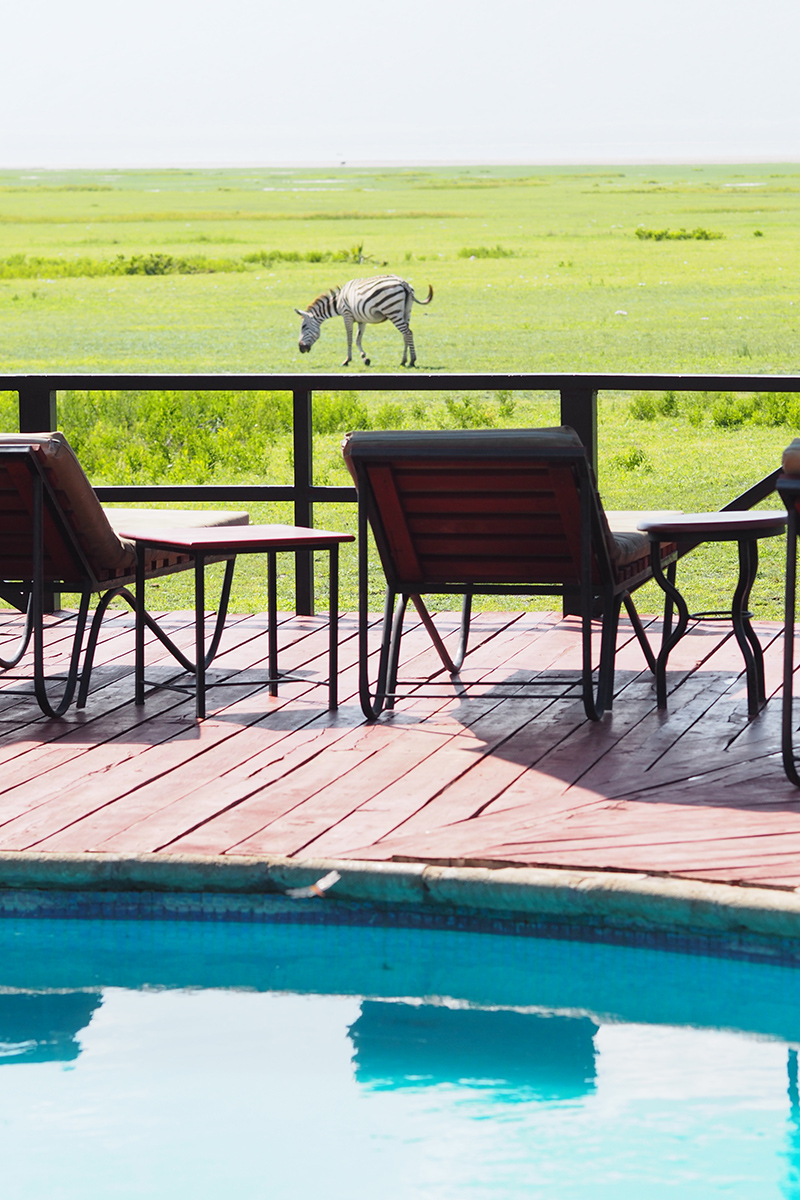 Diese Nacht übernachteten wir im Manyara Wildlife Camp und eigentlich habe ich mit so richtigen Zelten gerechnet, bzw. hatte ich die Unterkunft nicht mehr so genau in Erinnerung. Dort angekommen erwarteten uns jedoch “Luxuszelte” mit einer traumhaften Aussicht über den Park. Ich habe noch nie so einen schönen Sonnenuntergang gesehen und wir sind einfach nur schweigend auf unserer Terasse gestanden und haben die Landschaft bewundert. Es gab auch einen unglaublich schönen Pool, doch da es schon sehr frisch war haben wir den nicht mehr genutzt. Dort wurden wir auch das erste Mal von unserem “Luxuszelt” abgeholt und zum Abendessen gebracht, denn sobald es finster wird soll man sich nicht mehr alleine bewegen. Man weiß ja nie welche Tiere in der Nacht vorbeispazieren. Hier gab es Buffetessen, aber im kleinen Rahmen und es war ein wirklich netter Abend mit unheimlich gutem Essen (Curry, Curry, Curry). wir hatten übrigens auch ein Haustier. Eine kleine Maus lief oben im Zelt den Balken entlang, aber ja ganz normal wenn man mitten in der Natur schläft.