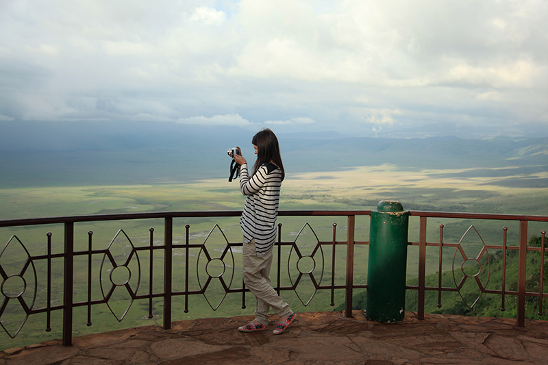 Ausgeschalfen ging unser Abenteuer weiter Richtung Ngoronoro Krater, wo wir das letzte Tier der Big 5 das Nashorn zu Gesicht bekamen. Auch diese Tiere sind ziemlich scheu und nur selten zu sehen. Wir warteten auch hier eine Ewigkeit und langsam aber doch näherte sich das Nashorn und wir konnten es vor die Linse bekommen. Der Ngorongoro Krater war ganz faszinierend, denn über diesem Krater hing eine riesige Nebeldecke. Auf der einen Seite war es wunderschön und strahlender Sonnenschein und auf der anderen Seite tobte ein Unwetter. Wir sind also einfach immer vorm Regen davon gefahren, war richtig spannend. An diesem Tag war übrigens ich das Highlight. Ich wurde von einer indischen Dame angesprochen und ich dachte zuerst, dass ich ein Foto von ihr und ihrer Großfamilie, die dabei war machen sollte. Falsch gedacht. Sie wollte ein Foto mit mir gemeinsam und ihre gesamte Familie zückte die Kameras und Handys und fotografierte uns. Ja das war ein lustiges Erlebnis und ist mir vorher noch nie passiert. Ob sie wohl meinen Blog liest (haha Scherz)?