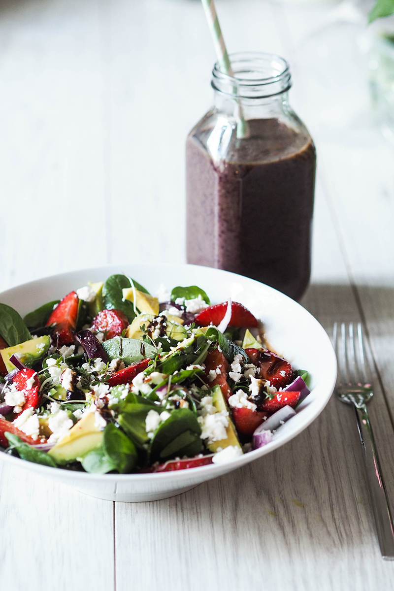 Ja mich hat das Frühlingsfieber so richtig erwischt. Nicht nur im Kleiderschrank stelle ich mich langsam aber doch auf die warme Jahreszeit ein, sondern auch in der Küche wird der Mixer (Smoothie Zeit) wieder in Betrieb genommen und es stehen vermehrt Salate auf meinem Speiseplan. Gestern wollte ich zu Mittag mal wieder etwas Neues ausprobieren und so habe ich kurzerhand einfach mal Erdbeeren in meinen Salat geworfen. Ja ich weiß, eigentlich ist noch nicht wirklich die richtige Zeit für Erdbeeren, aber wenn sie einen so anlächeln nach einem langen Winter kann ich einfach nicht vorbeigehen. Bis jetzt war ich eher skeptisch und konnte mir Erdbeeren nicht wirklich in salzigen Speisen vorstellen, doch auf Pinterest bekommt man das ziemlich oft zu sehen. Da mein Orangen Avocado Salat, den ich letztes Jahr probiert habe so lecker war habe ich es dieses Mal einfach mit Erdbeeren probiert. Dieser Salat ist nicht nur fotogen, sondern hat auch unheimlich gut geschmeckt und ich muss ihn ganz bald wieder machen.