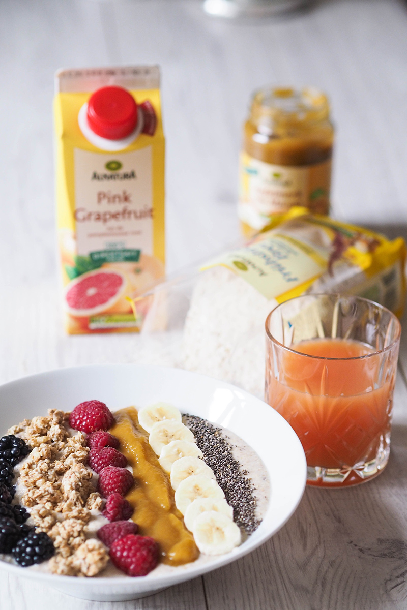 In den letzten Jahren ist das Frühstück eindeutig zu meiner Lieblingsmahlzeit geworden. Ich kann es mir gar nicht mehr vorstellen am Morgen nichts zu essen. Vor ein paar Jahren war das aber noch gang und gebe, denn meistens bin ich viel zu knapp aufgestanden und es war dann einfach keine Zeit mehr um zu frühstücken. Meistens musste schnell schnell irgendein Obst herhalten. Mittlerweile stehe ich gerne ein bisschen früher auf, um wirklich ganz gemütlich frühstücken zu können, denn so startet man gleich viel entspannter und mit viel Energie in den Tag. Da ich meinen Freund noch nicht wirklich davon überzeugen konnte, dass es sich lohnt für ein Frühstück etwas früher aufzustehen, essen ich unter der Woche meistens alleine. Bzw. manchmal kommt es auch vor, dass er doch gerne etwas hätte und einfach meine Portion klaut. Nur am Sonntag wird dann groß aufgetischt und gemeinsam gefrühstückt und da darf dann auch wirklich alles von süß bis salzig dabei sein. Unter der Woche esse ich unheimlich gerne Porridge, Grießbrei oder ein Müsli, am liebsten mit ganz vielen frischen Früchten – das geht schnell und ist gesund. Als MERKUR zur Alnatura Frühstücksbowl Challenge aufrief, hatte ich sofort ein Bild in meinem Kopf wie meine Frühstücksbowl aussehen sollte – Viele frische Beeren, mein Lieblingscrunchymüsli von Alnatura und natürlich ein leckerer frischer Saft. Also wurde gleich mal bei Merkur ordentlich eingekauft, wo ich auch den Frühstücksbrei von Alnatura das erste Mal entdeckte und gleich in meine Bowl integriert habe. Seitdem gehört dieser leckere Brei fast täglich zu meinem Frühstück dazu, denn er schmeckt unheimlich lecker und das wichtigste er ist nicht so süß. Ich bin ein großer Fan von so hübschen Frühstücksbowls, da macht das essen gleich noch mehr Spaß, findet ihr nicht?