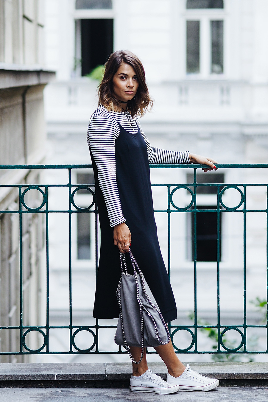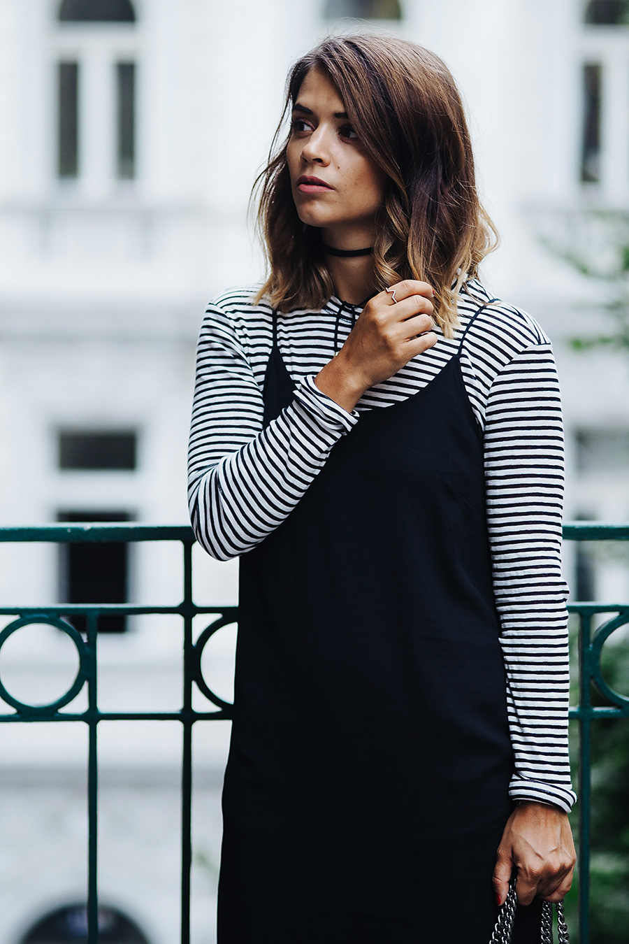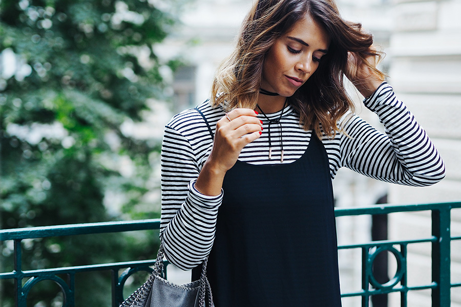 Als mein Freund mich mit neuen Haaren und in diesem Look gesehen hat, meinte er ich könnte als 16-jährige durchgehen. Er wollte mir damit nicht sagen, dass ich so jung aussehe, sondern dass die Wahl meiner Klamotten ihn einige Jahre zurückversetzen, vor allem meine Halskette. Ja die 90-iger sind zurück und ich finde es super. Auch die Kombination Kleid über Shirt trage ich momentan unheimlich gerne, und besonders Streifenshirts sind da bei mir wieder hoch im Trend. Nicht nur der Look ist neu, sondern auch meine Haare, haben wieder den nötigen Schnitt bekommen. Endlich war ich wieder bei der lieben Carola und habe ein bisschen Mähne dort gelassen. Meine Haare haben in den letzten Wochen und Monaten wieder ein bisschen viel Sonne abbekommen und dementsprechend haben sie auch ausgesehen. Da mir der Schnitt vom letzten Mal so gut gefallen hat, habe ich mich wieder dafür entschieden. Nichts geht über einen coolen Clavi Cut. Außerdem wurde der Gelbstich mit einer Tönung entfernt und endlich sehen meine Haare wieder schön frisch aus. Ich bin super Happy mit dem Ergebnis und die Farbe ist endlich so wie ich sie immer wollte. Wenn ihr einen guten Friseur in Wien sucht, solltet ihr unbedingt zu Carola gehen, denn sie kennt ihr Handwerk und ich war noch nie so zufrieden mit einem Ergebnis, wie die letzten Male.