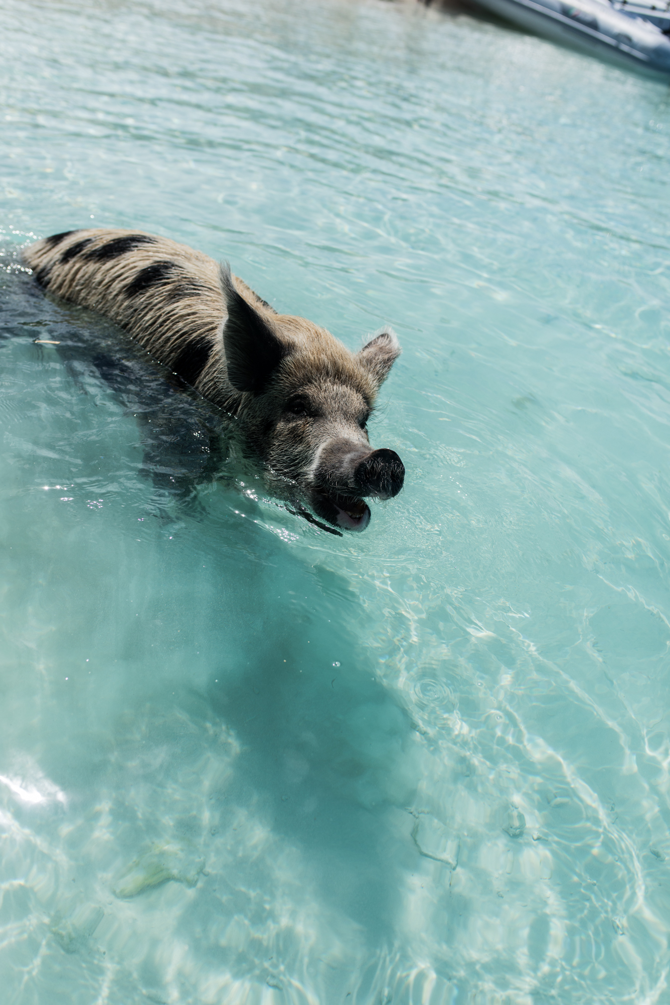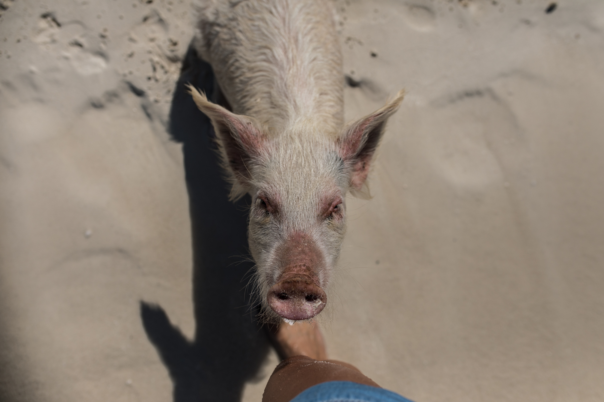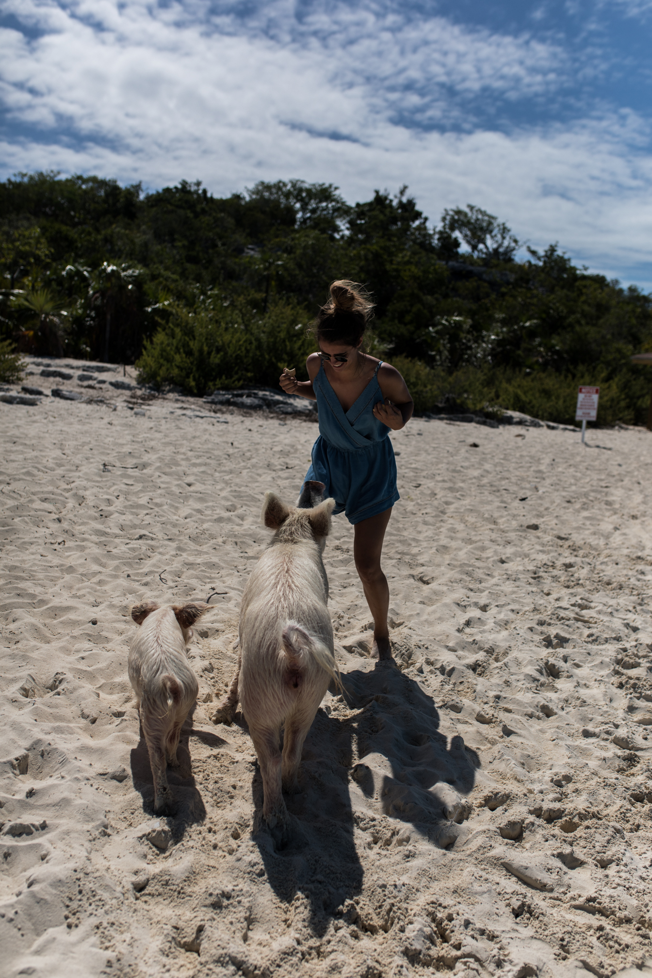 Als nächstes ging es auch schon zu den schwimmenden Schweinen. Diese Tierchen sind die Hauptattraktion und ja wenn man nicht gleich in der Früh hinfährt, dann wimmelt es hier nur von Menschen, was eigentlich ziemlich schade ist. Zur Geschichte, vor 10 Jahren hat ein Mann zwei Schweine auf die Insel gesetzt um Nahrung dort zu haben, doch irgendwie haben sich diese Schweinchen so schnell vermehrt, dass es zu der Attraktion auf den Bahamas wurde. Die Schweine leben frei auf der Insel und teilweise gehen sie auch ins Meer schwimmen und sind relativ handzahm. Leider denken viele Menschen auch nicht mit und füttern die Tiere mit irgendeinem blödsinn – so gab es neben Brot, Obst und Gemüse auch Chips und Kräcker und das ist wohl nicht gerade das richtige Essen für die Tiere. Es ist irgendwie echt schade wie sich dieser Ort verändert hat, aber ja jeder möchte natürlich zu den schwimmenden Schweinen, so auch wir. Achja Achtung, die Schweine sind zwar sehr handzahm, aber die großen können auch beißen oder klettern auch einfach mal auf einem herum – eigentlich total klar, denn sie sind Menschen ja gewöhnt.