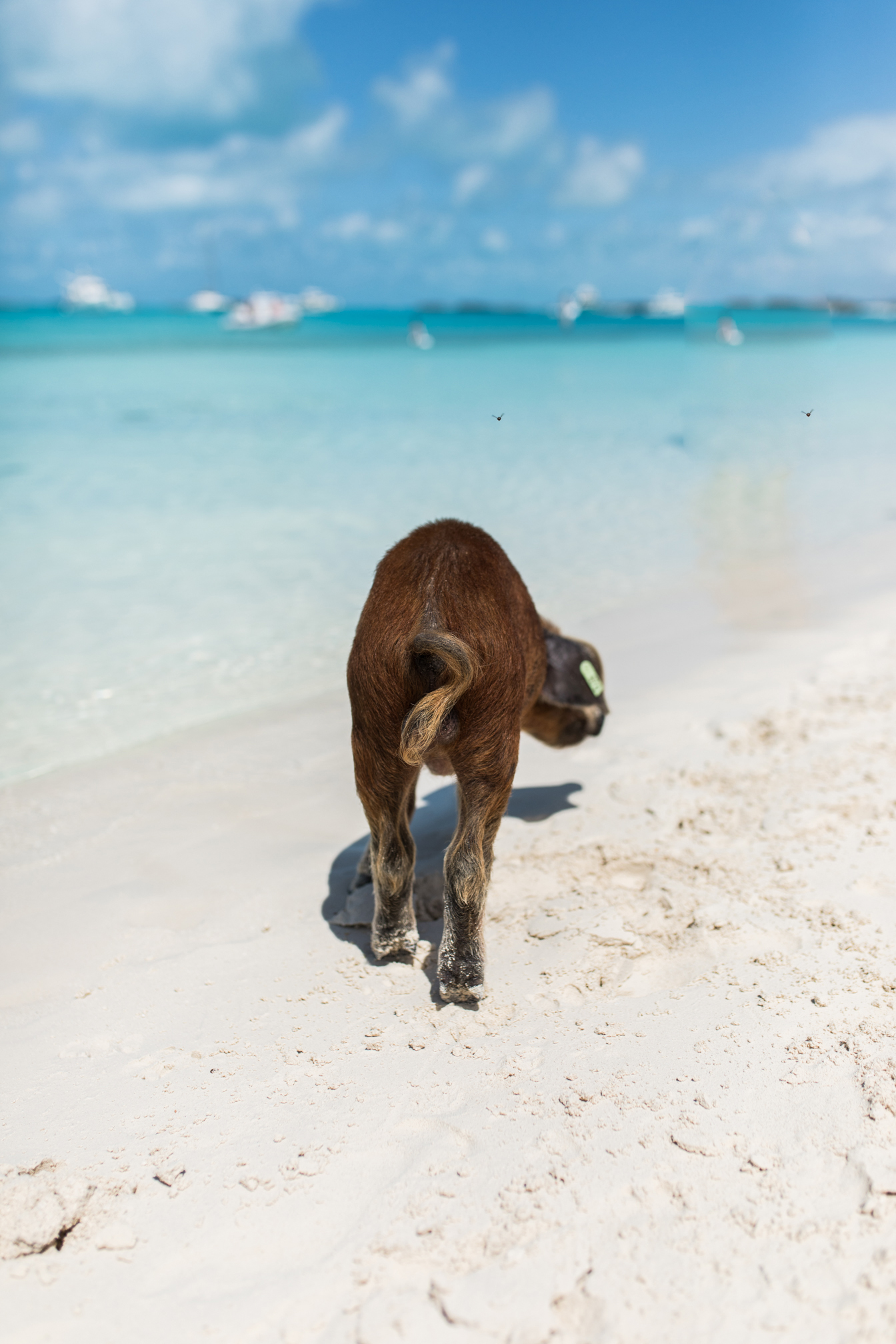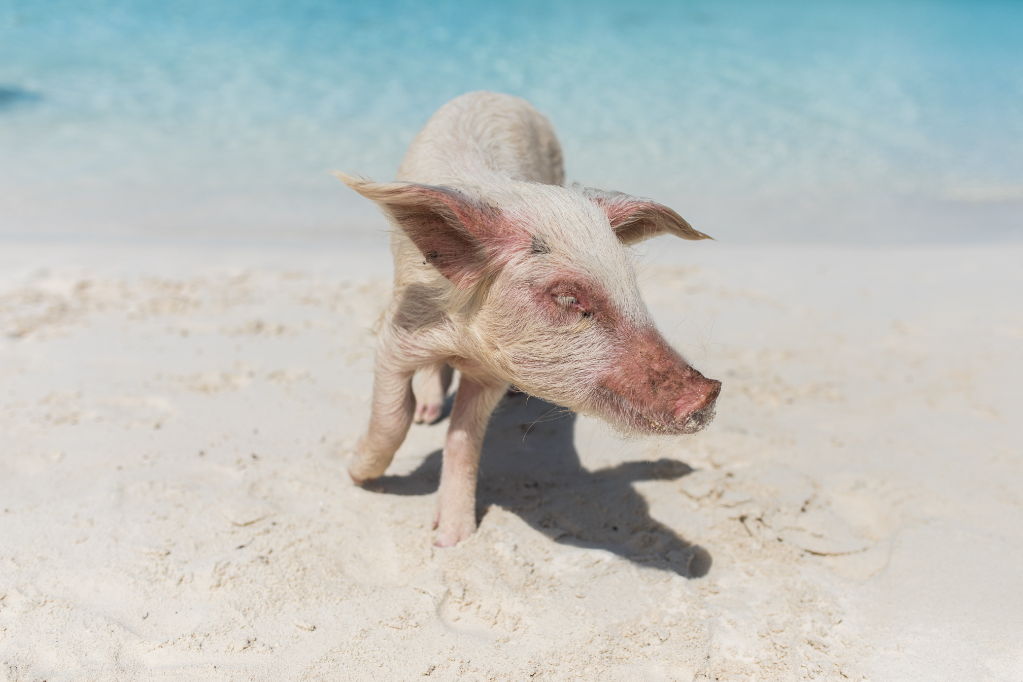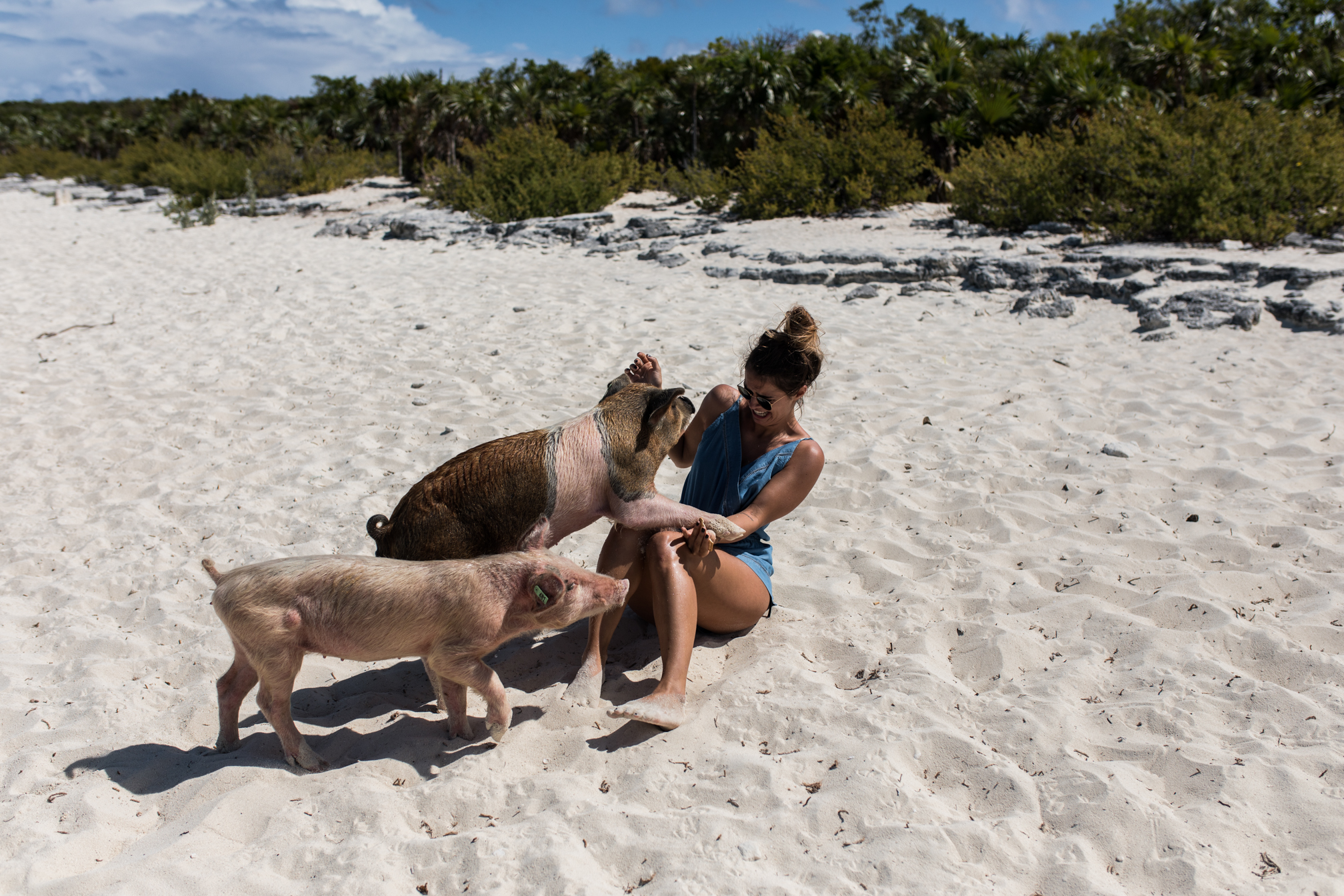 Als nächstes ging es auch schon zu den schwimmenden Schweinen. Diese Tierchen sind die Hauptattraktion und ja wenn man nicht gleich in der Früh hinfährt, dann wimmelt es hier nur von Menschen, was eigentlich ziemlich schade ist. Zur Geschichte, vor 10 Jahren hat ein Mann zwei Schweine auf die Insel gesetzt um Nahrung dort zu haben, doch irgendwie haben sich diese Schweinchen so schnell vermehrt, dass es zu der Attraktion auf den Bahamas wurde. Die Schweine leben frei auf der Insel und teilweise gehen sie auch ins Meer schwimmen und sind relativ handzahm. Leider denken viele Menschen auch nicht mit und füttern die Tiere mit irgendeinem blödsinn – so gab es neben Brot, Obst und Gemüse auch Chips und Kräcker und das ist wohl nicht gerade das richtige Essen für die Tiere. Es ist irgendwie echt schade wie sich dieser Ort verändert hat, aber ja jeder möchte natürlich zu den schwimmenden Schweinen, so auch wir. Achja Achtung, die Schweine sind zwar sehr handzahm, aber die großen können auch beißen oder klettern auch einfach mal auf einem herum – eigentlich total klar, denn sie sind Menschen ja gewöhnt.