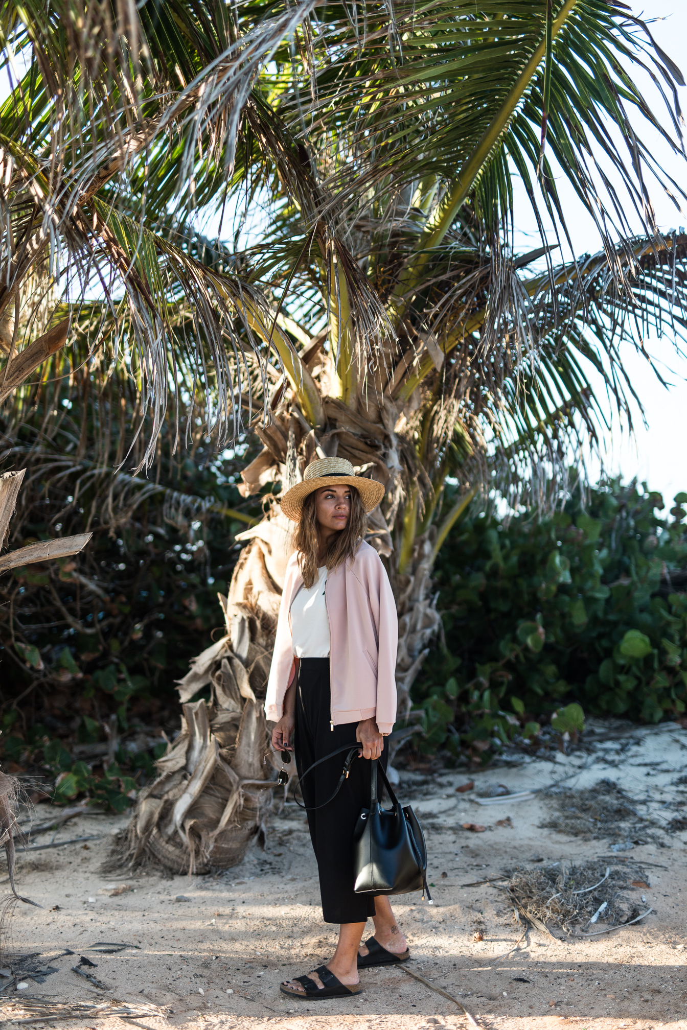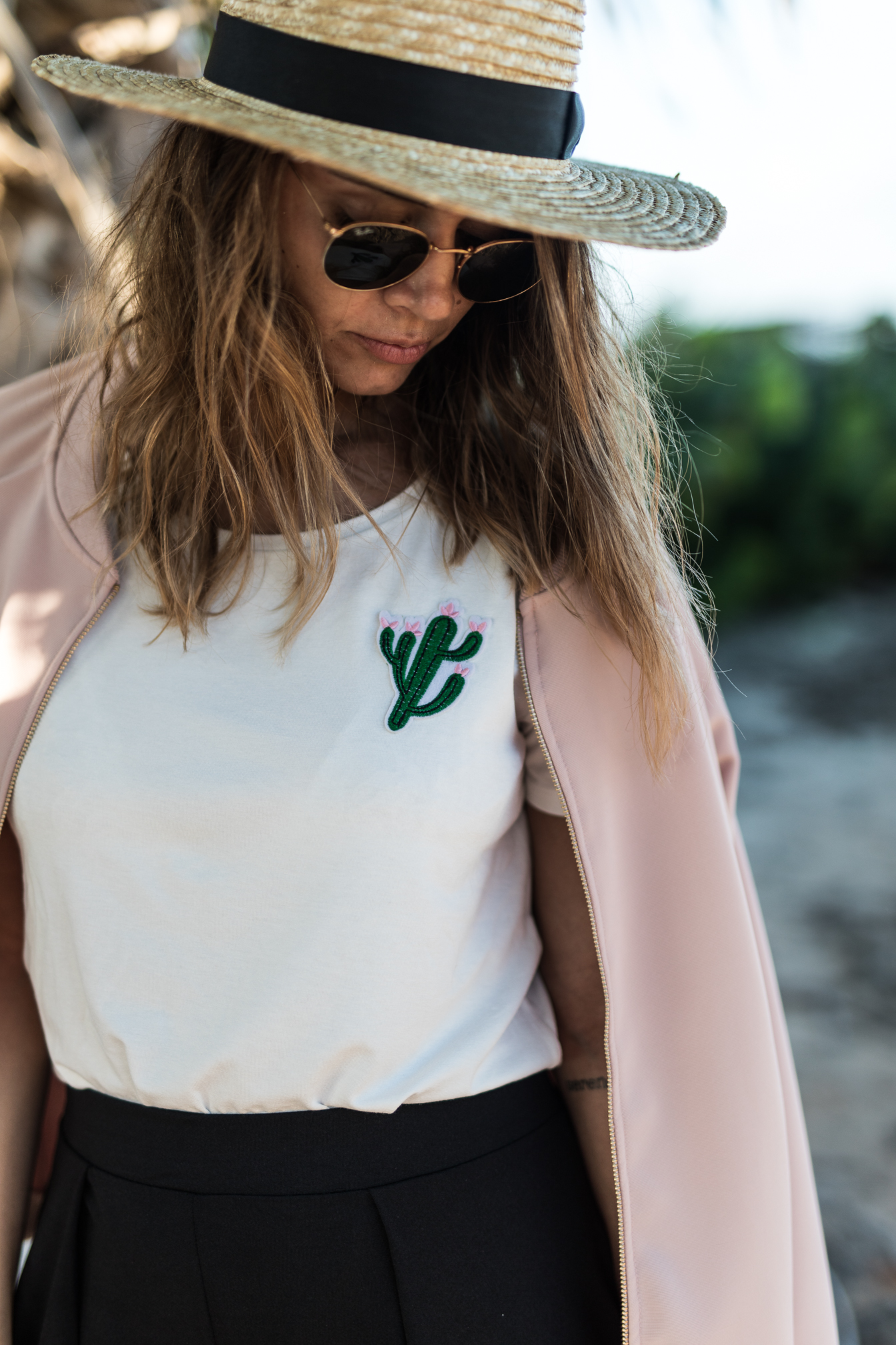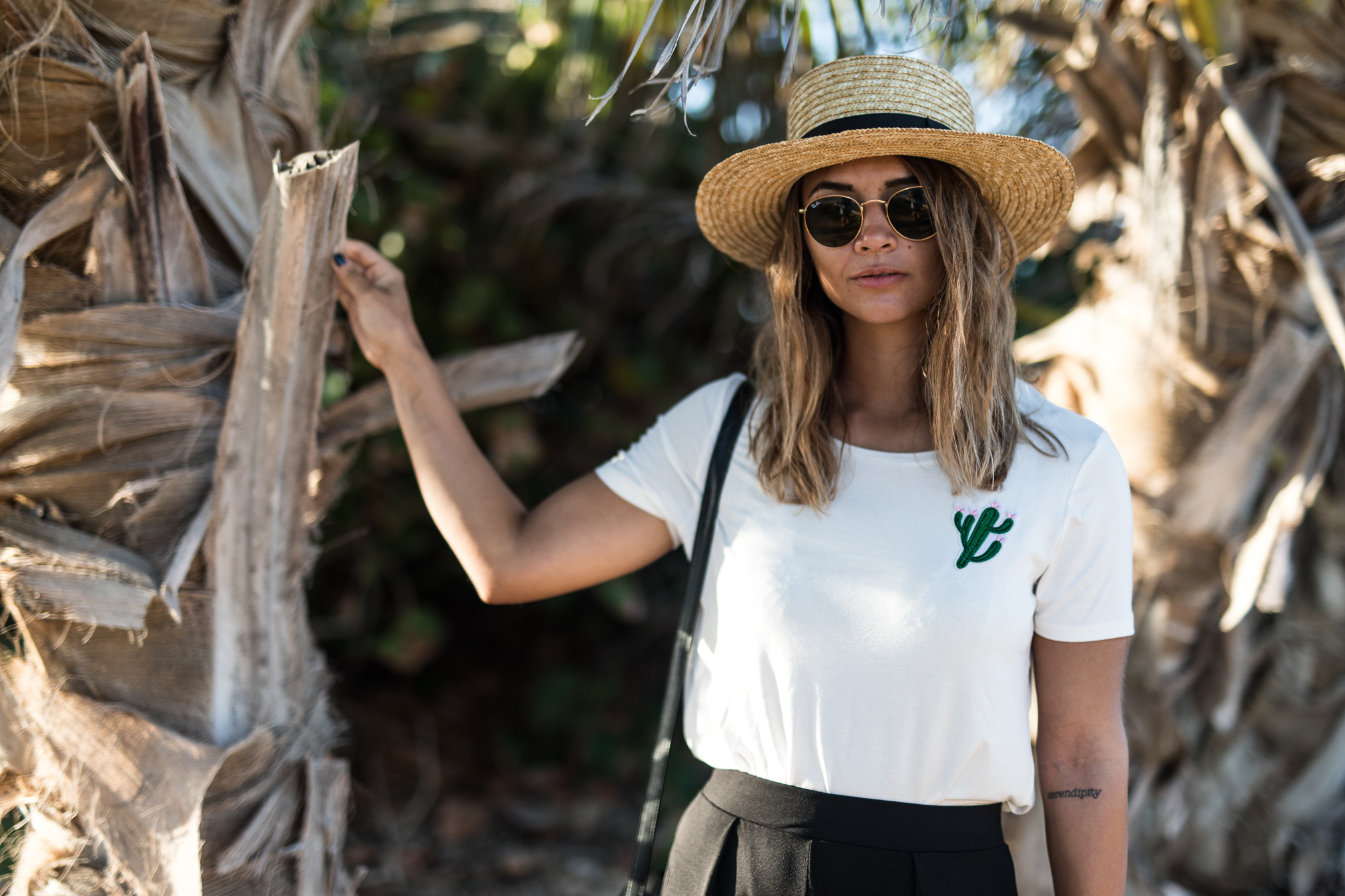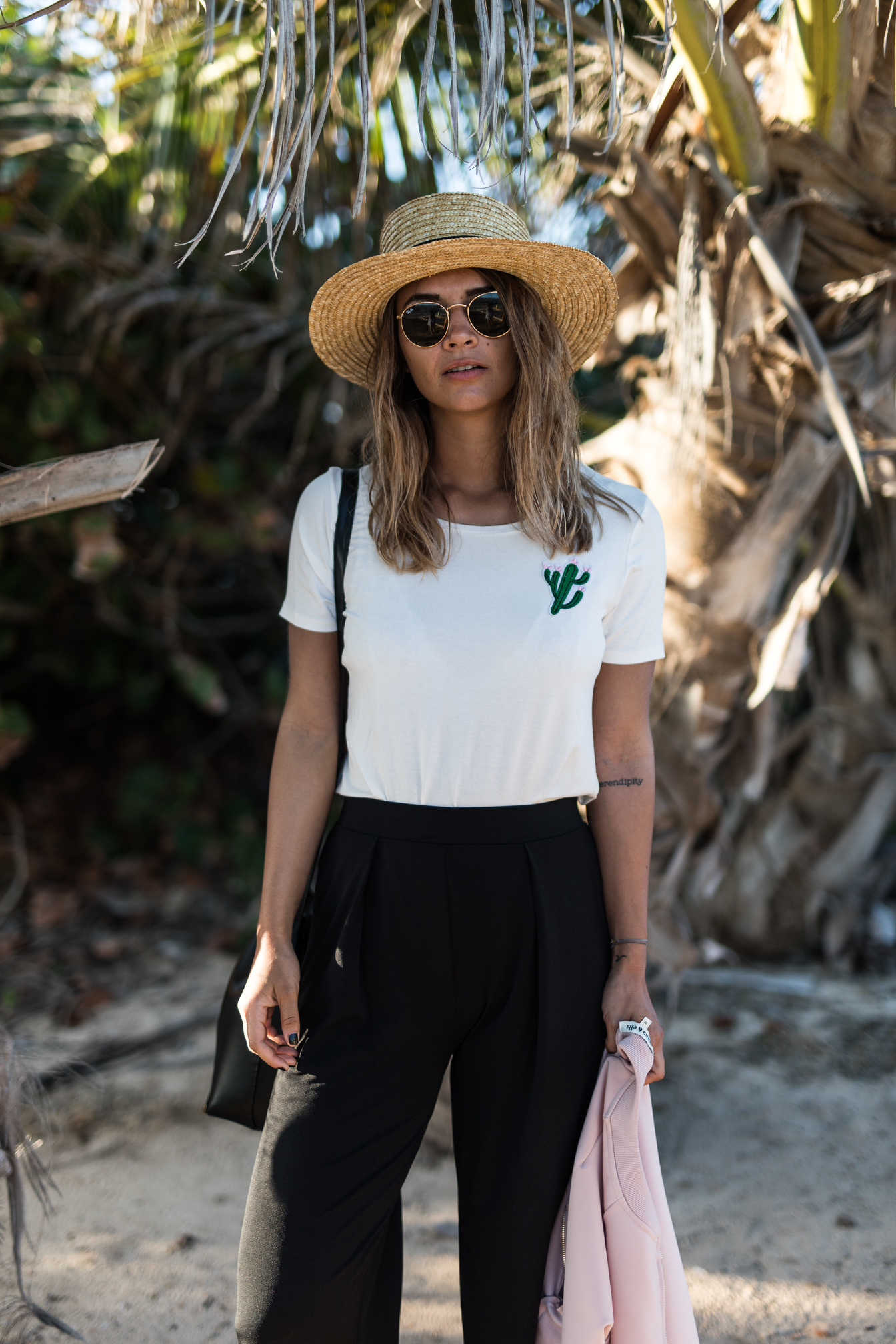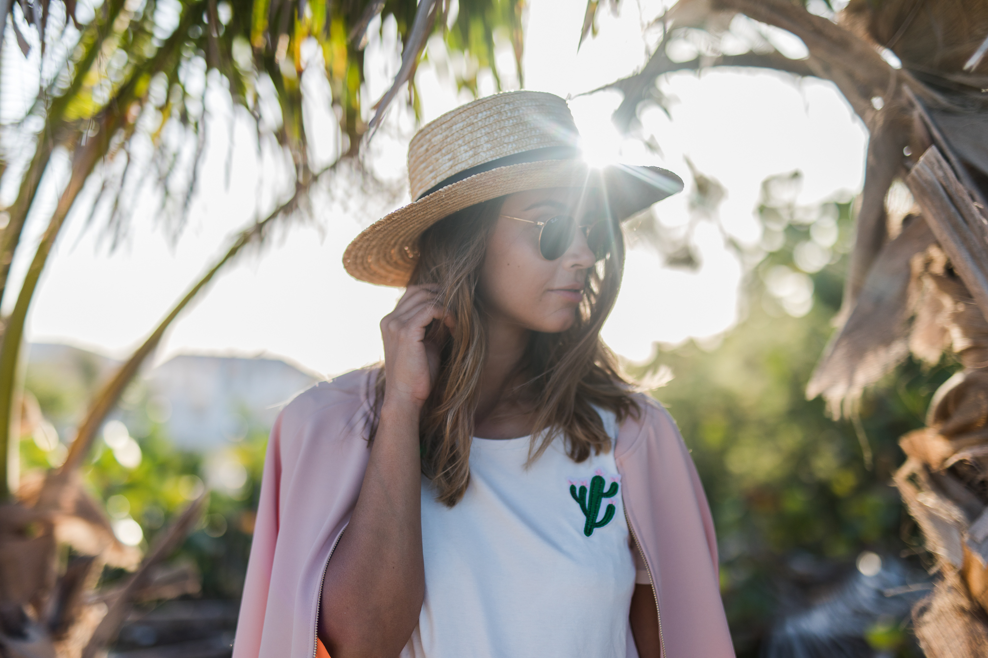 Weiter geht es mit tropischen Outfits von den Bahamas. Dieser Ort war einfach so fotogen und so haben wir gleich alles aus unserem Koffer geholt und unterschiedliche Looks geshootet. Die schönen Fotolocations musste ich einfach ausnutzen, denn wer weiß wann ich das nächste Mal die Möglichkeit habe unter Palmen zu shooten. Im Mittelpunkt meines heutigen Looks steht die Marke Anna & Ella, eine exklusive Eigenmarke von About You. Ich durfte mir vor meiner Reise ein paar Teile aus der aktuellen Kollektion aussuchen und die Wahl fiel mir gar nicht so leicht. Coole Shirts mit Prints, ein bisschen spitze hier, lockere Schnitte da – die Marke spricht mich total an und trifft genau meinen Geschmack. Deshalb freu ich mich euch heute meinen lässigen Anna & Ella Look präsentieren zu dürfen. Nach langem hin und her habe ich mich dann für luftige Culottes und ein T-shirt mit Kaktus Print entschieden – ganz simple und cool so wie ich es am liebsten habe. Um noch ein bisschen Farbe ins Spiel zu bringen, habe ich mir noch eine coole Bomberjacke in rosa über die Schulter geworfen. Ja und mein Boater und meine Ray-Ban Sonnebrille dürfen bei diesem Sommerlook natürlich auch auf keinen Fall fehlen.