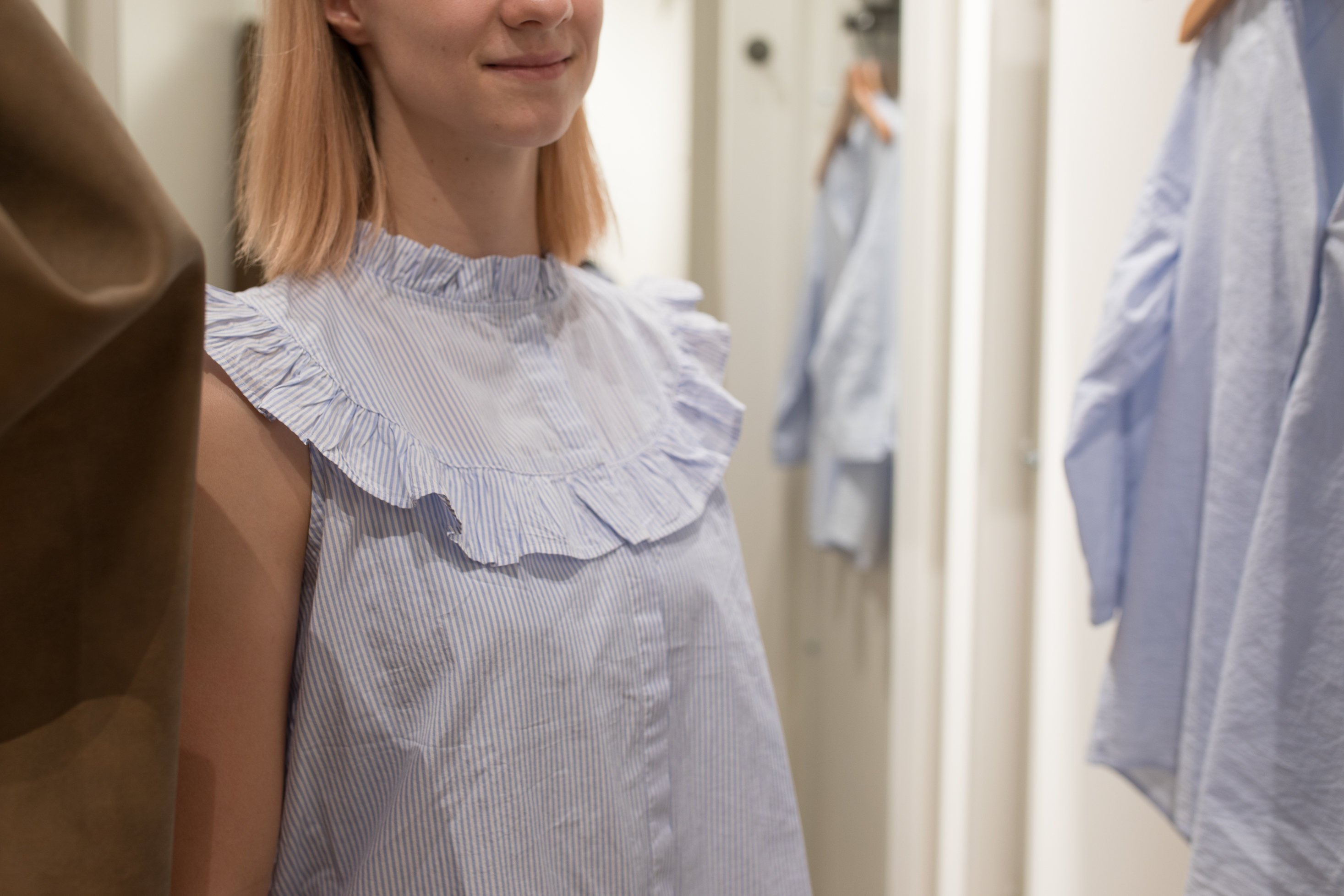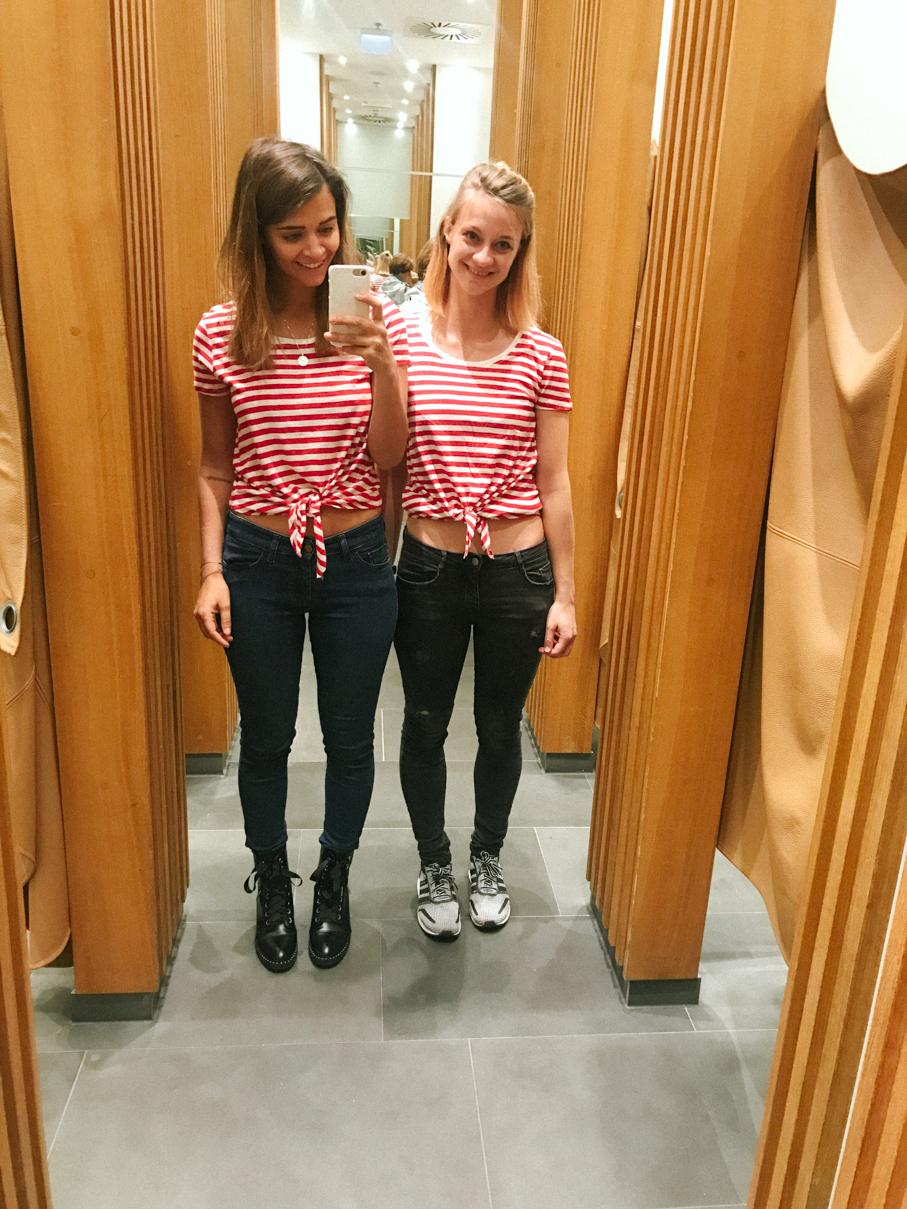 – Streifen Streifen, Streifen – hier waren wir uns sofort einige und haben uns sogar beide das gleiche Shirt gekauft, weil es einfach nur so nach Frühling geschrieen hat. Streifen gehen einfach immer und vor allem in rot/weiß sind sie diese Saison nicht aus unserem Kleiderschrank wegzudenken.