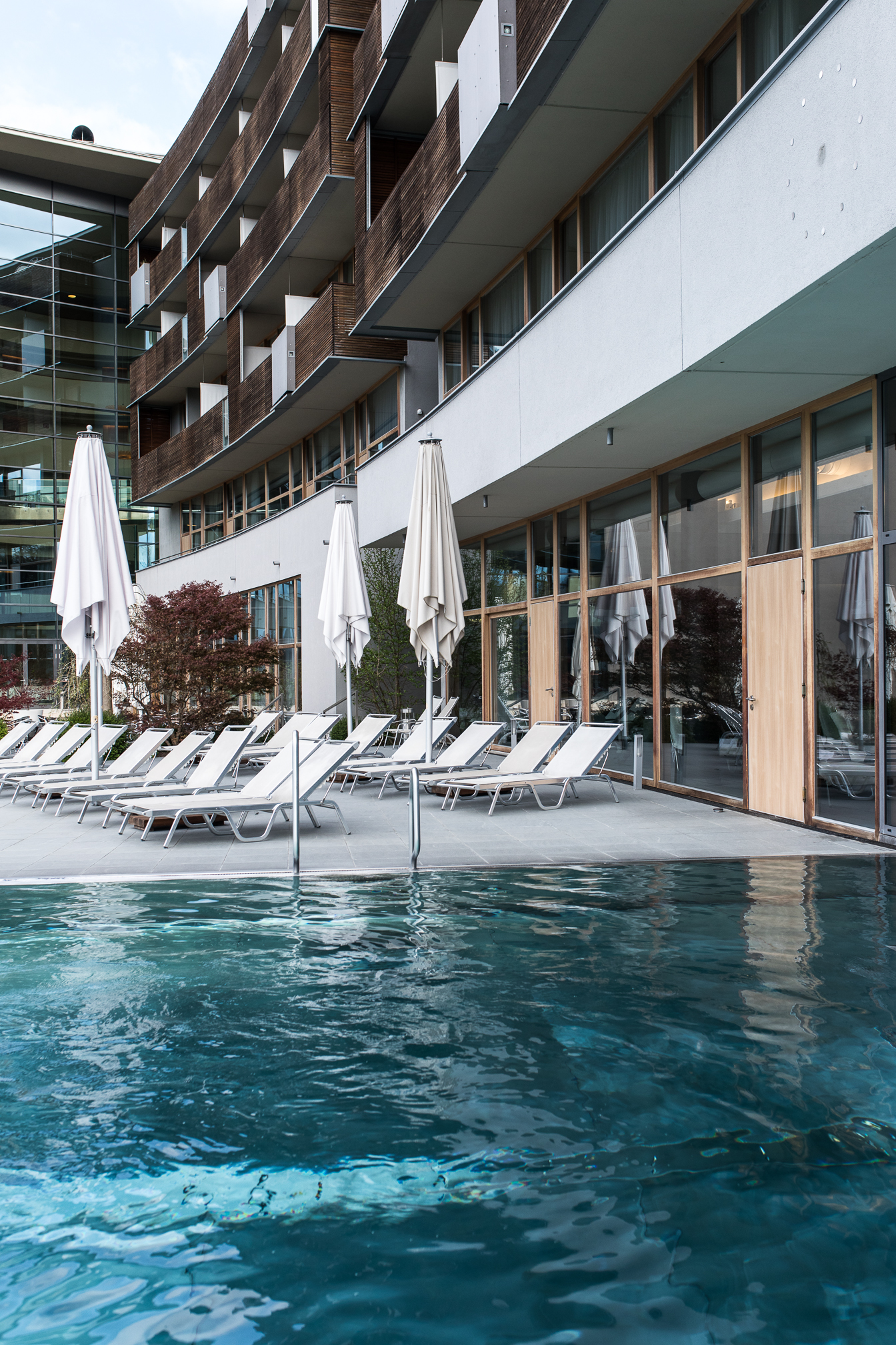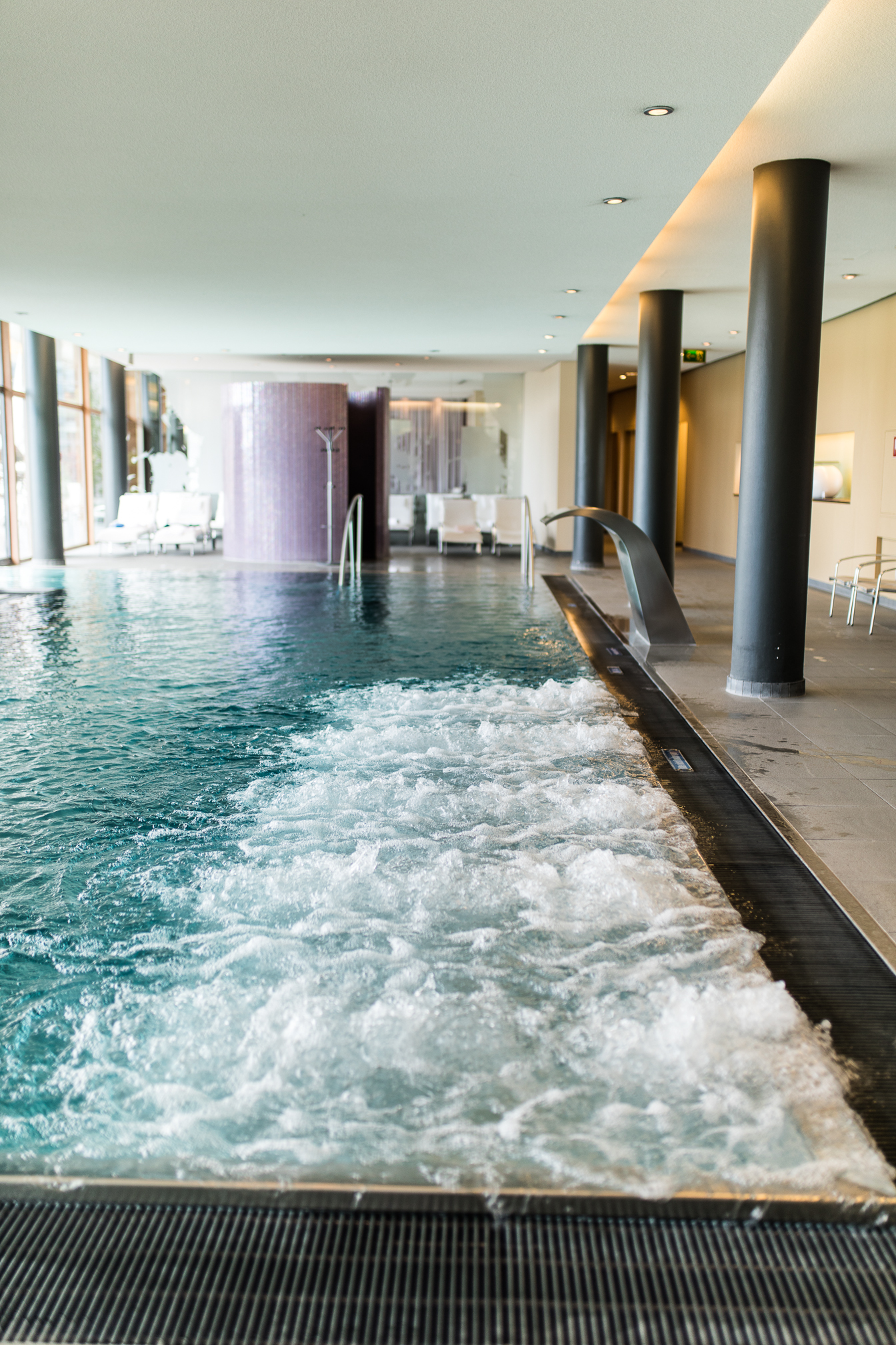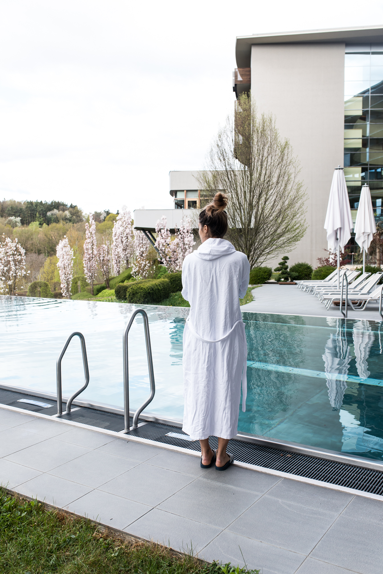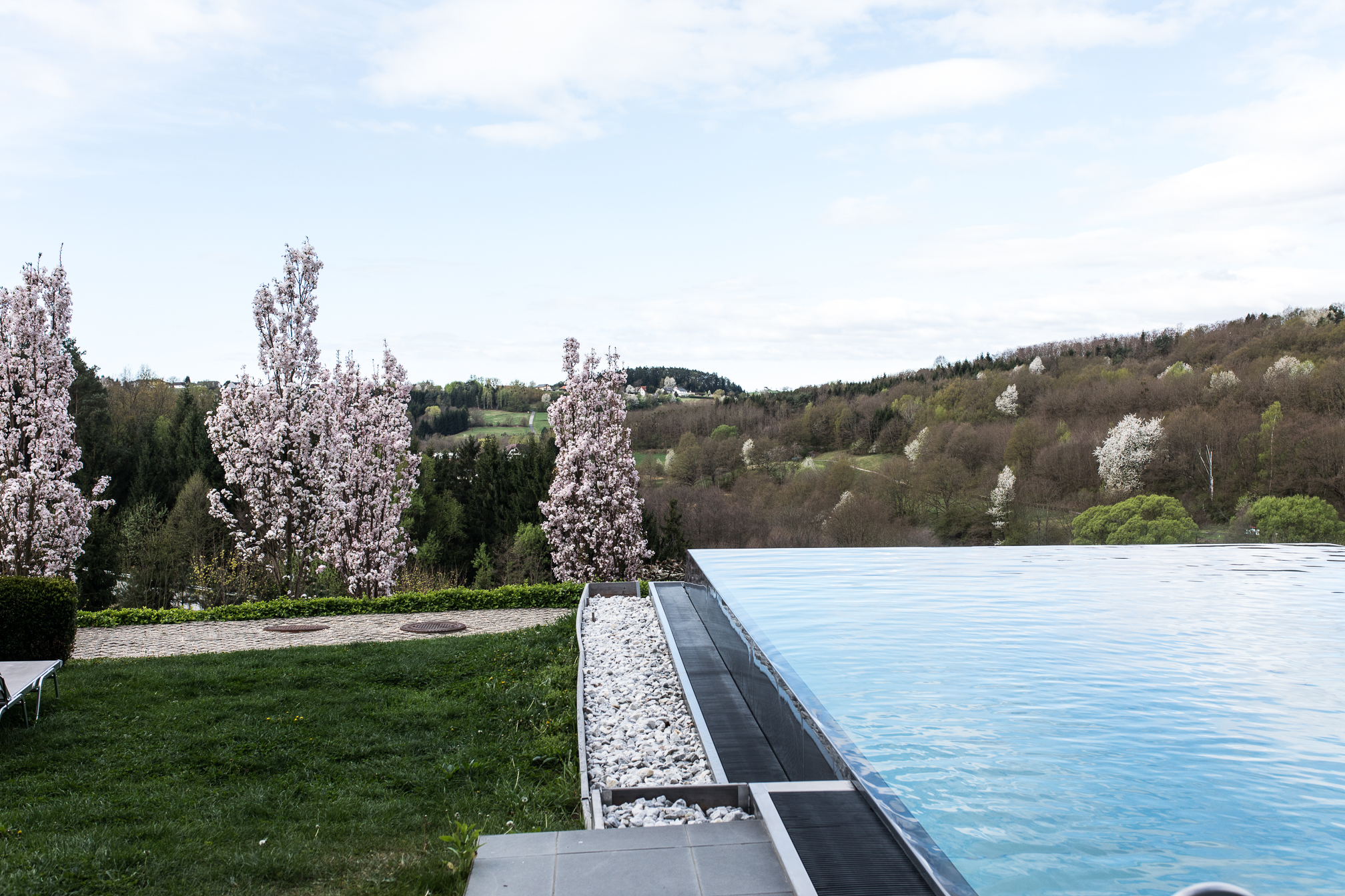Natürlich kann man sich aber auch im Hotel selber sportlich betätigen und das Fitnesscenter ist eigentlich sehr gut ausgestattet und man findet hier alles was man für das tägliche Workout benötigt. Nach einer kleinen Sporteinheit ging es aber gleich wieder auf die gemütliche Liege, denn wir waren ja da um zu entspannen. Der Spa Bereich ist relativ überschaubar aber echt schön und man kann sich dort auch wirklich gut zurückziehen. Am Samstag Nachmittag war es zwar ein bisschen voller, aber sonst hatten wir eigentlich nicht das Gefühl, als wären so viele Menschen da. Man hat außerdem die Möglichkeit auch die öffentliche Therme zu nutzen oder sich im Saunabereich zurückzuziehen und so verteilt es sich glaub ich ganz gut. Sehr toll fand ich den Pool und vor allem die Aussicht. Einfach mal ein bisschen Wasser relaxen und die Natur inkl. Kirschblütenbäume genießen.