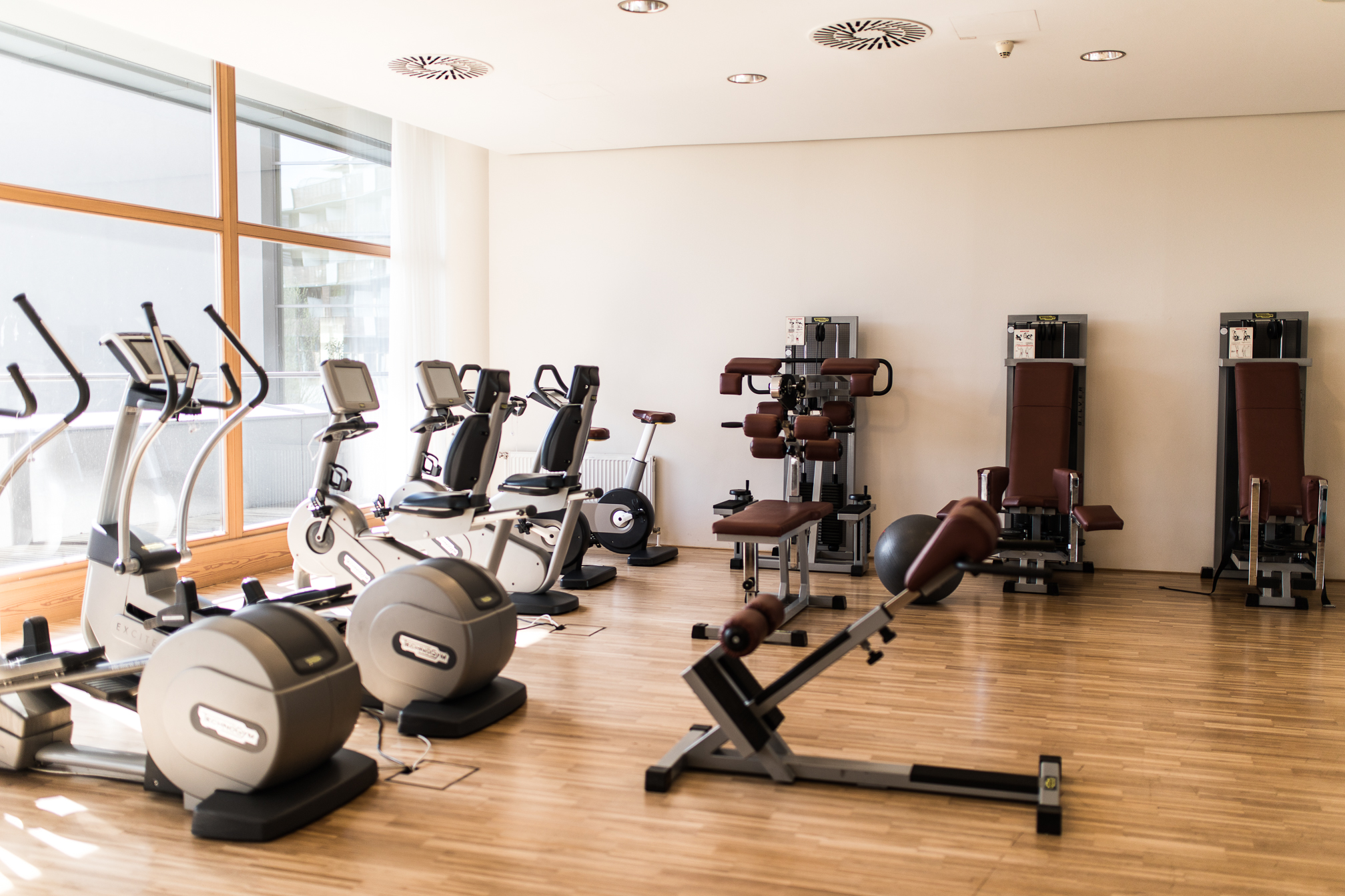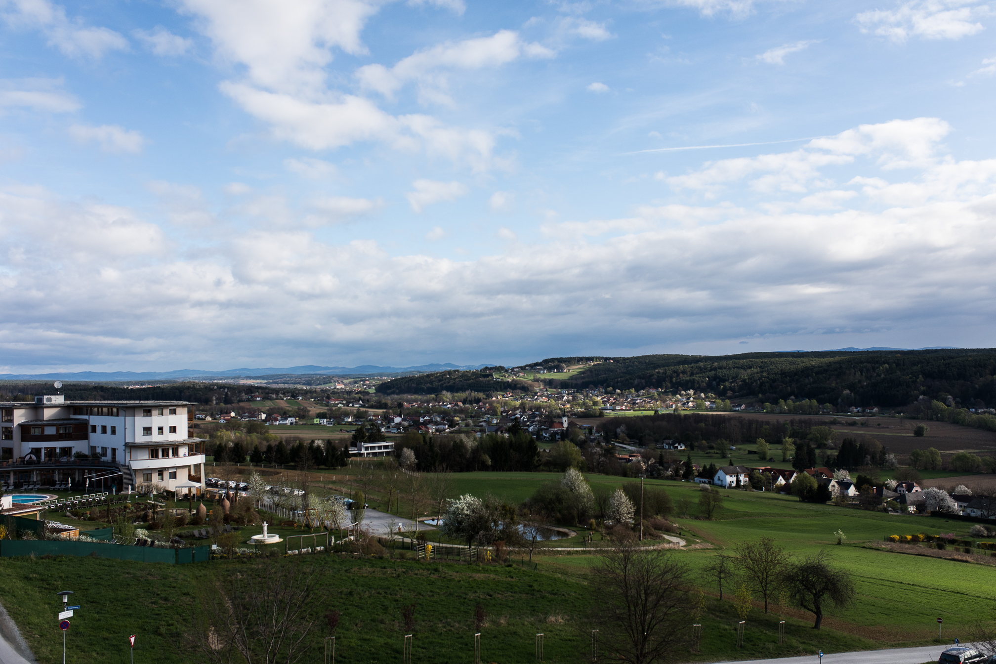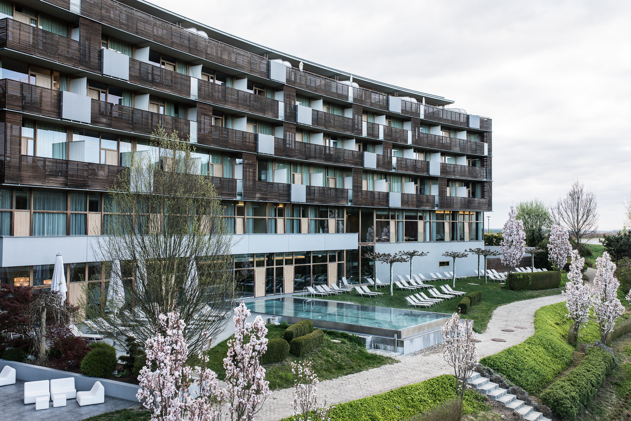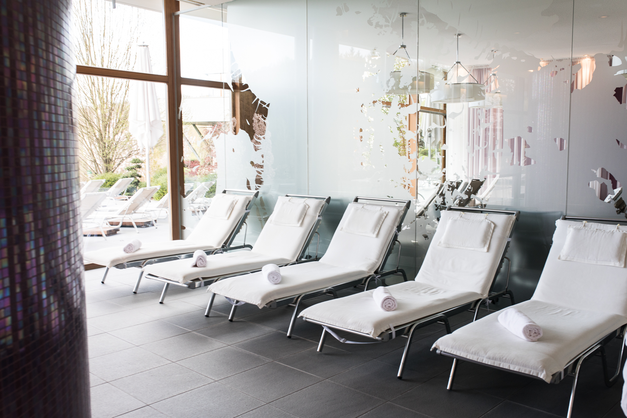 Natürlich kann man sich aber auch im Hotel selber sportlich betätigen und das Fitnesscenter ist eigentlich sehr gut ausgestattet und man findet hier alles was man für das tägliche Workout benötigt. Nach einer kleinen Sporteinheit ging es aber gleich wieder auf die gemütliche Liege, denn wir waren ja da um zu entspannen. Der Spa Bereich ist relativ überschaubar aber echt schön und man kann sich dort auch wirklich gut zurückziehen. Am Samstag Nachmittag war es zwar ein bisschen voller, aber sonst hatten wir eigentlich nicht das Gefühl, als wären so viele Menschen da. Man hat außerdem die Möglichkeit auch die öffentliche Therme zu nutzen oder sich im Saunabereich zurückzuziehen und so verteilt es sich glaub ich ganz gut. Sehr toll fand ich den Pool und vor allem die Aussicht. Einfach mal ein bisschen Wasser relaxen und die Natur inkl. Kirschblütenbäume genießen.