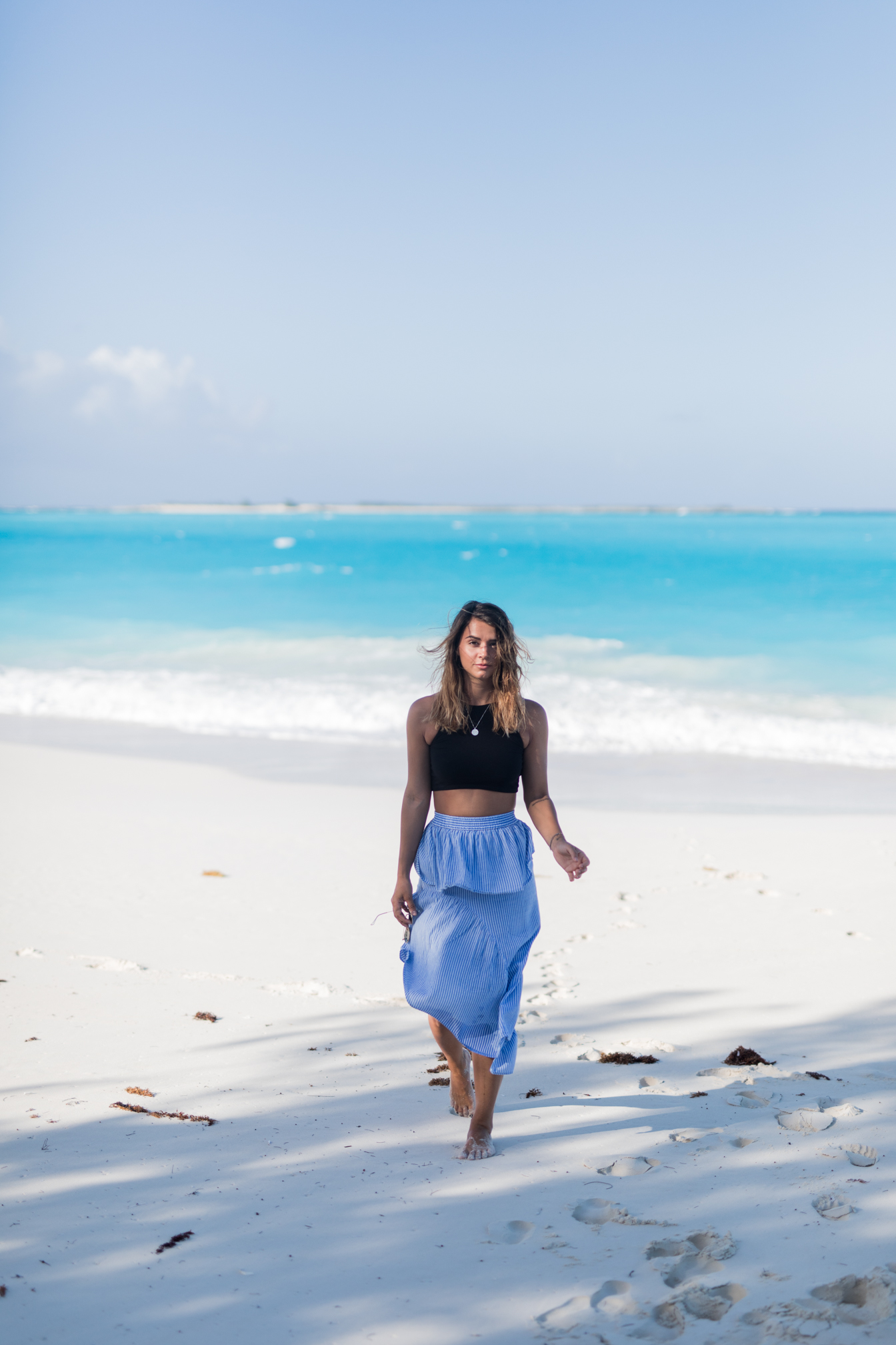 Der Strand und das Meer haben irgendwie eine ganz besondere Wirkung auf mich. Immer wenn ich das erste Mal meine Zehen in den Sand stecke, überkommt mich ein Gefühl der Freiheit. Ich fühle mich am Meer einfach geborgen, kann hier am besten entspannen. Ich liebe es den Wellen zuzuhören und die Sonne auf meiner Haut zu spüren – hier bin ich einfach der glücklichste Mensch und ich freue mich wie ein kleines Kind wenn es ans Meer geht. Klingt vielleicht kitschig, ist aber so. Oft schnappe ich mir mein Handy, drehe meine Lieblingsplayliste auf und spaziere einfach über den Strand – So kann man einfach am besten alles rundum einen vergessen. Ich war immer schon ein Sommermensch und eine richtige Wasserratte – wenn ich von einer Reise zurückkehre werden gleich wieder die Tage gezählt bises zurück ans Wasser geht. Auch meine Looks sind eher ungezwungen und locker, wenn ich am Meer bin. Am liebsten greife ich zu Crop Tops und luftigen Röcken – es gibt nichts schöneres als wenn die Kleidung im Wind weht.
