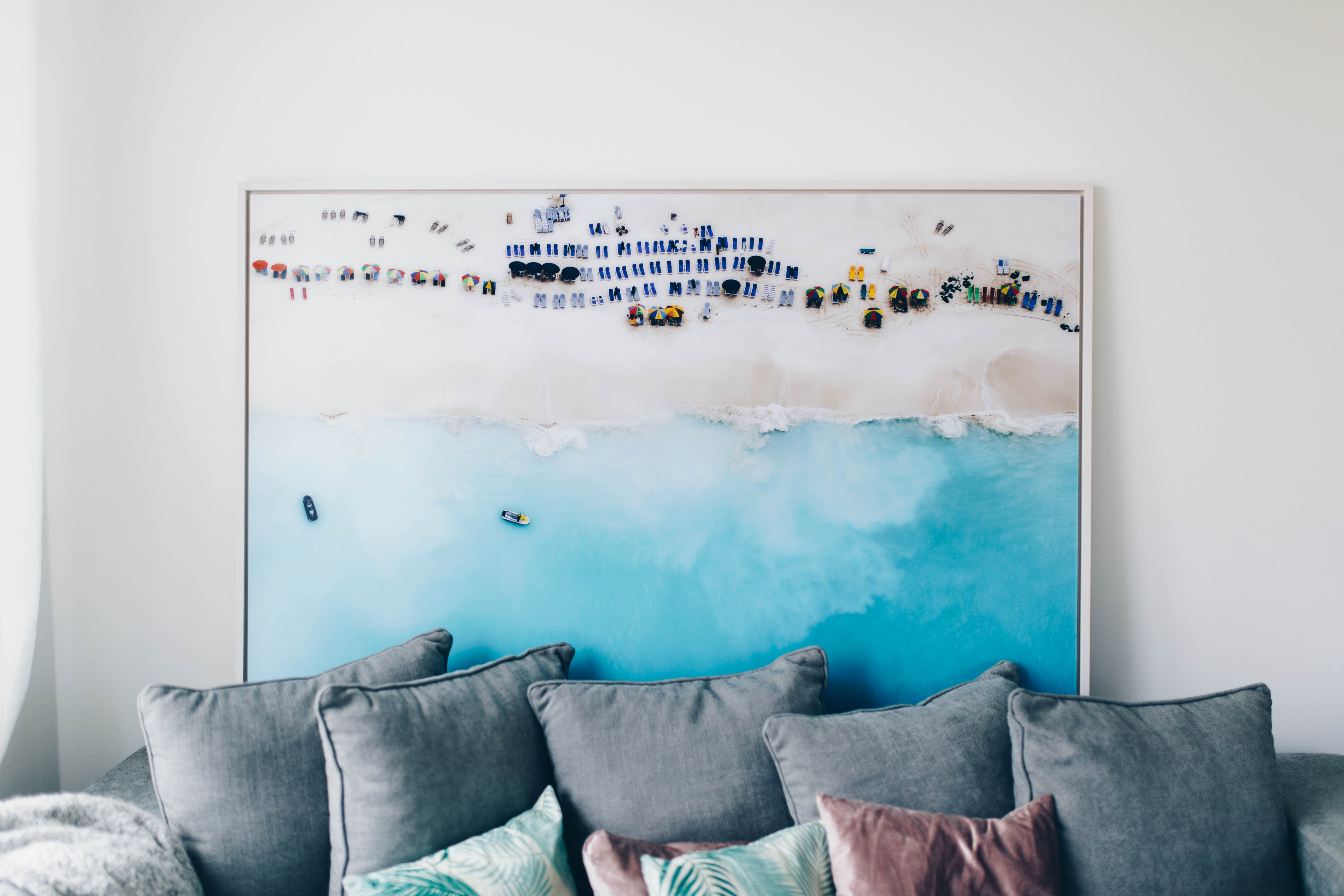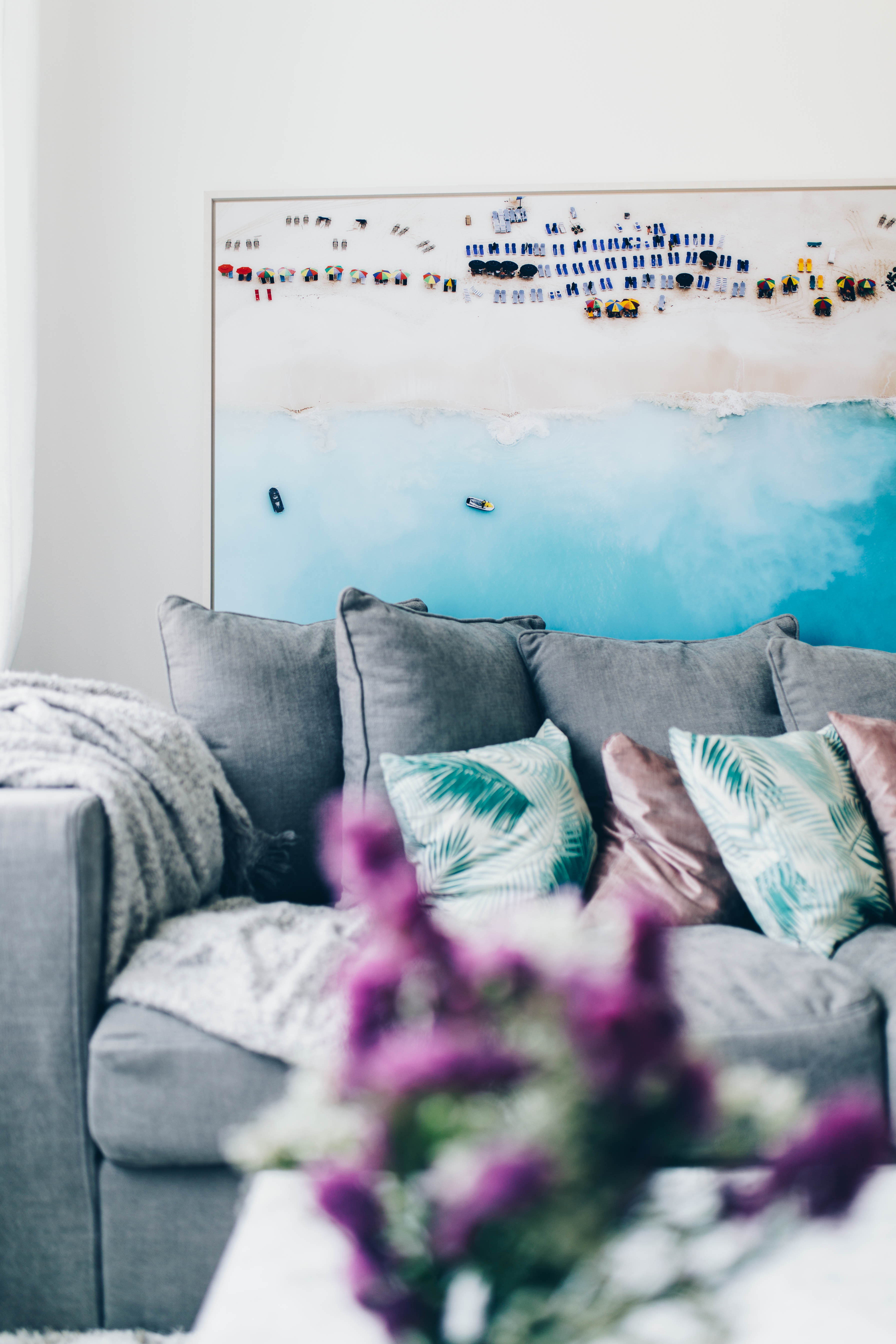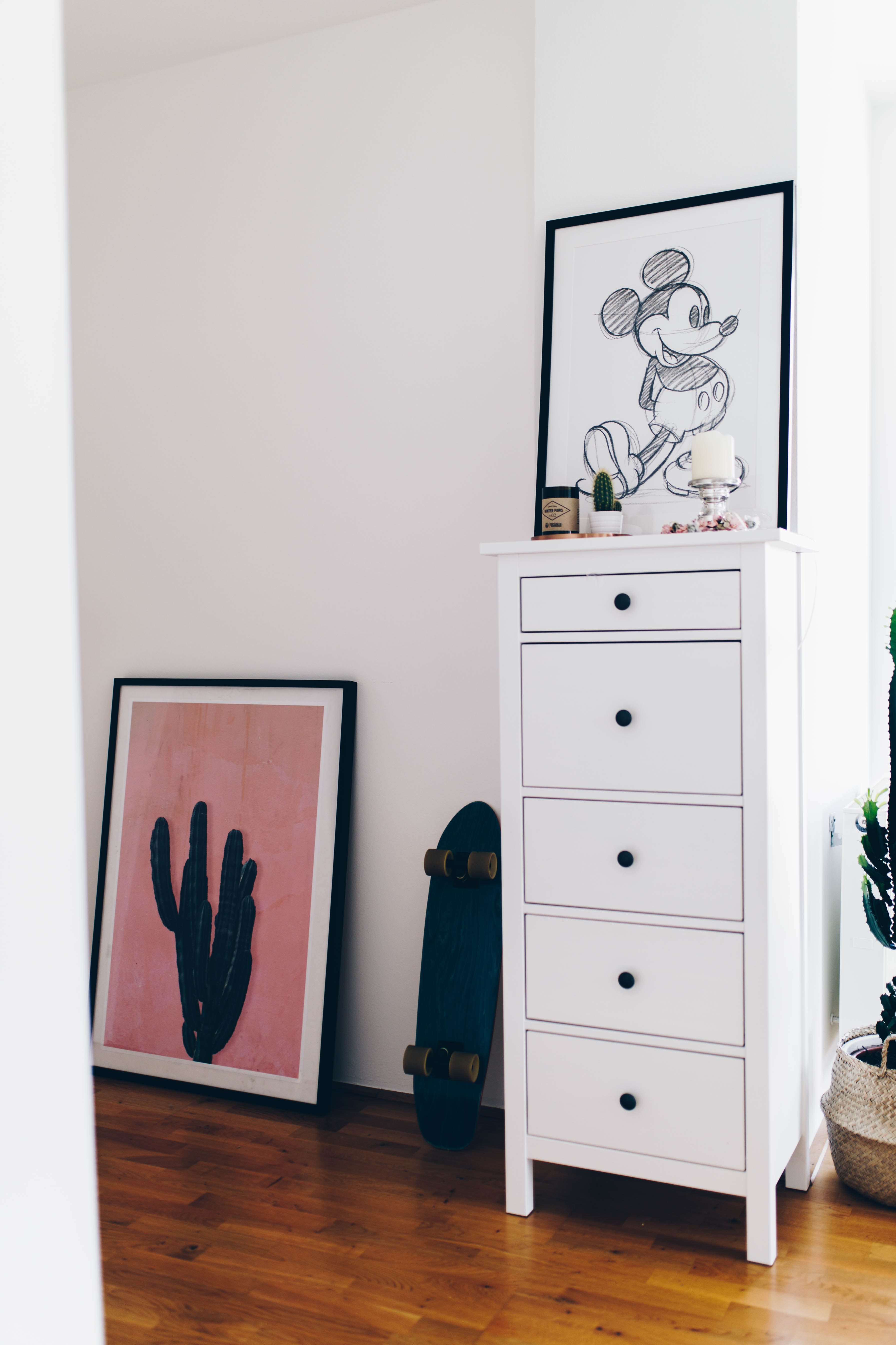 Couch – Amaris Elements // Couchtisch – WestwingNOW / Regal – Home24 (ähnliches HIER) / Strandbild – Lumas Gallery // Kommode – Mycs // Pflanzen – Ikea // Teppich – WestwingNOW // Micky Mouse Bild – WestwingNow // weiße Kommode – Ikea //Bilder – Desenio // Decke – Mömax // rosa Kissen – H&M // Palmenkissen – Urban Outfitters // Affenlampe – WestwingNow / Fernseher – Sony // Box – Marshall // rosé Kerze – Tom Dixon