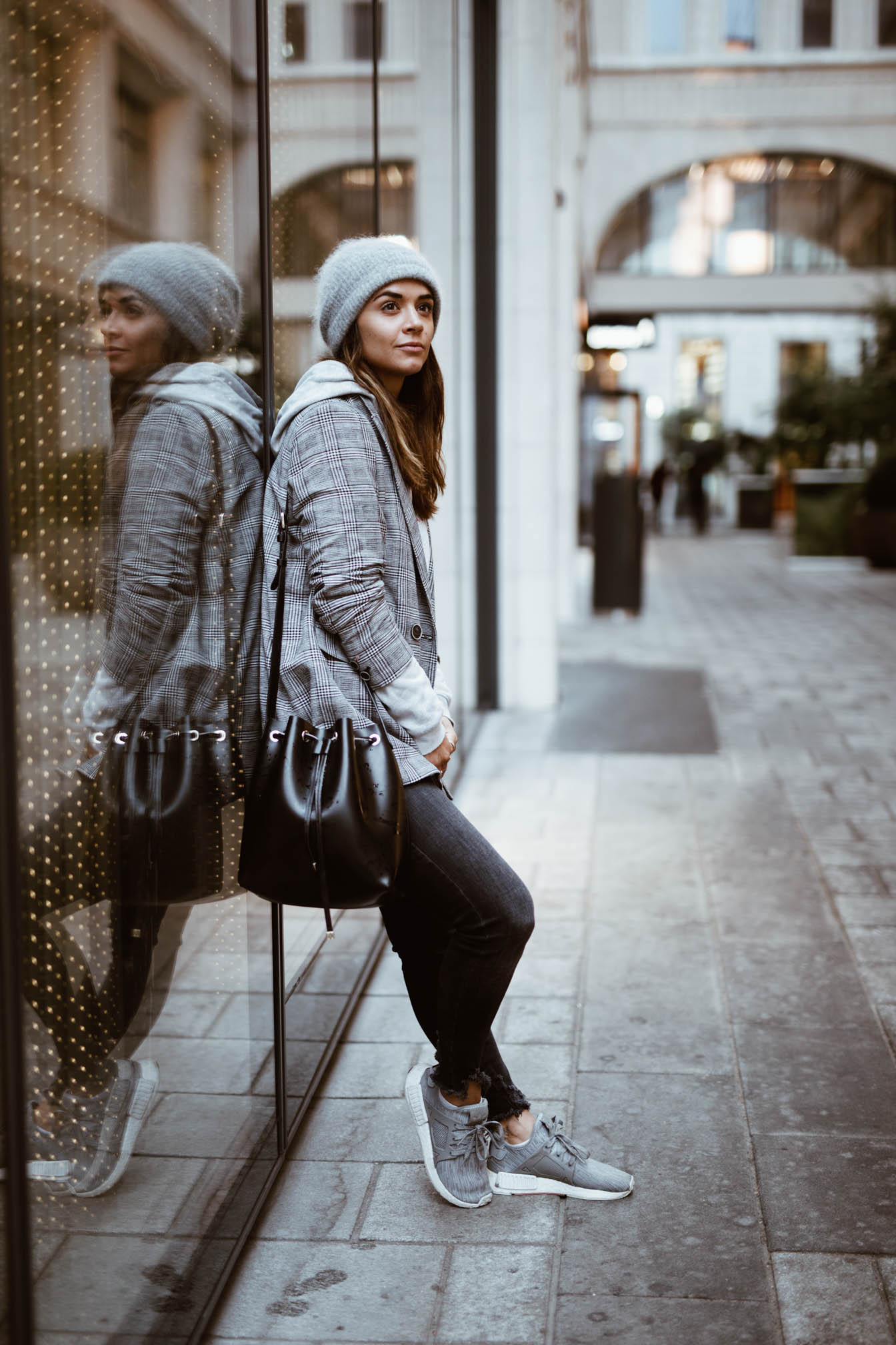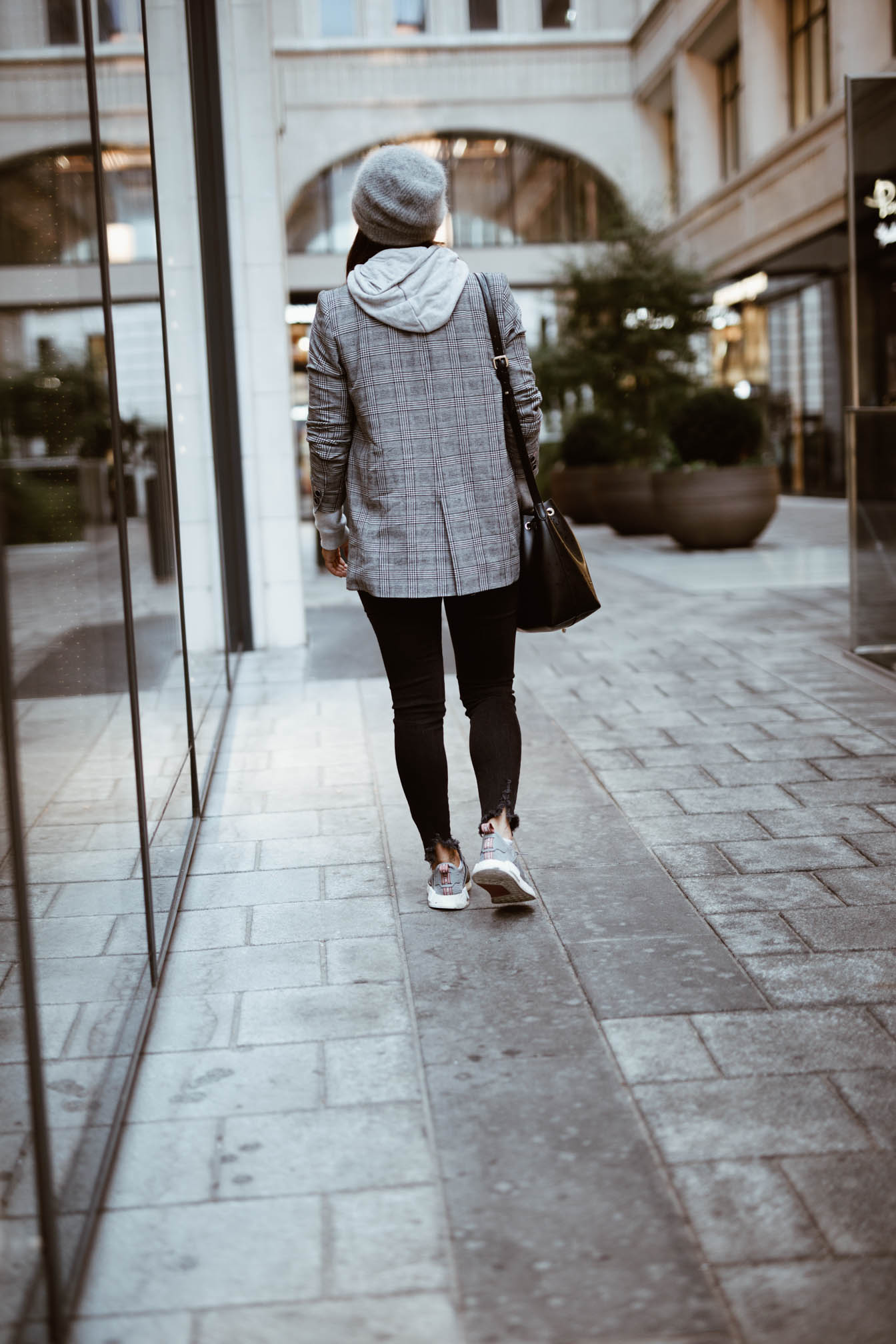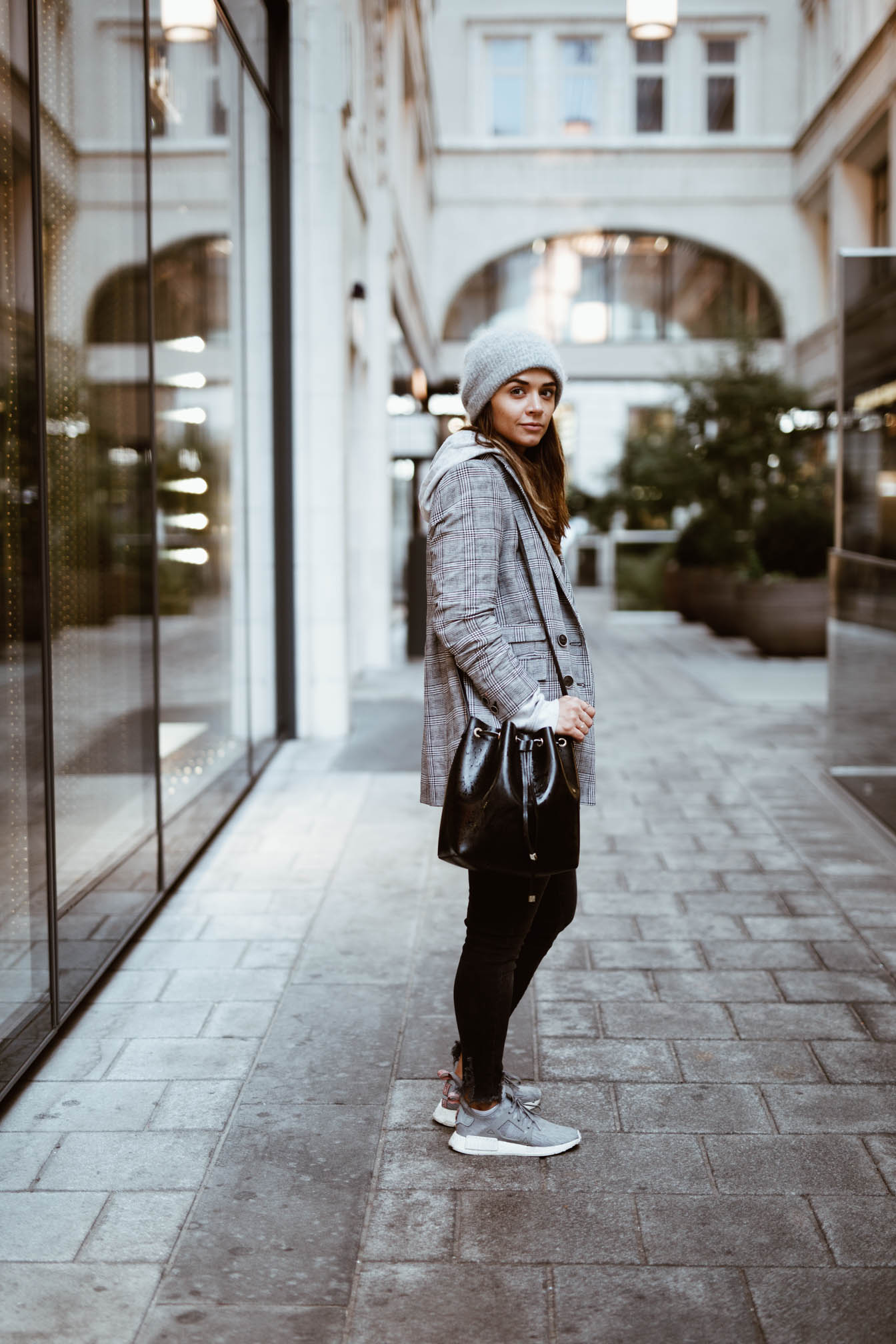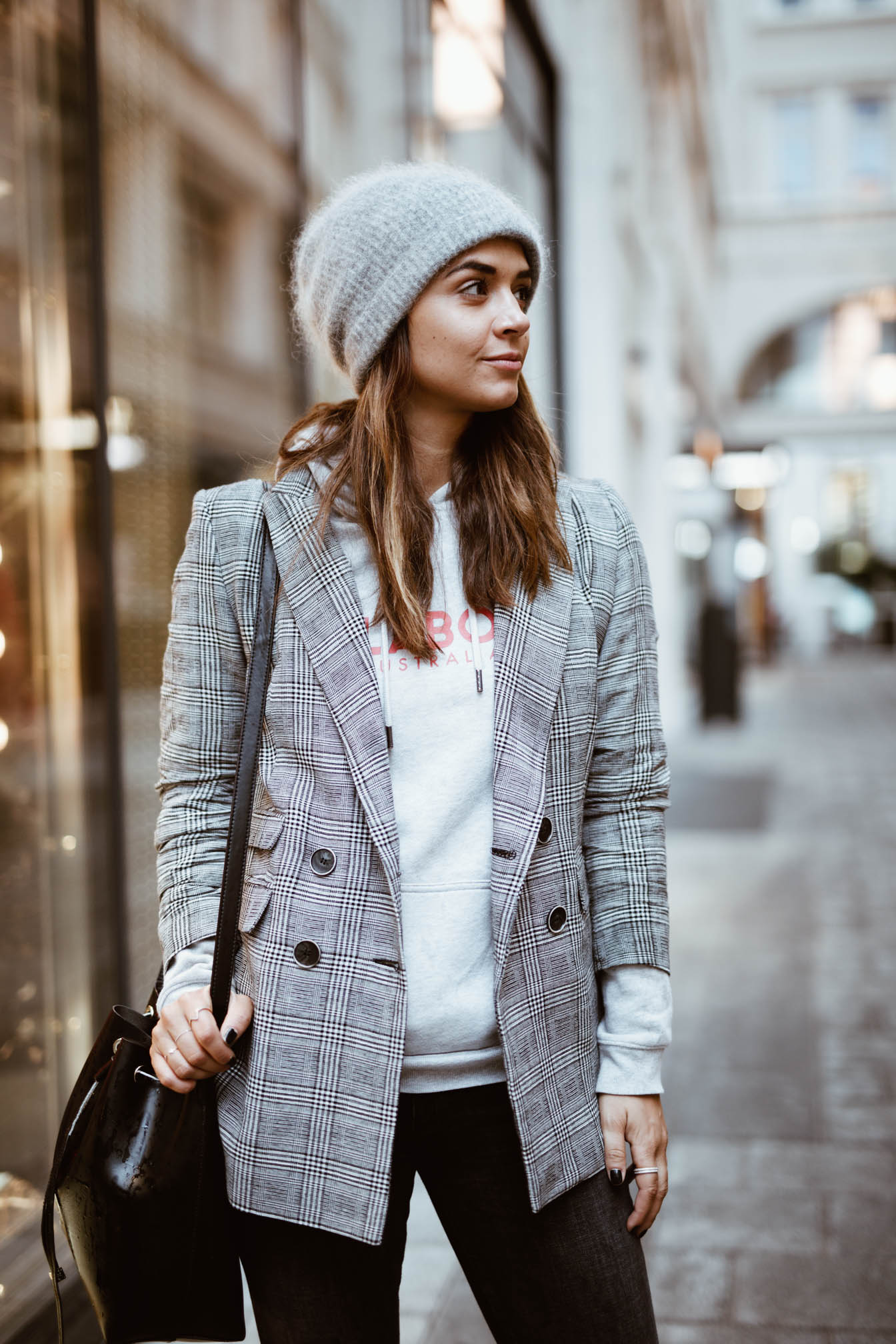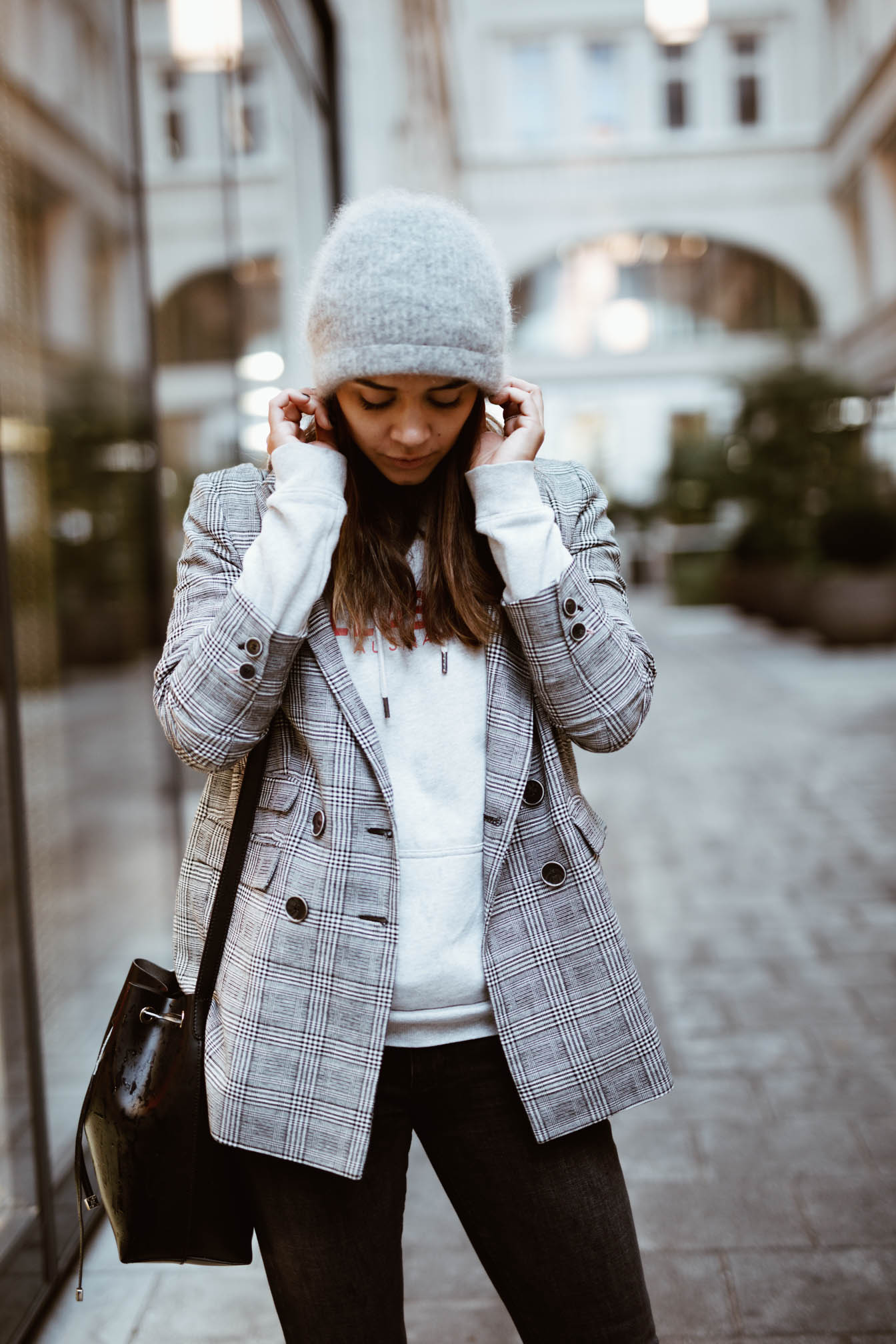 Zwischen den ganzen sommerlichen Looks die hier noch folgen werden, dachte ich mir wird es Zeit für ein Outfit das auch zur Jahreszeit passt. Momentan ist es ja doch eher sehr wechselhaft hier in Wien und ich bin teilweise wirklich überfordert und weiß nicht was ich anziehen soll. Erst ist es kalt und regnerisch und im nächsten Moment kommt die Sonne raus und die Grade steigen. Das soll sich einer noch auskennen. Als es vor ein paar Tagen so richtig grausig war in Wien wurde auch gleich wieder meine Mütze ausgepackt – Irgendwas Gutes muss ja dieses Sauwetter haben. Neben meinem absoluten Lieblingshoodie habe ich auch gleich meinen neuen Blazer, den ich mir vor kurzem zugelegt habe ausgeführt. In dieser Saison kommt man um das Hahnentrittmuster einfach nicht vorbei und nachdem im Frühling eine Hose in diesem Muster bei mir eingezogen ist, musste jetzt einfach ein Blazer her. Man sieht diese karierten Teile zwar momentan bei wirklich jedem Blogger, aber wenns gefällt wieso nicht, ist ja auch ein richtig cooler Trend.