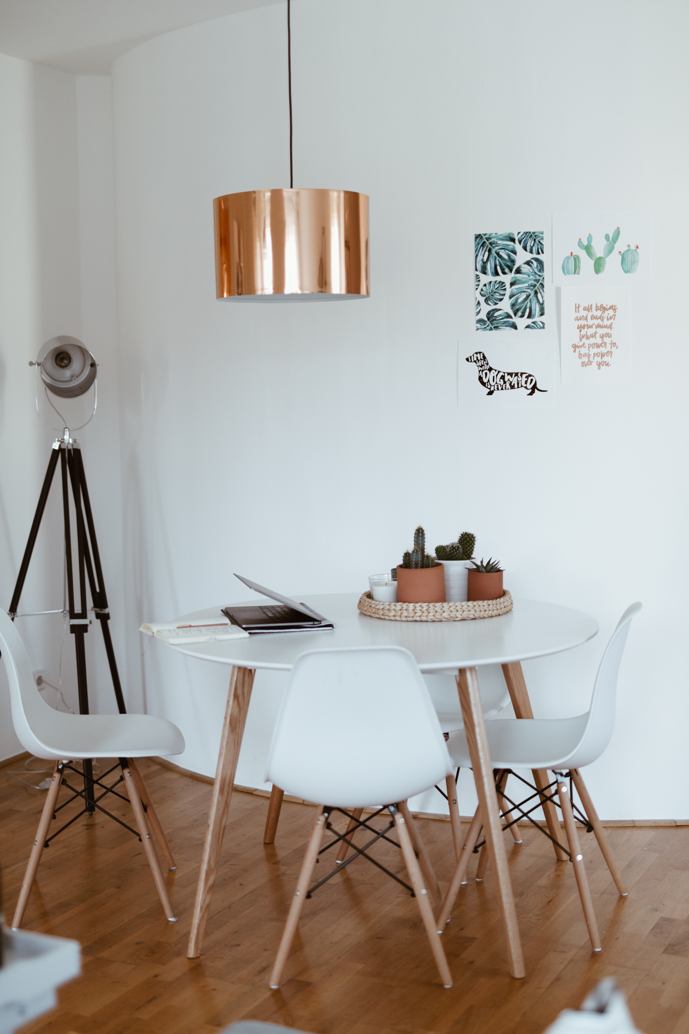 Seit Mai wohne ich jetzt schon in meiner neuen Wohnung und ich bin richtig stolz auf mich, dass ich alles so schnell eingerichtet habe. Mittlerweile ist alles eigentlich so gut wie fertig und ich kann euch nun endlich den Rest meiner Vier Wände präsentieren. Ich bin ja eigentlich ein ziemlicher Chaot und auch bei meiner Wohnung hab ich mal hier mal da etwas bestellt und ich bin selber verwundert, dass alles so gut zusammenpasst und stimmig ist. Ich habe eigentlich versucht alles so clean wie möglich zu halten, wollte aber mit ein paar kleinen Farbklecksen und Elementen ein bisschen Beach Feeling nach Wien bringen. Im Wohnzimmer, das ich euch hier bereits gezeigt habe ist es mir denk ich mit den Pflanzen, den Palmenkissen und dem schönen Bild ganz gut gelungen. Beim Essbereich und in der Küche habe ich mit Kakteen und Bastelementen gearbeitet und ich bin super Happy mit dem Ergebnis. Jetzt muss ich mich nur wieder öfters in die Küche stellen, damit dieser Bereich auch genutzt wird. Die Eames Look a Likes habe ich übrigens vor einigen Monaten bei der lieben Vicky entdeckt und musste sie einfach bestellen, denn für 4 Stühle 90 Euro (mittlerweile kosten sie sogar nur 60 euro) ist echt unschlagbar. Das Zusammenbauen war zwar etwas mühsam, aber sie halten und ich bin für den Preis echt zufrieden damit.