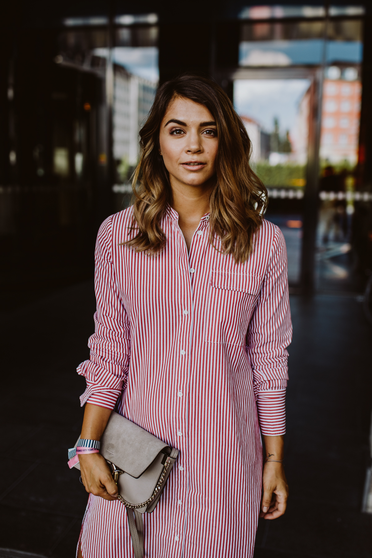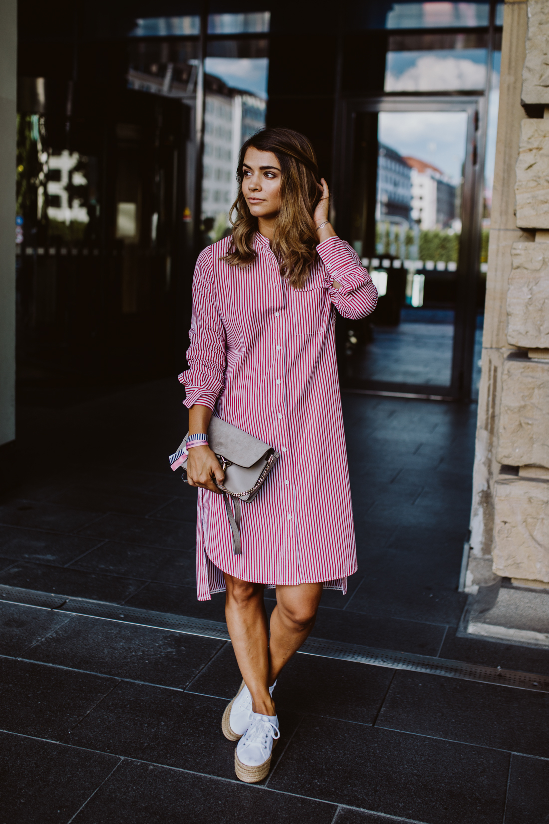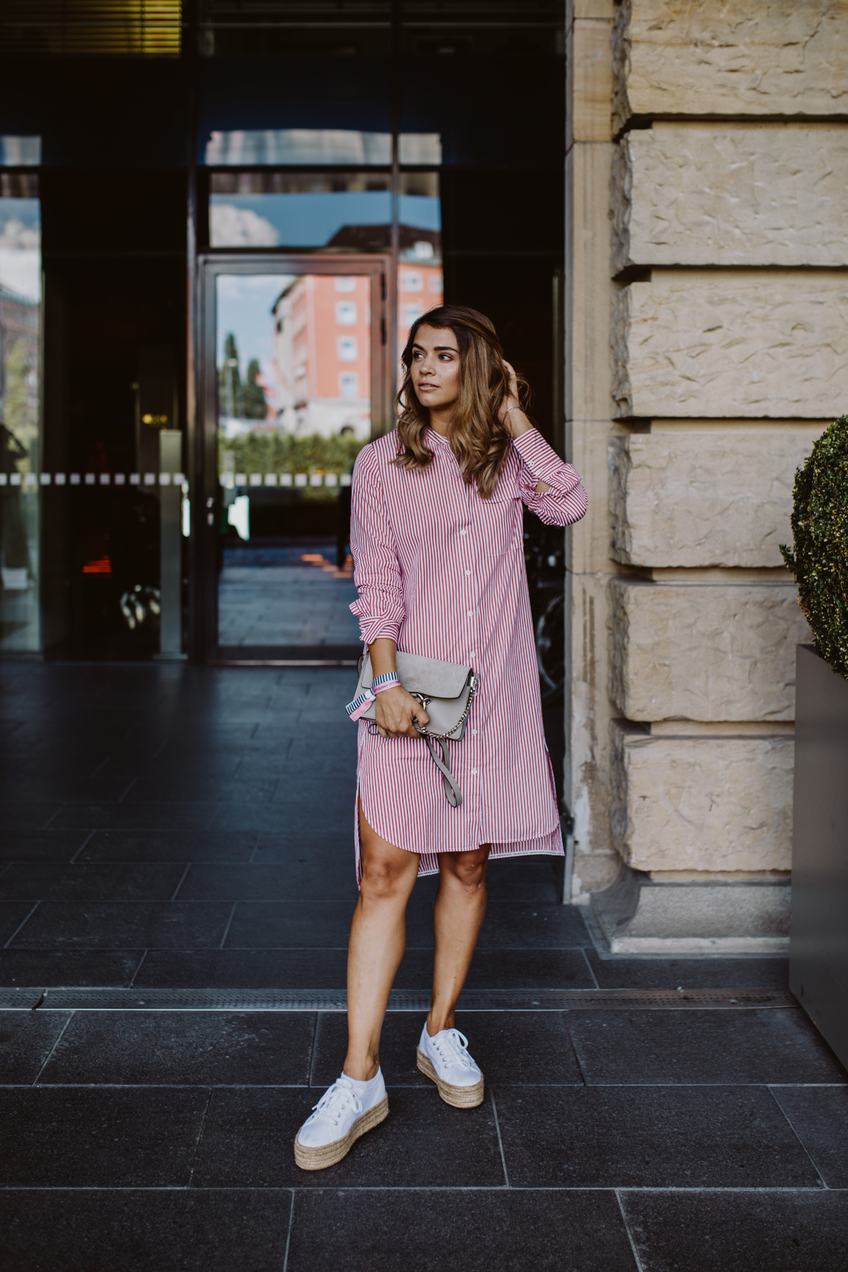 Vor einigen Wochen war ich zur 50 Jahre Marc O’Polo Feier eingeladen und bin gemeinsam mit Sophie, Niklas, Nina und Mani nach München gefahren, um an diesem ganz besonderen Event dabei sein zu können. Im Hotel hat eine Styling Lounge auf uns gewartet und wir durften uns aus den neuen Teilen ein Outfit für den Abend auswählen. Wie ihr vielleicht, wisst bin ich nicht gerade ein Mensch der schnell und einfach Entscheidungen trifft und das kann dann schonmal ein bisschen Zeit in Anspruch nehmen. Natürlich hatten wir aber nicht wirklich viel Zeit und so musste die Wahl schnell getroffen werden. Lange habe ich hin und her überlegt und mich dann schlussendlich für dieses coole Blusenkleid entschieden, das einfach ganz genau meinen Geschmack trifft. Ich liebe solche Teile, weil man sich nicht großartig überlegen muss, was man noch dazu kombinieren soll – Es ist so alleine schon ein richtiger Eyecatcher und man braucht nicht wirklich mehr, damit das Outfit etwas hermacht. Eine kleine Tasche, coole Plateau Schuhe ein lässiges Make-Up und fertig ist der Look für den Abend. Bevor es zur Party ging hat der liebe Patrick schnell noch ein paar Fotos geschossen und unsere Outfits festgehalten. Danach hieß es ab nach Rosenheim ins Marc O’Polo Headquarter, wo neben einer coolen Fashionshow auch ein exklusives Robbie Williams Konzert auf uns warteten.