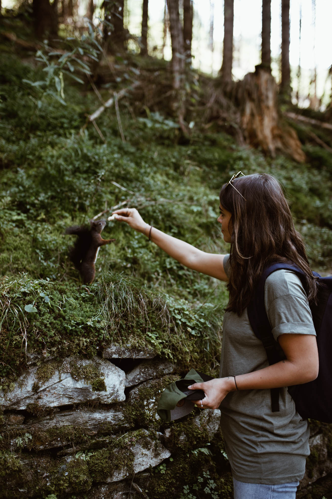 Nachdem wir uns die Bäuche vollgeschlagen hatten, ging es zu Fuß Richtung Bad Gastein – ein kleiner Verdauungsspaziergang war bitter nötig. Wir sind also von der Rudolfshöhe über die Kaiser Wilhelm Promenade gegangen und haben am Weg einige süße Freunde getroffen. Auf dieser Promenade wimmelt es nämlich nur so von Eichkatzerl oder Eichhörnchen, wie man in Deutschland so schön sagt. Wenn man Nüsse dabei hat, kommen sie auch richtig nah und man kann sie aus der Hand füttern. Ich finde das ja immer ein ganz tolles Erlebnis, wenn man solchen Tieren so nah sein kann.