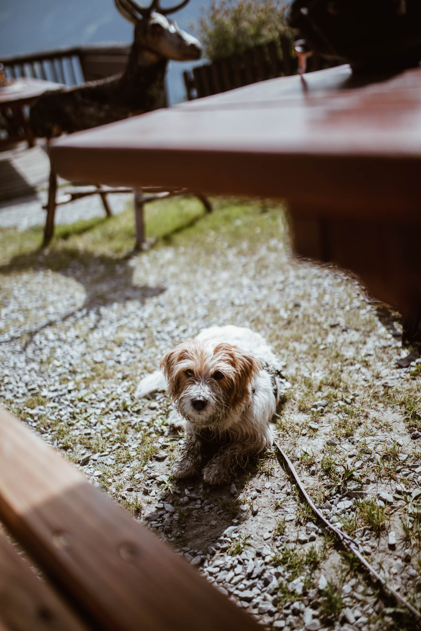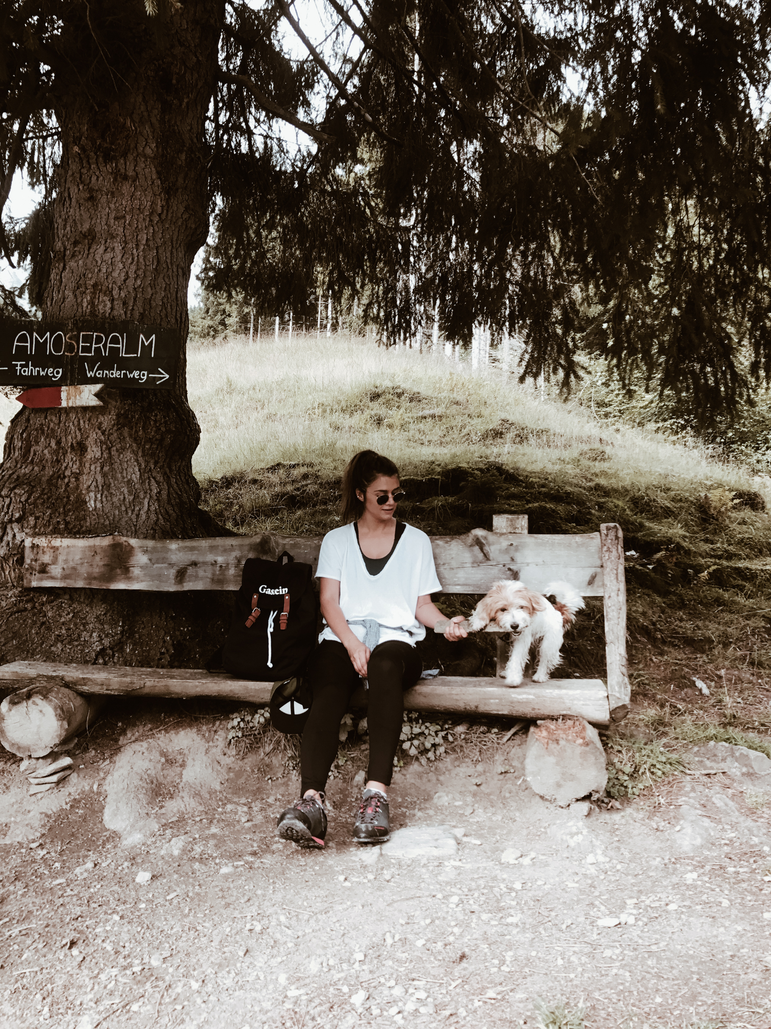 Am nächsten Morgen ging es relativ früh Richtung Amoseralm und ich finde es gibt nichts besseres als den Tag mit einer gemütlichen Wanderung zu starten – Aufstehen und raus in die Natur, genau so gefällt mir das. In ca. 1 Stunde ist man oben auf der Alm und neben einem tollen Ausblick kann man hier auch ein spätes Frühstück genießen. Brettljausn, Eierspeise, Birchermüsli – es gibt alles was man sich nach einer Wanderung wünscht. Danach gab es noch ein Schnapserl um gestärkt für den restlichen Tag zu sein. Auch Tobi hat sich richtig wohlgefühlt und gleich mal ein Schlammbad genommen. Gott sei Dank sind wir auch wieder hinuntergegangen, so hatte er genug Zeit um wieder sauber zu werden.