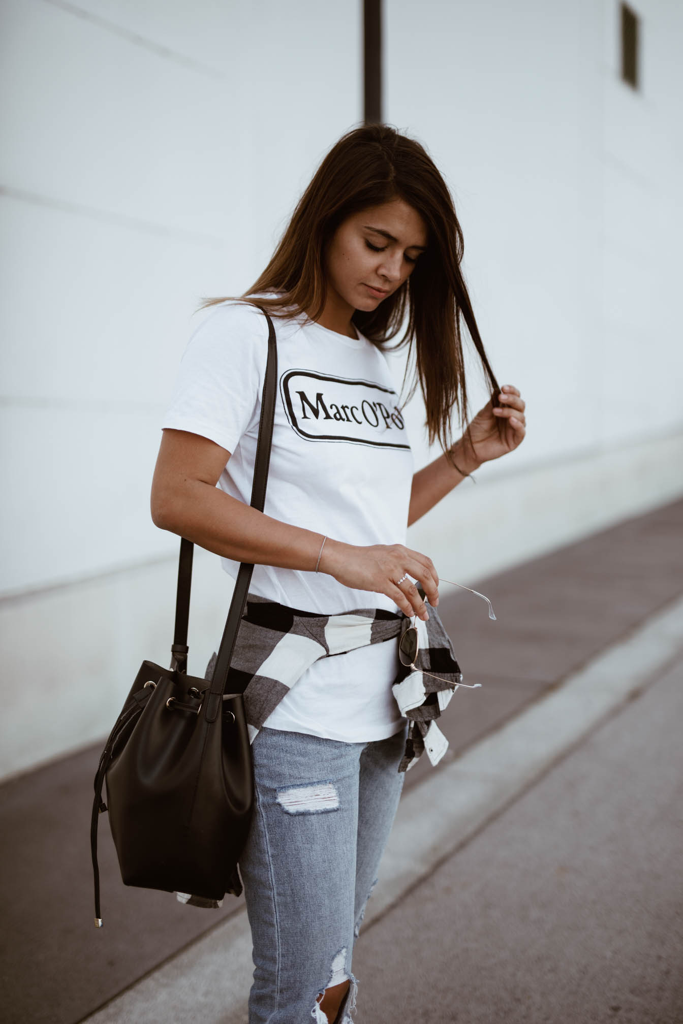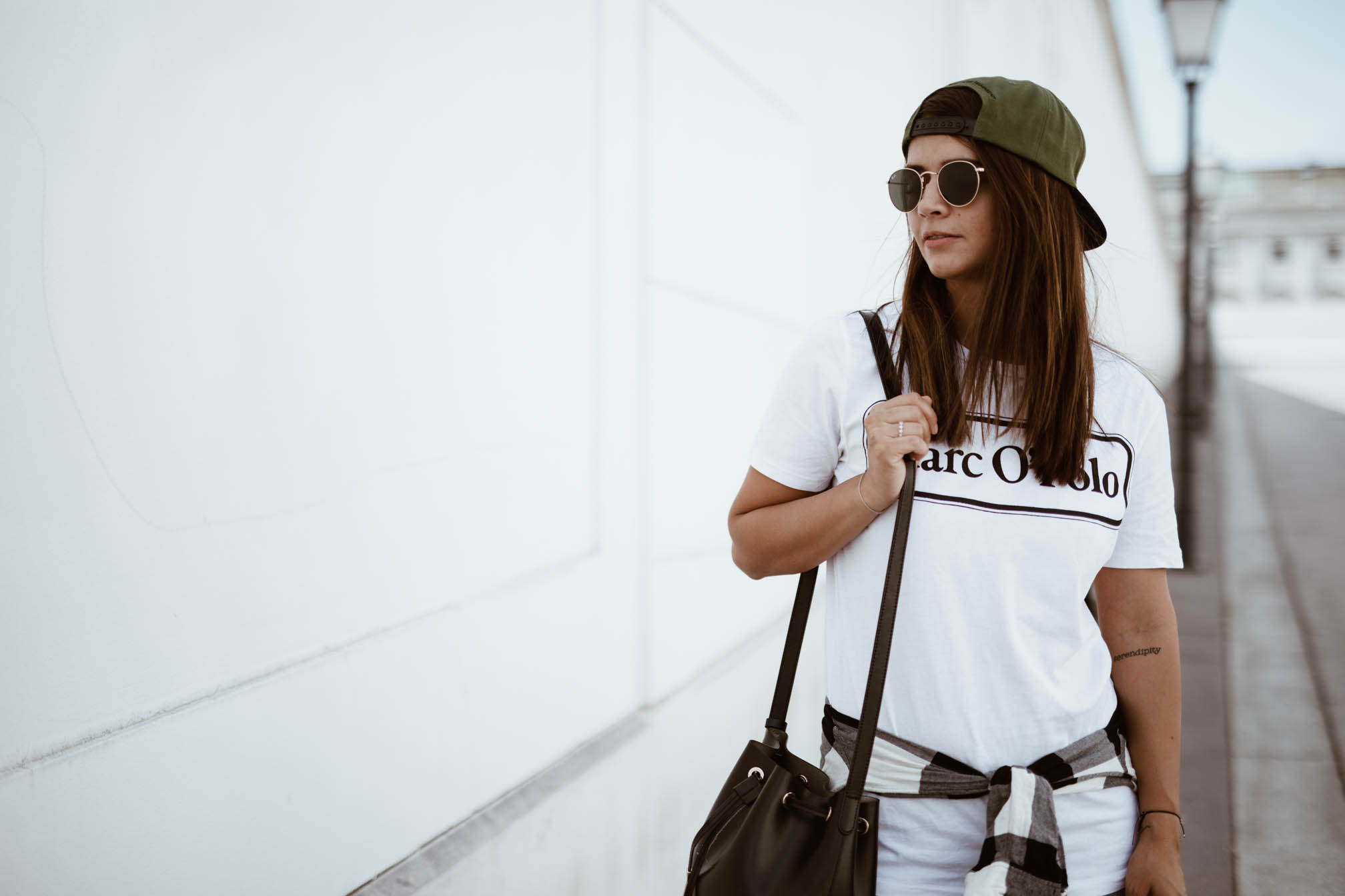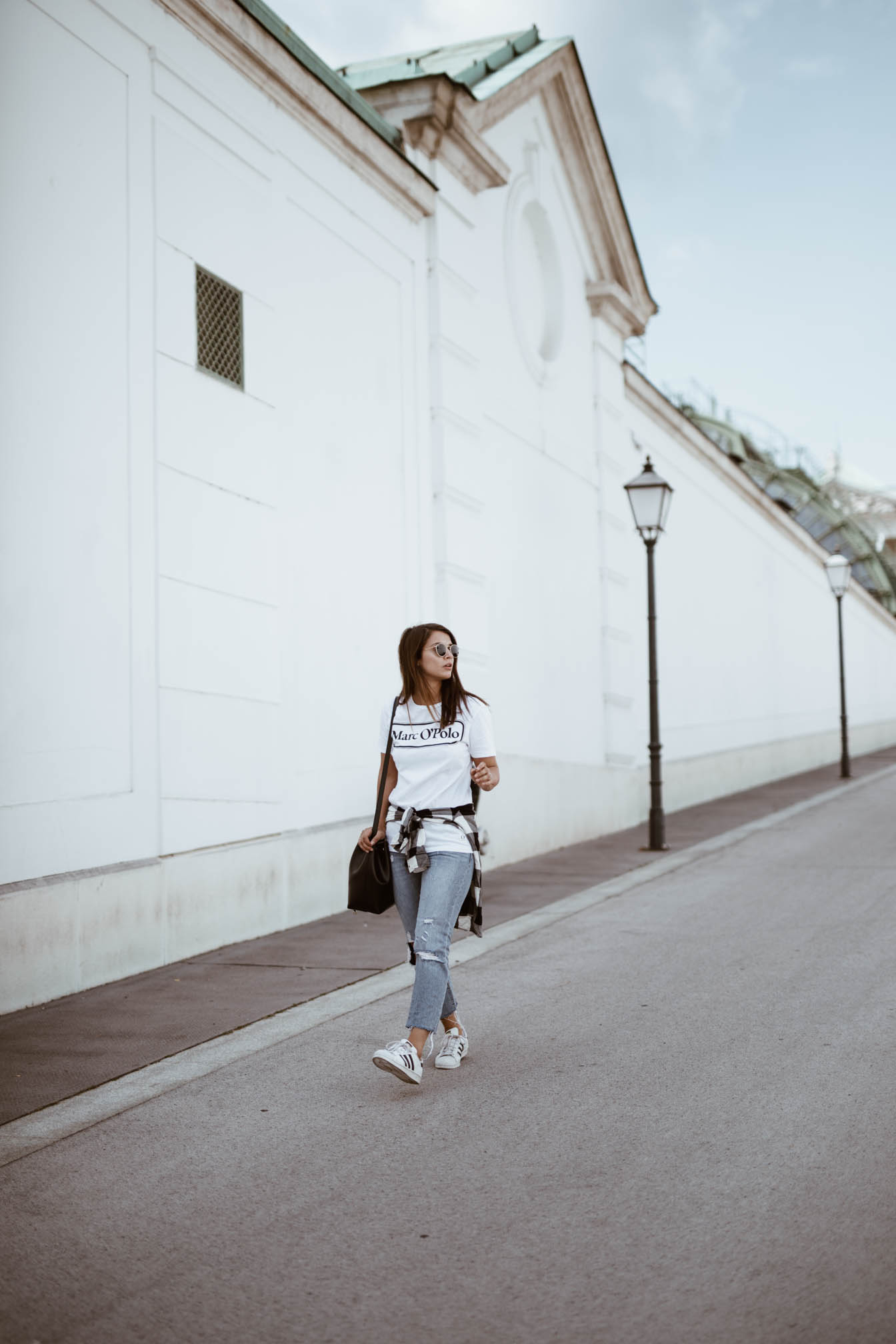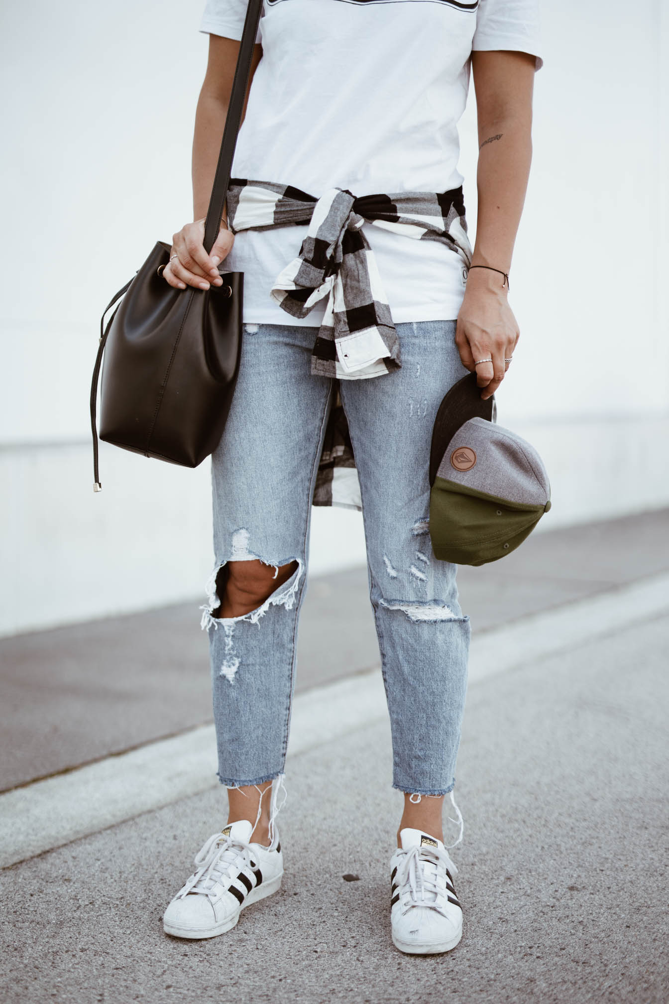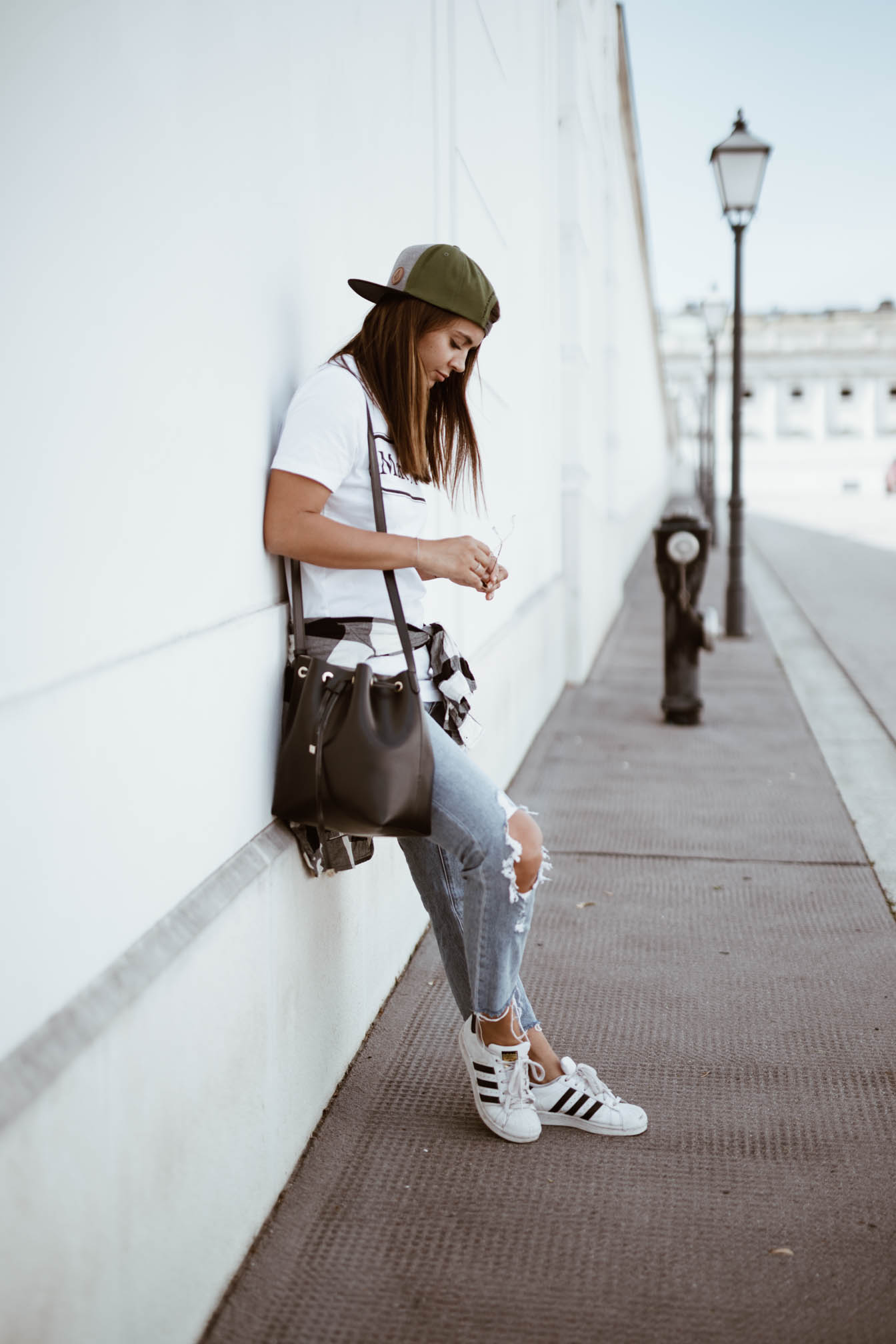 So gerne ich den Sommer auch habe, ich freu mich Ende August dann immer schon extrem auf ein paar kühlere Tage an denen ich eventuell auch mal wieder eine lange Hose anziehen kann. Meistens hat man sich dann einfach schon total satt gesehen und freut sich einfach auf ein bisschen Abwechslung. Kennt ihr das? Deshalb habe ich vor kurzem gleich Mal wieder meine Lieblingsjeans, die ich in Australien gekauft habe ausgeführt. Da es aber trotzdem noch relativ warm war, hat ein einfaches T-shirt gereicht. Ich habe mir aber einfach um Nummer sicher zu gehen und weil es natürlich cool aussieht noch ein kariertes Hemd um die Hüften gebunden. So laufe ich einfach am liebsten herum, total gemütlich und casual. Mal schauen ob ich in Wien nochmal die Möglichkeit habe so herumzulaufen, denn momentan sieht es nicht wirklich danach aus. Ich weiß es nicht wie es euch geht, aber wenn alles so grau in grau ist vermisse ich den Sommer dann doch ein wenig und ich hab auch schon ein bisschen Angst vor den nächsten Monaten, denn der Winter in Wien ist nicht wirklich so prickelnd. Hoffen wir also, dass uns noch ein paar schöne Herbsttage erwarten.
