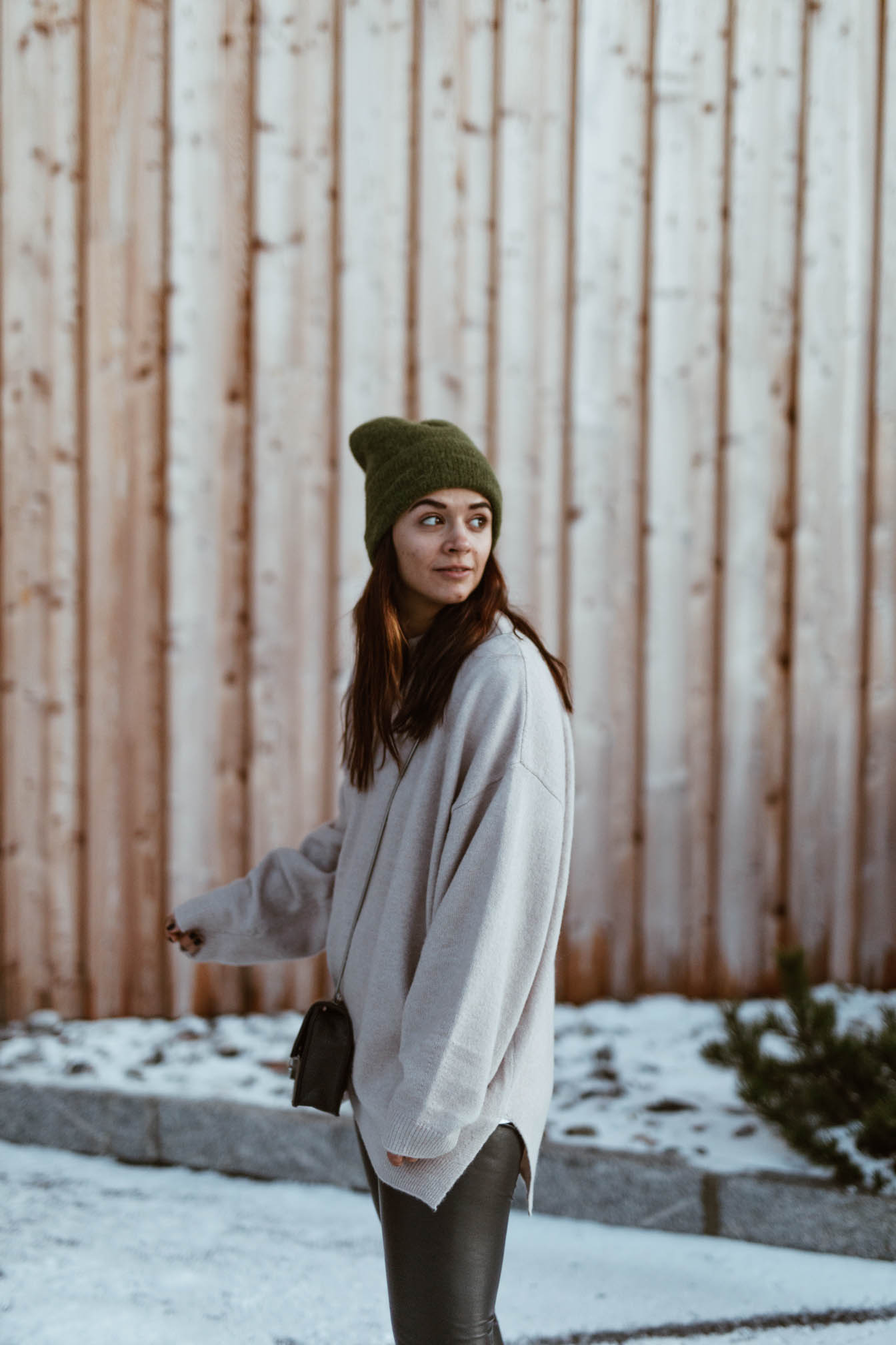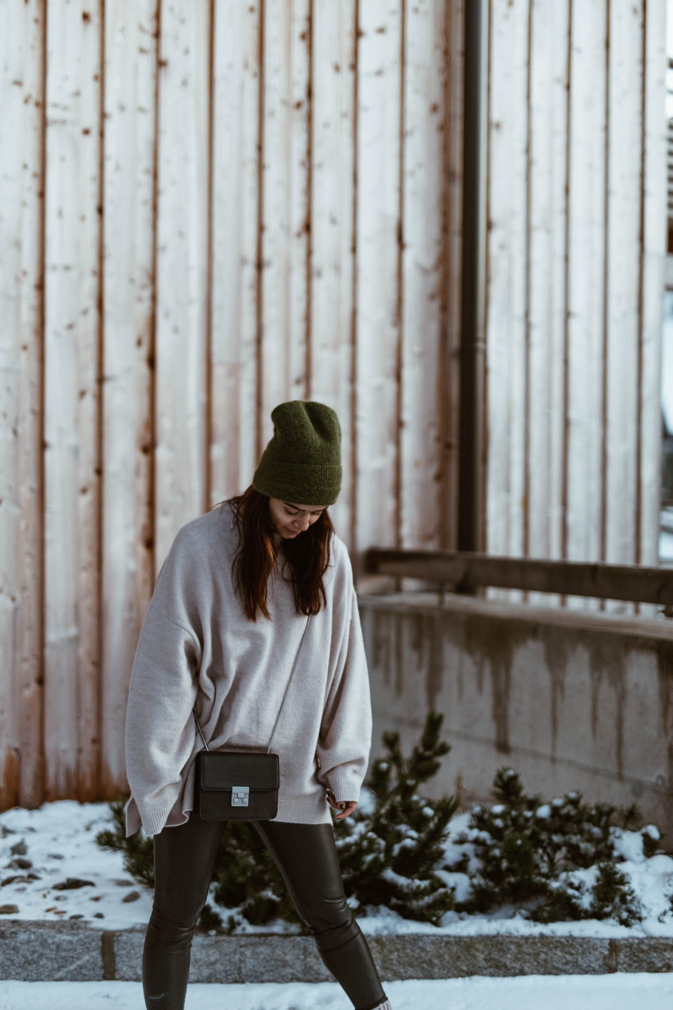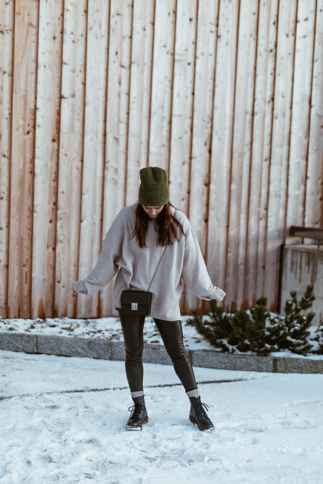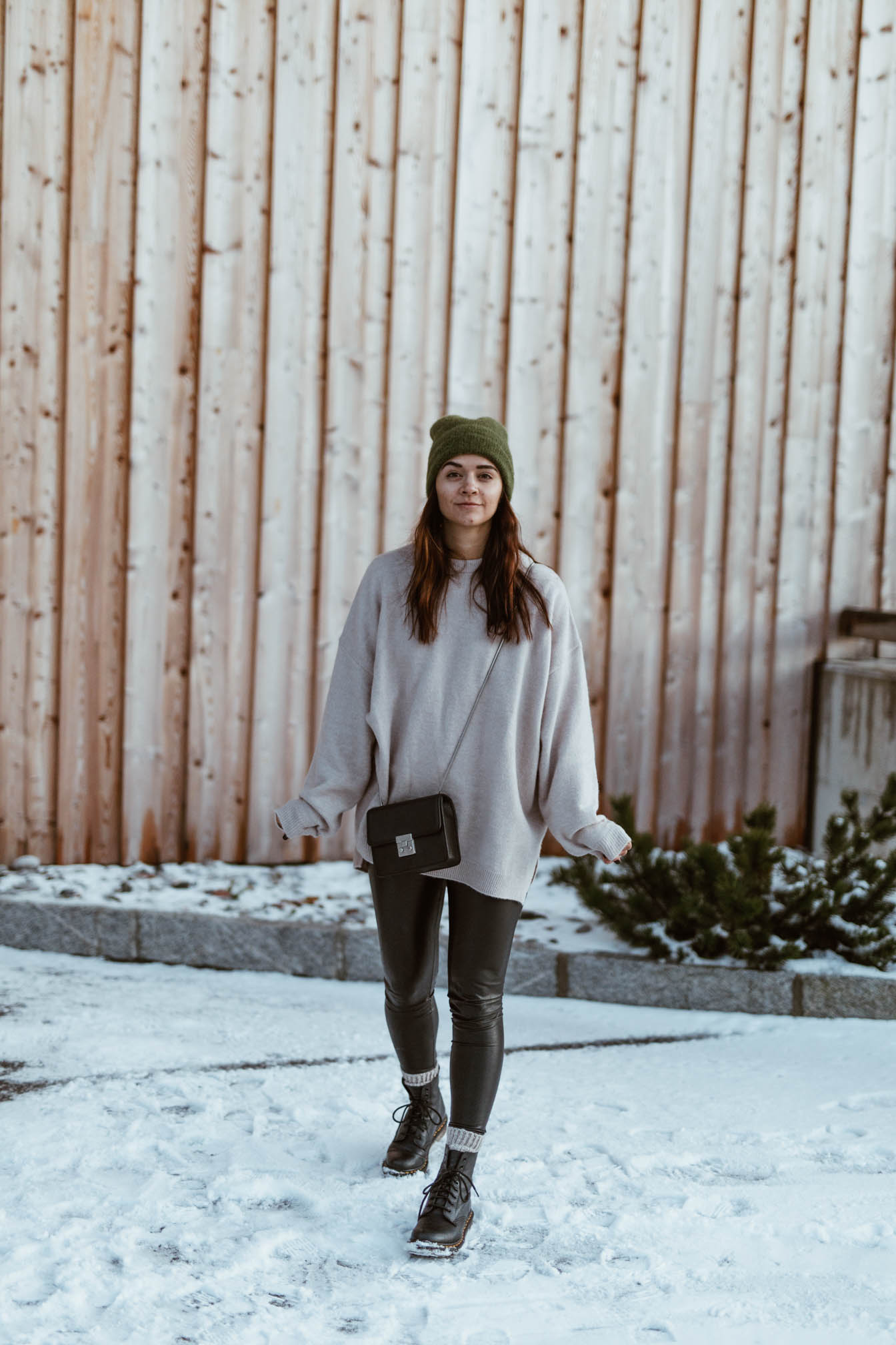 Von der Sonne in den Schnee. So schnell kann es gehen. Egal ob ich in den Flieger steige, mit dem Zug verreise oder mit dem Auto unterwegs bin, mein Outfit muss vor allem eines sein, nämlich bequem. Es gibt nichts schlimmeres, als wenn man einige Stunden unterwegs ist und unbequeme Klamotten anhat. Letzte Woche waren wir ja für ein paar Projekte in den Bergen unterwegs und haben auch einige Stunden im Auto verbracht. Da mussten gleich mehrere bequeme Teile mit in den Koffer und die Kombination aus Leggings und Kuschelpullover, ist mit Abstand meine liebste für Reisen. Da wir auf dem Weg nach Leogang einen Zwischenstop in Innsbruck eingelegt haben und ich beim Mittagessen nicht unbedingt mit einer Jogginghose auftauchen wollte, habe ich mich für meine Aritzia Lederleggings entschieden. Dieses Teil war echt die beste Investition, denn sie sieht nicht nur gut aus, sondern ist auch noch unglaublich bequem und das wichtigste, man schwitzt nicht darin. Dazu ein großer flauschiger Wollpullover, meine geliebten Dr. Martens und schon war ich ready für unsere Autofahrt von Sölden nach Leogang. Ich habe mir in Amsterdam übrigens ein neues Paar Dr. Martens zugelegt, da mir die anderen leider eine halbe Nummer zu groß waren und mir danach einfach immer meine Füße wehtaten. Das neue Modell heißt Pascal, passt perfekt und da sie relativ weich sind, muss man sie nicht erst eintragen. Außerdem sind sie etwas schmäler, war mir persönlich besser gefällt.