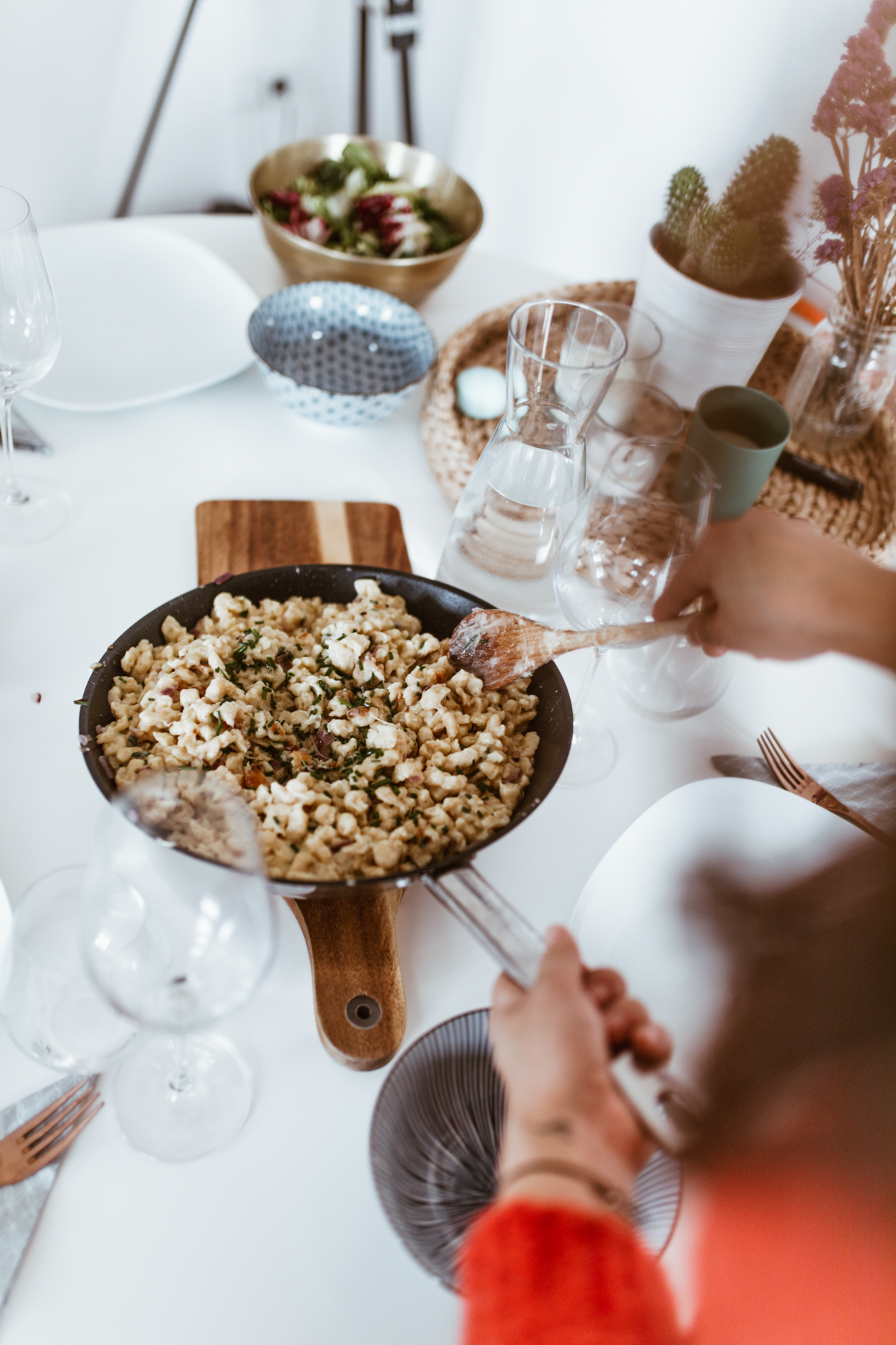 Gar nicht so überraschend ist es dann auch mein heimlicher Favorit geworden – die Kässpätzle. Je nach Region heißen die ja anders, in Vorarlberg sagt man Käsknöpfle, in Tirol Kasspatzln, in der Schweiz Chäschnöpfli und in Wien und in den meisten Teilen Deutschlands eben Kässpätzle oder Käsespätzle. Egal, welchen Namen man dem Gericht gibt, es ist ganz klar unglaublich köstlich. Und ich kann euch eins sagen, es ist gar nicht so leicht als Wienerin eine Vorarlbergerin mit selbstgemachten Kässpätzle zu überzeugen. Aber Denise war positiv überrascht und konnte meinem herzhaften Leerdammer Kässpätzle Rezept auch nicht widerstehen. :)
