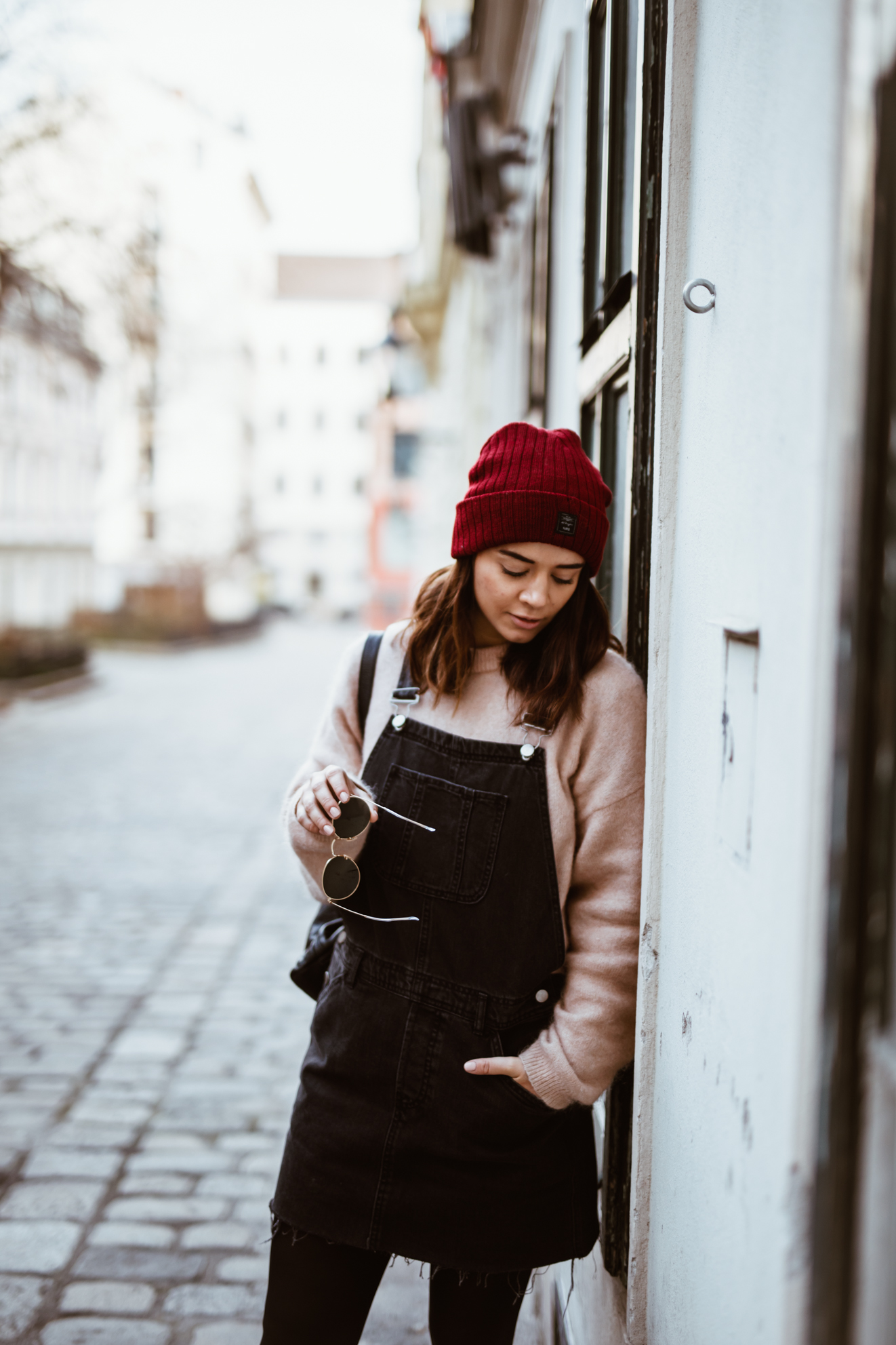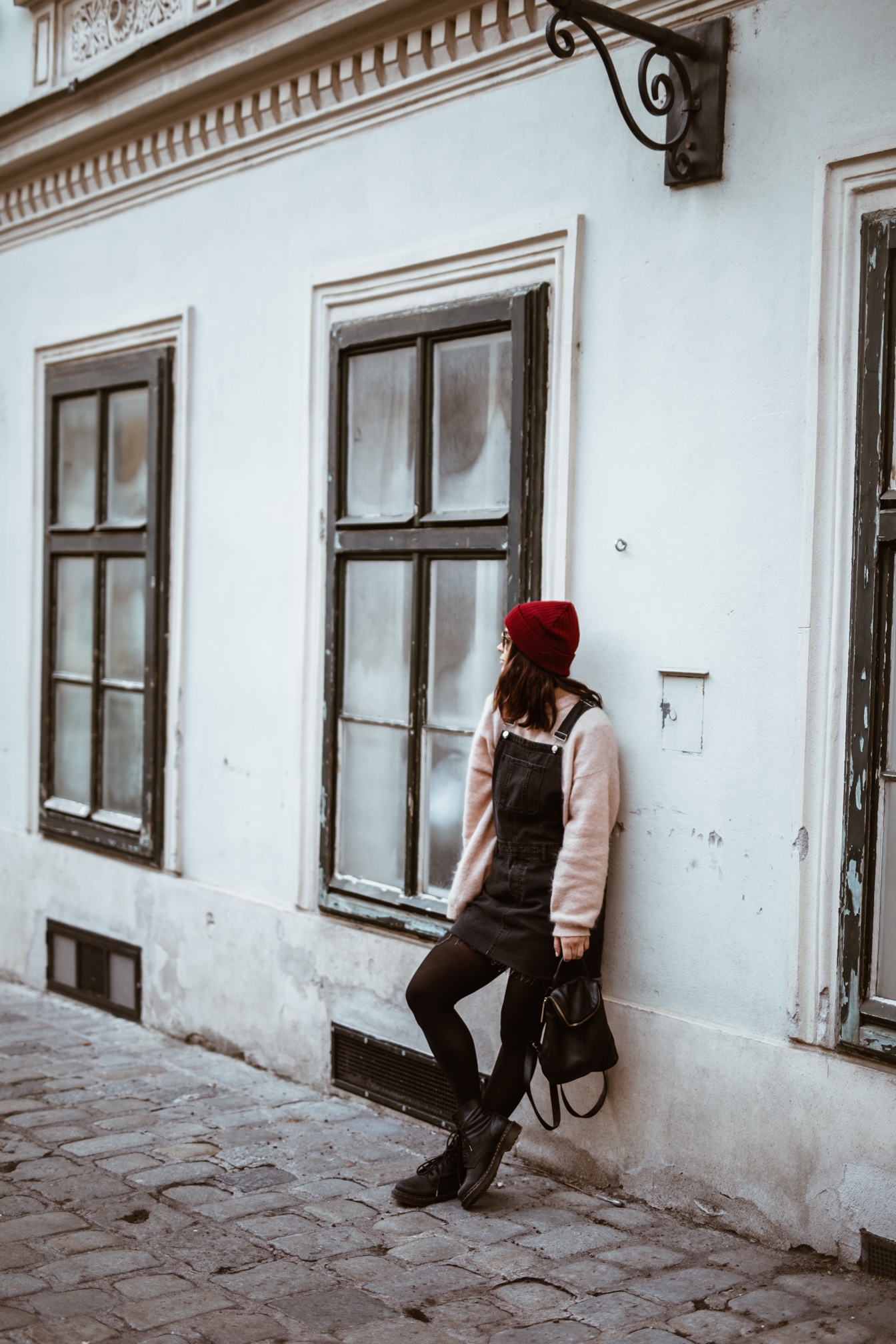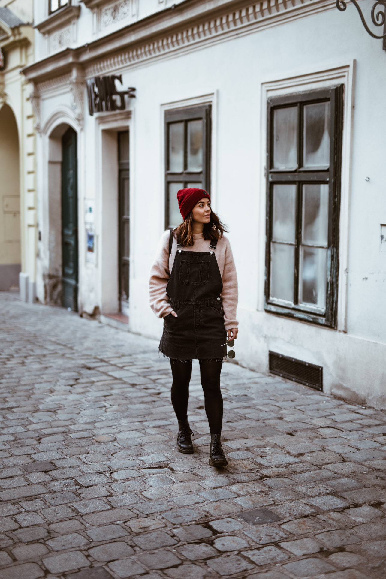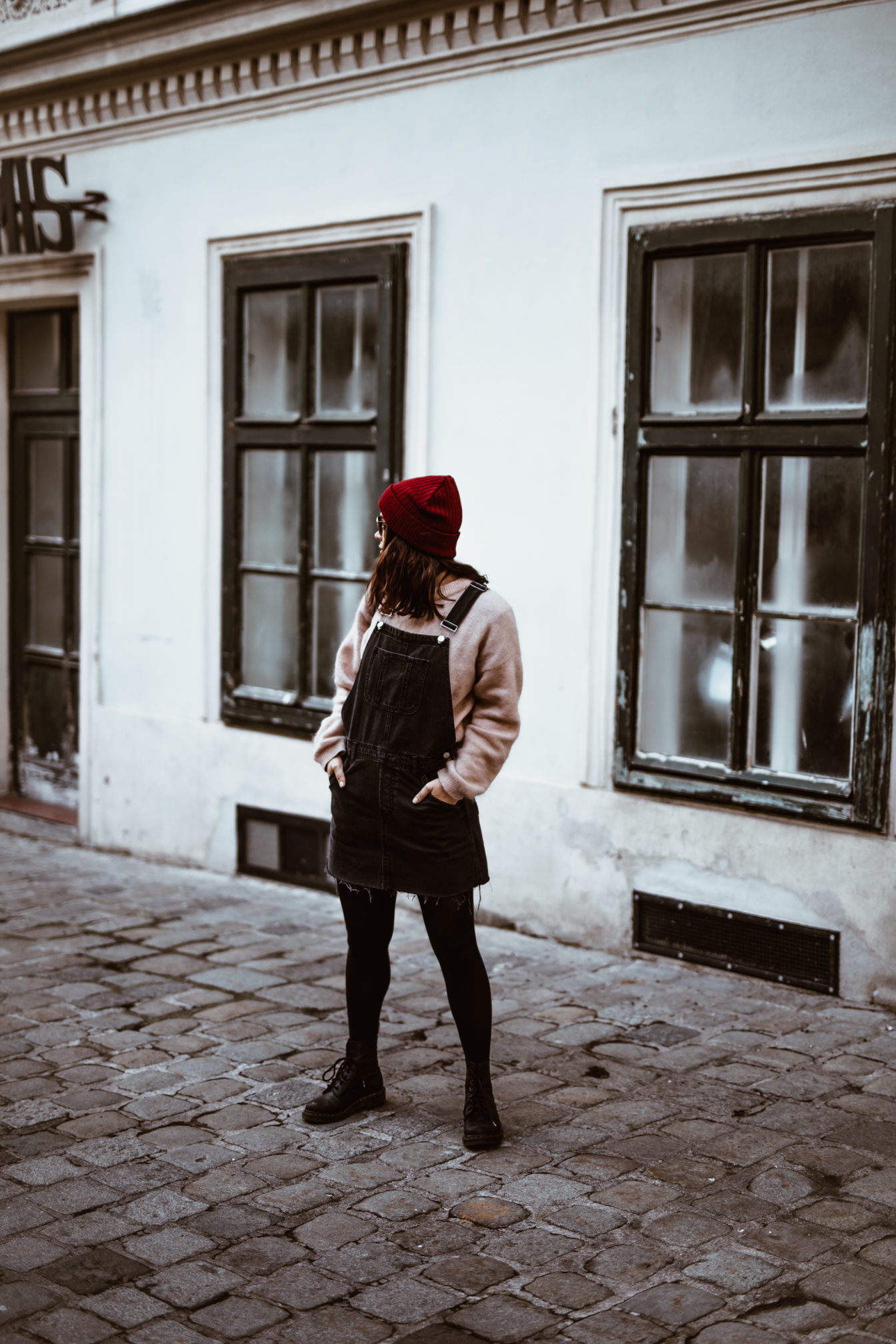 Latzhosenkleid – Asos || Pullover – Acne Studios (andere Farbe HIER) || Sonnenbrille – Ray Ban || Boots – Dr. Martens || Rucksack – Whistles || Mütze – Barts (ähnliche HIER)