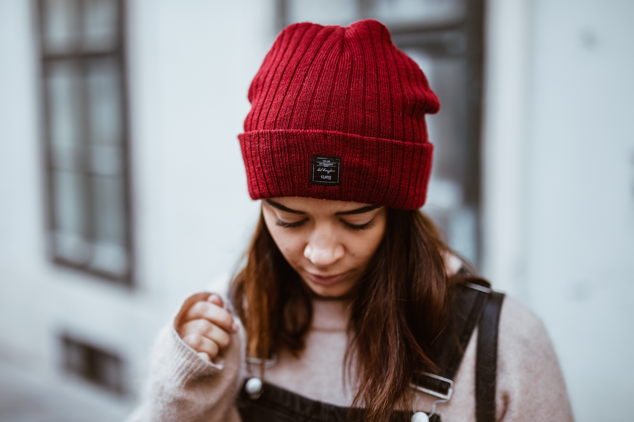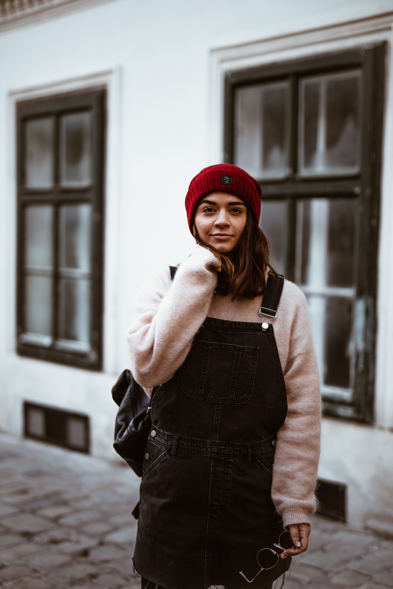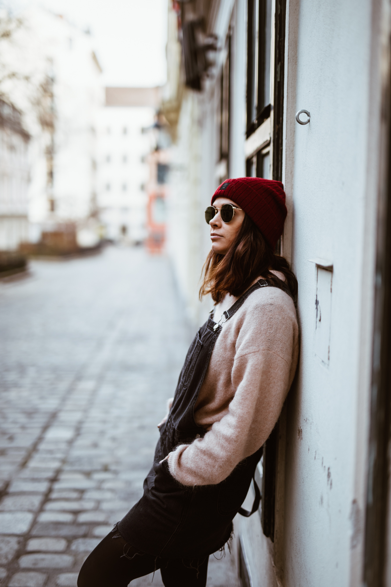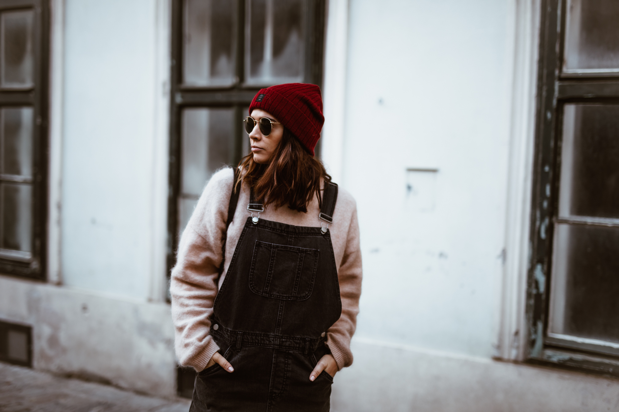 Latzhosenkleid – Asos || Pullover – Acne Studios (andere Farbe HIER) || Sonnenbrille – Ray Ban || Boots – Dr. Martens || Rucksack – Whistles || Mütze – Barts (ähnliche HIER)