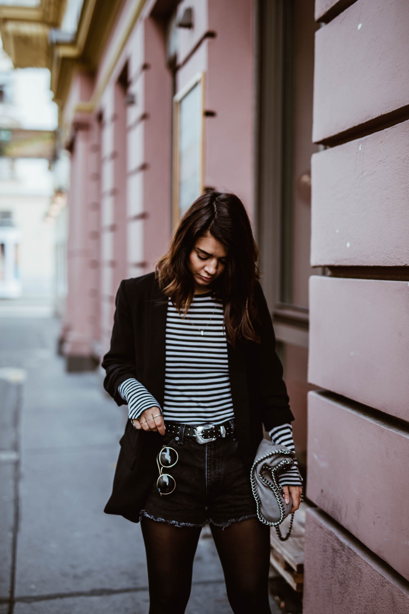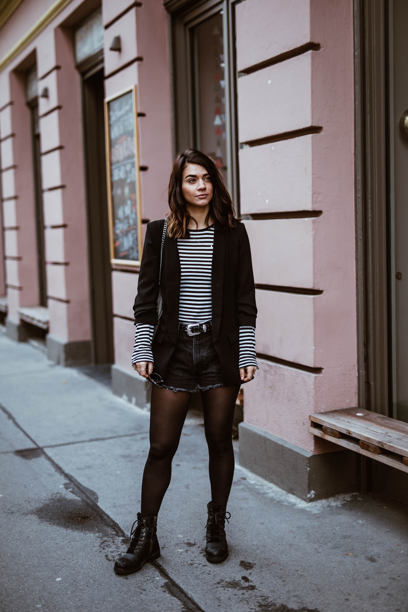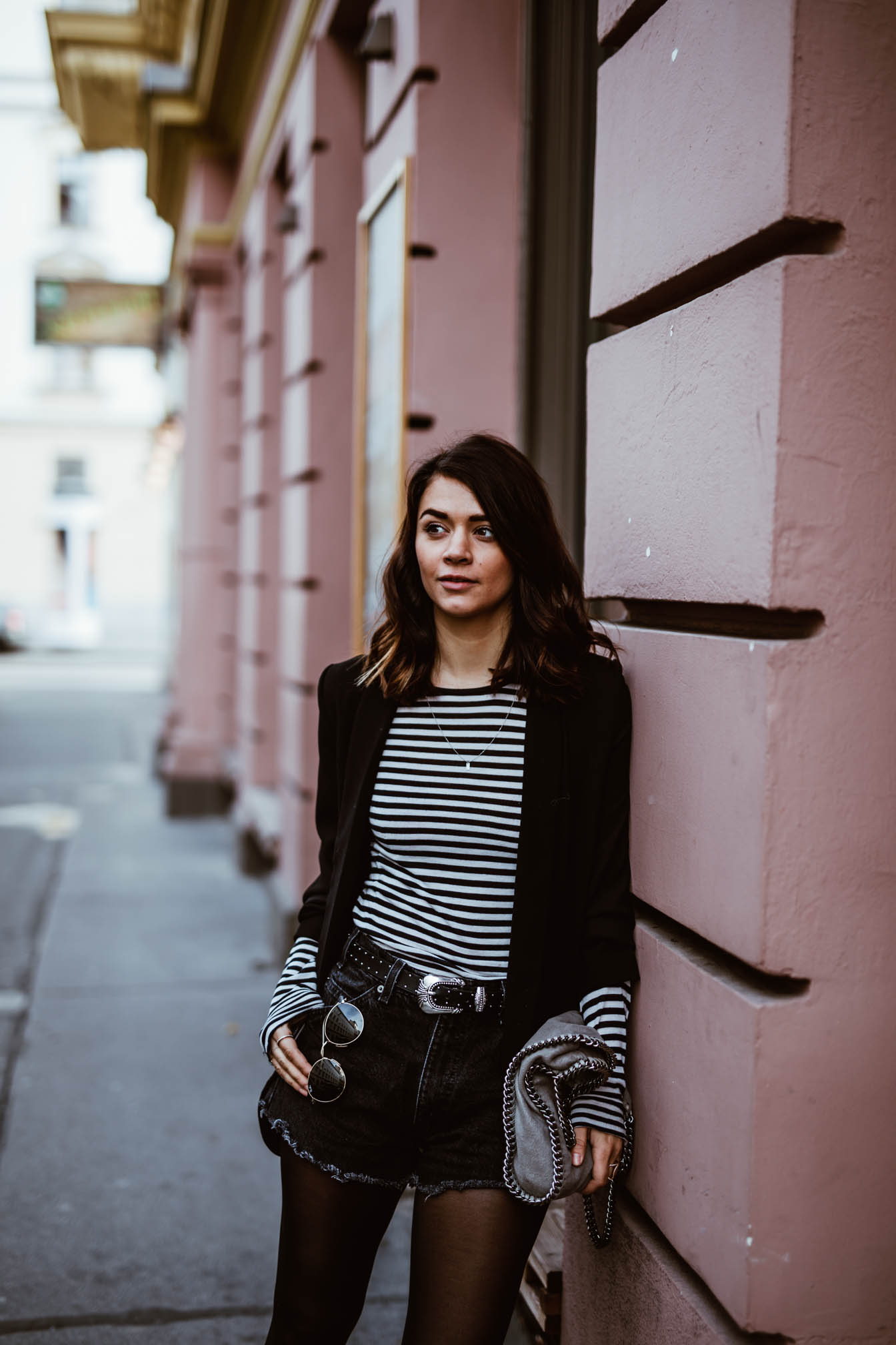 Neue Woche, Neues Glück – oder so. Noch hält sich meine Motivation in Grenzen. Vor allem wenn ich aus dem Fenster blicke und die graue Nebelsuppe sehe. Vergangene Woche war es ein paar Tage richtig warm und sonnig in Wien. Es hat so gewirkt, als wäre der Frühling bereits auf dem Weg. Sehr motiviert habe ich die Sonnenbrille und meine Shorts (natürlich mit Strümpfe) ausgepackt und ausgeführt. Auch mein Streifenshirt durfte an diesem schönen Tag nicht fehlen und ich hab das Gefühl ich lebe momentan darin und trage nichts anderes. Es peppt aber auch einfach jeden Look auf und genau deshalb steh ich auch so drauf Leider war der Besuch der Sonne nur ein kurzer und so sitze ich heute wieder dick eingepackt in meinem Pullover im Office. Ich denke es dauert dann doch noch ein bisschen bis der Frühling nach Wien kommt. Was mich aber gar nicht stört, denn am Donnerstag geht es wieder in den Schnee und ich kann es schon gar nicht mehr erwarten am Board zu stehen. Ja so schnell kann es gehen und das Sommerkind wird zum Winterliebhaber.
