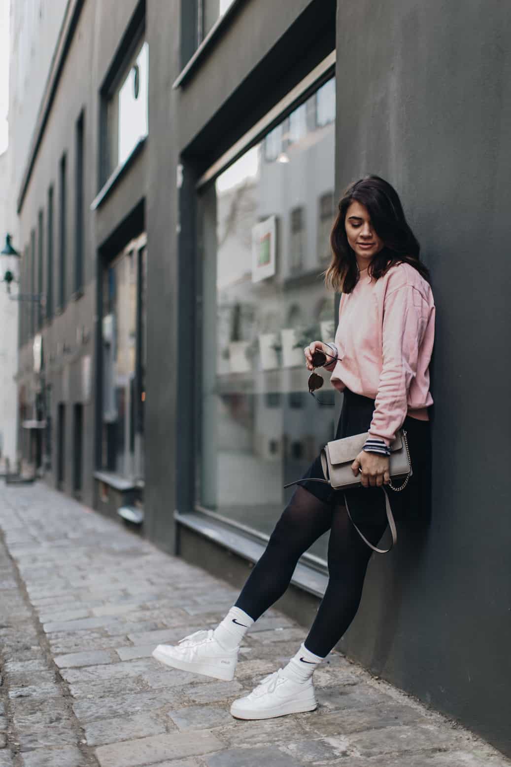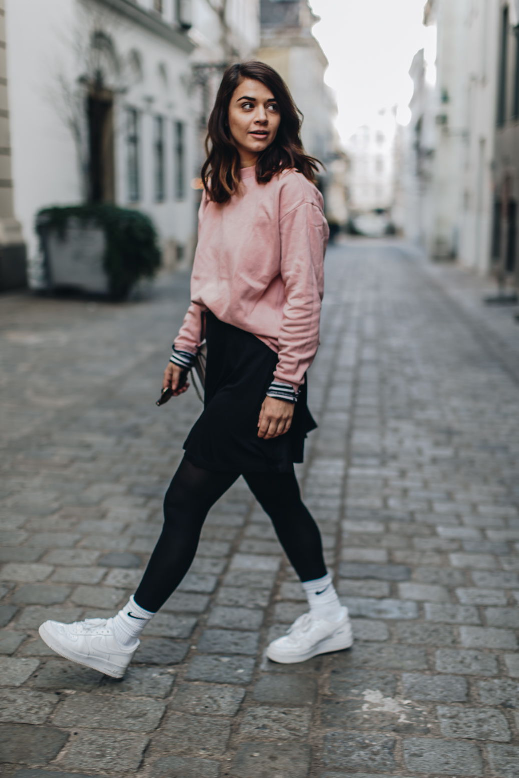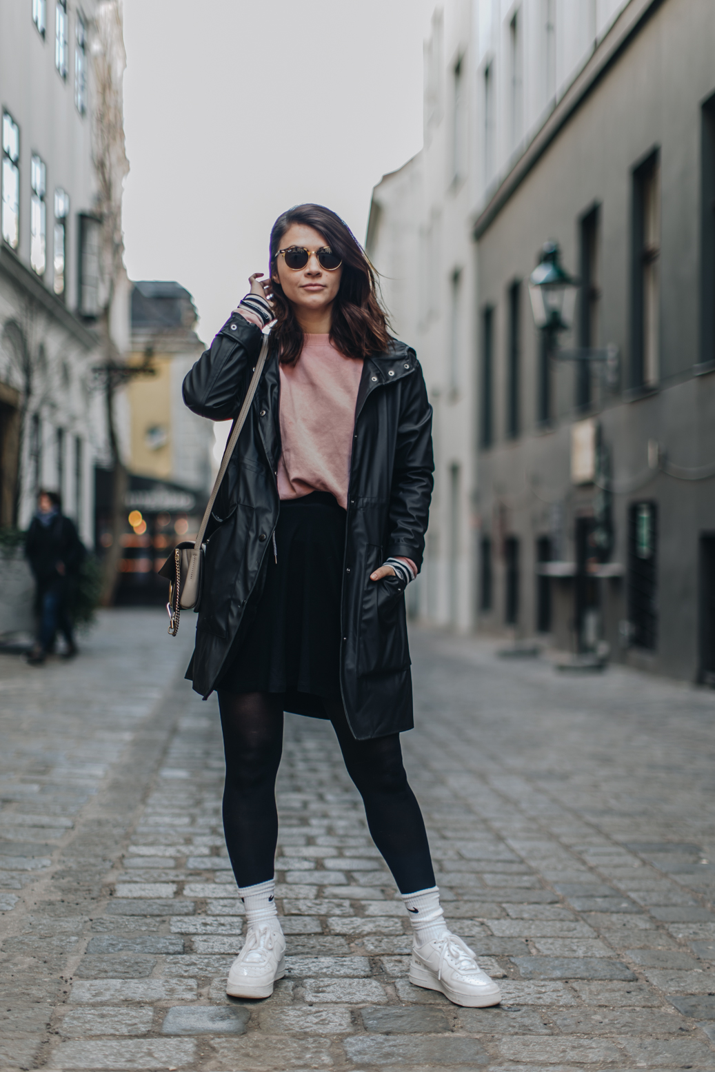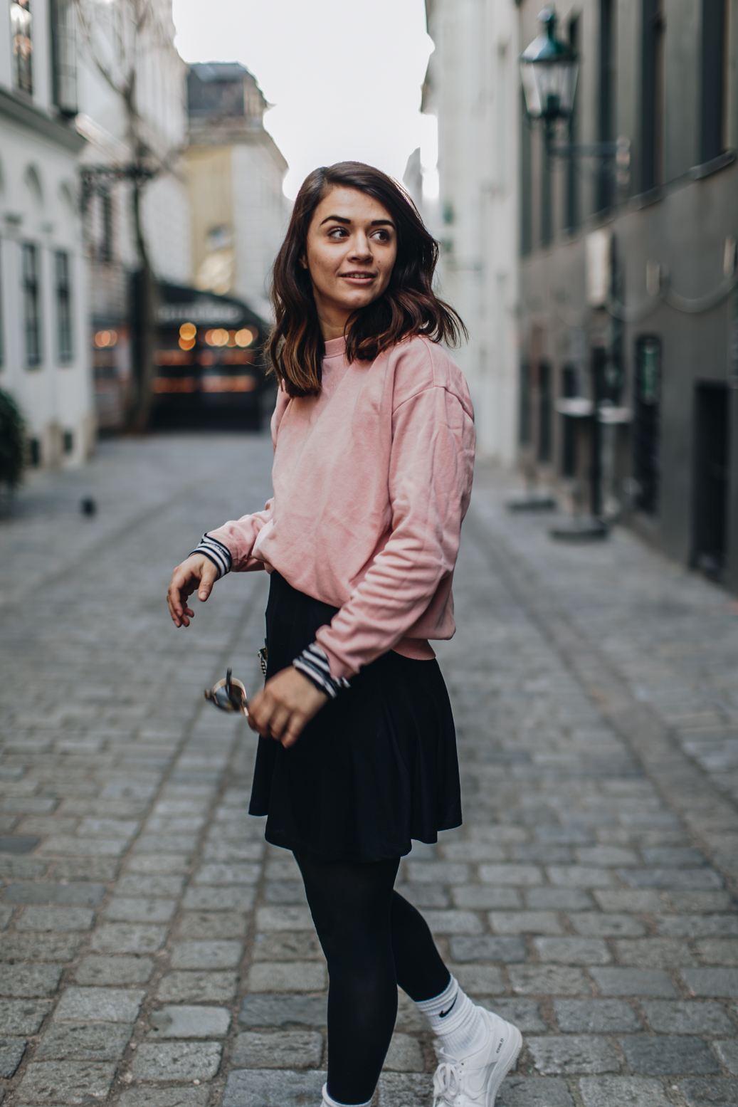 Vor einigen Monaten war ich bei der Eröffnung des neuen Nike Stores auf der Mariahilferstrasse und dort ist mir gleich mal diese richtig cool gekleidete Frau aufgefallen. Sie hat einfach mal Sneakers, mit Tennissocken und einem ausgestellten Rock kombiniert und dieses Outfit richtig gerockt. Ich war so begeistert von diesem Look, dass ich mir vor kurzem gleich einen ausgestellten Rock zugelegt und mich auch an diese Kombination gewagt habe. Es ist zwar mal etwas anderes, aber ich liebe diesen sportlichen Look und ein bisschen Abwechslung schadet ja bekanntlich nicht. Damit der ganze Look noch freundlicher wirkt habe ich den grauen Hoodie im Schrank gelassen und stattdessen zum rosa Sweater gegriffen. Zum Schluss habe ich mir noch meine Regenjacke übergeworfen und den lieben Pat Domingo dazu genötigt mal wieder ein paar coole Fotos von mir zu machen. Zu unserem Glück ist auch noch die Sonne rausgekommen und mit der habe ich dann auch um die Wette gestrahlt.