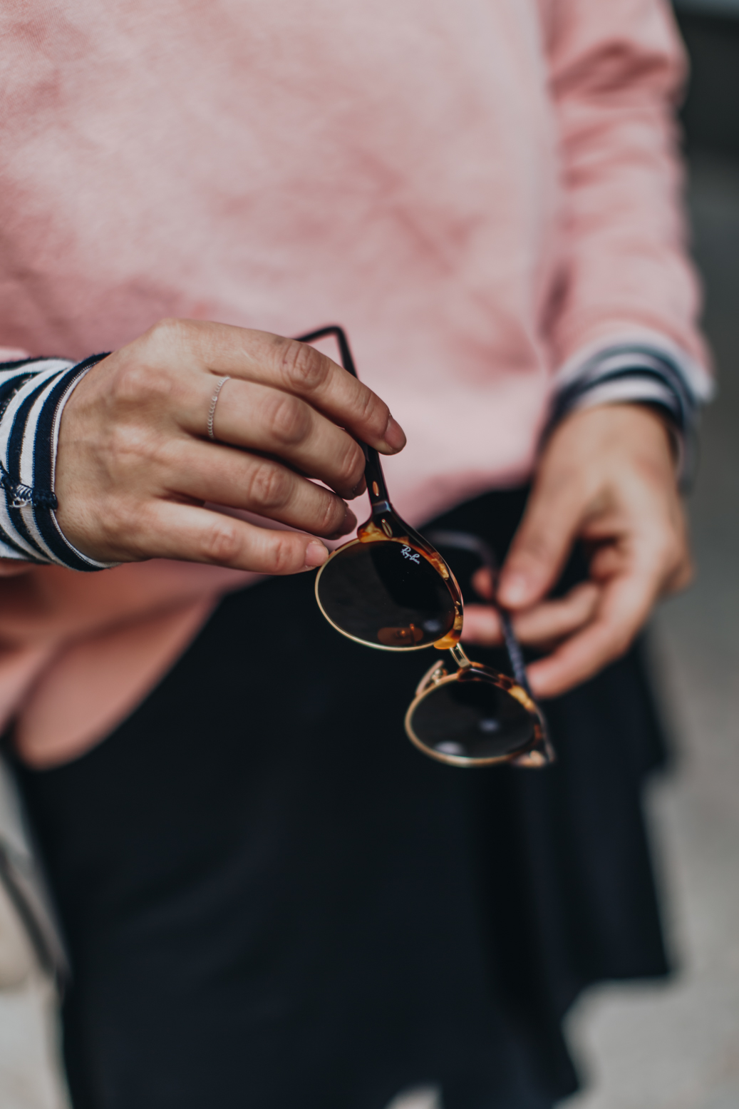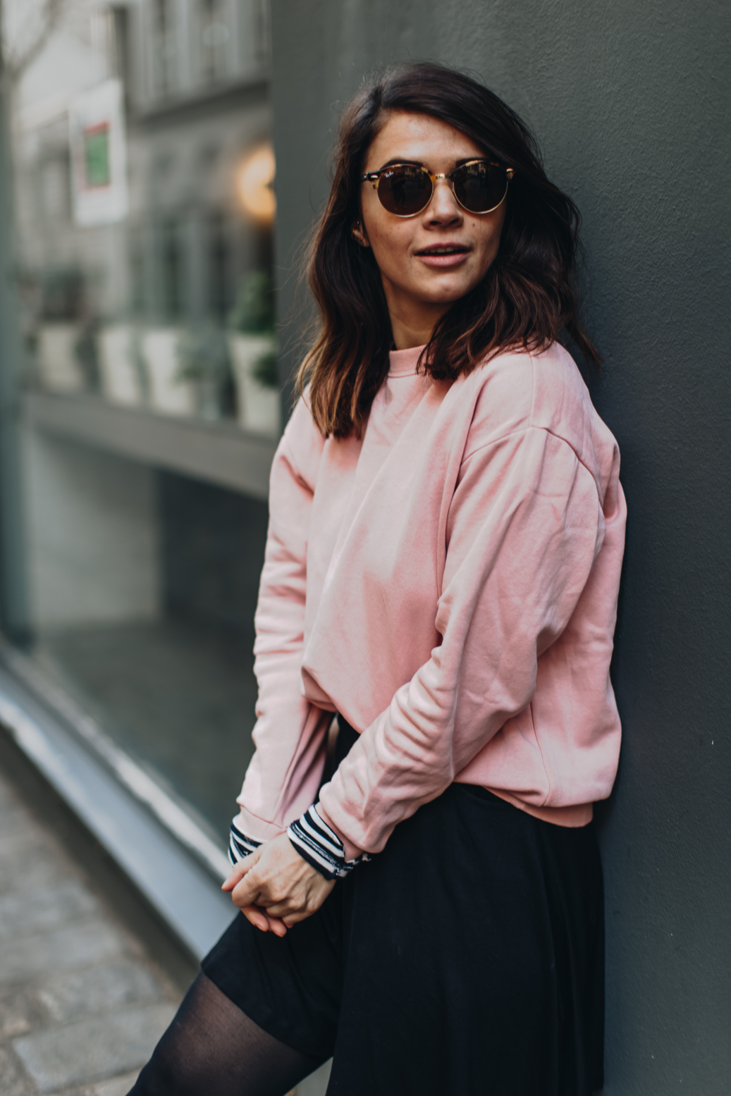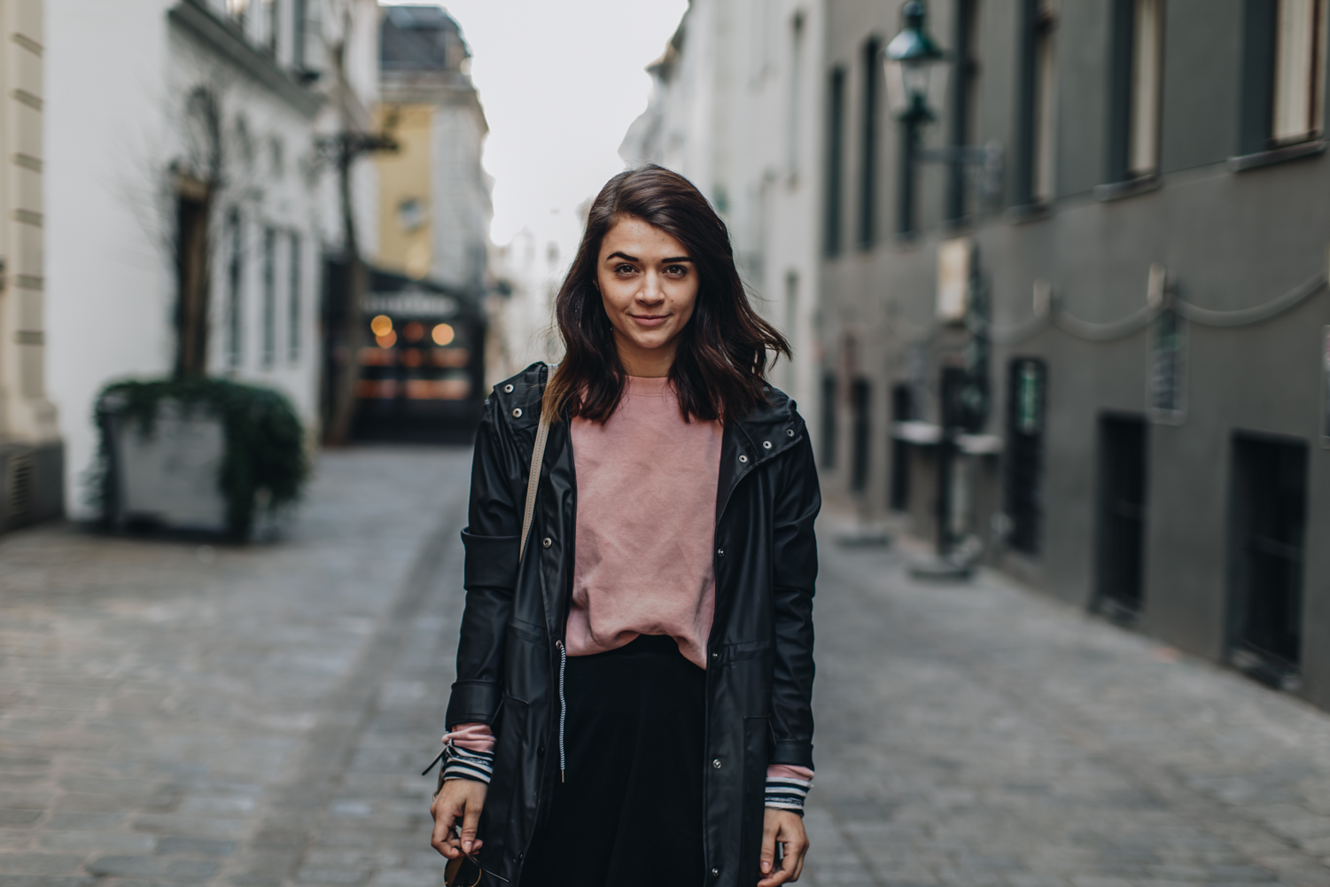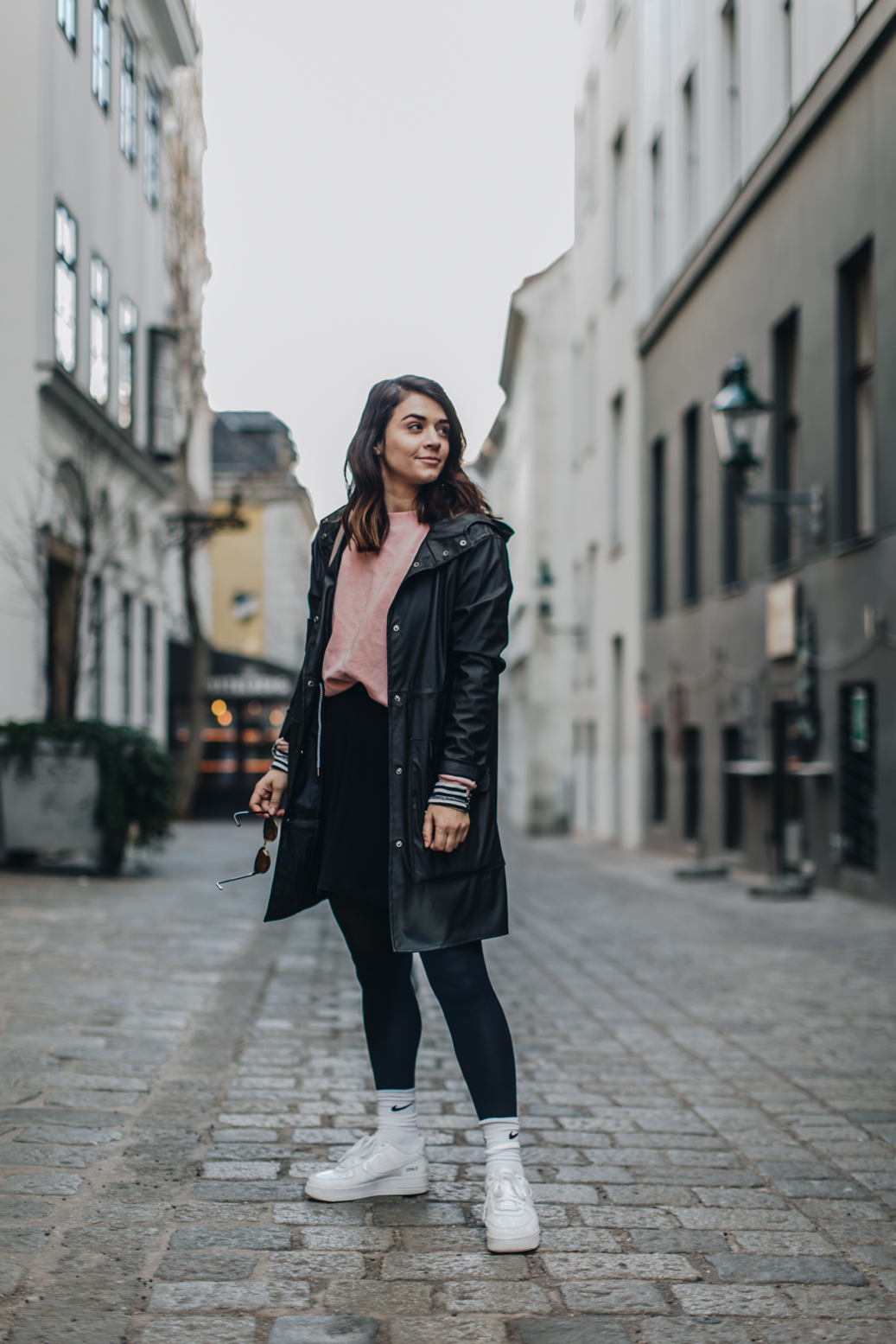 Vor einigen Monaten war ich bei der Eröffnung des neuen Nike Stores auf der Mariahilferstrasse und dort ist mir gleich mal diese richtig cool gekleidete Frau aufgefallen. Sie hat einfach mal Sneakers, mit Tennissocken und einem ausgestellten Rock kombiniert und dieses Outfit richtig gerockt. Ich war so begeistert von diesem Look, dass ich mir vor kurzem gleich einen ausgestellten Rock zugelegt und mich auch an diese Kombination gewagt habe. Es ist zwar mal etwas anderes, aber ich liebe diesen sportlichen Look und ein bisschen Abwechslung schadet ja bekanntlich nicht. Damit der ganze Look noch freundlicher wirkt habe ich den grauen Hoodie im Schrank gelassen und stattdessen zum rosa Sweater gegriffen. Zum Schluss habe ich mir noch meine Regenjacke übergeworfen und den lieben Pat Domingo dazu genötigt mal wieder ein paar coole Fotos von mir zu machen. Zu unserem Glück ist auch noch die Sonne rausgekommen und mit der habe ich dann auch um die Wette gestrahlt.