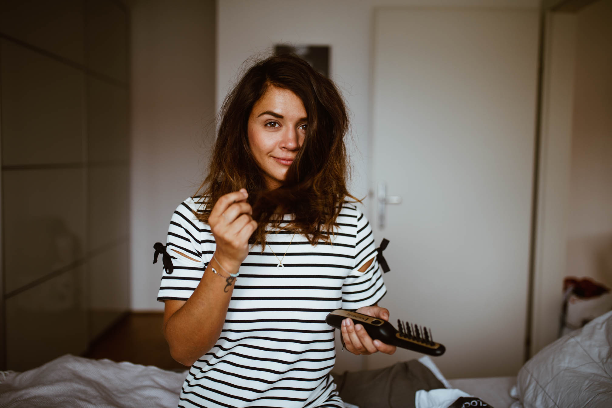Wenn es um meine Haare geht bin ich doch ein sehr fauler Mensch muss ich gestehen. Ok, ich gebe zu, ich kann auch so allgemein ziemlich faul sein, aber bei meinen Haaren erreicht die Faulheit nochmal ein ganz neues Level und wenn ich euch gleich meine Geschichte erzähle, wisst ihr auch was ich meine. Die ersten Wochen meiner Reise habe ich nicht nur den BH (mein Motto war ja, No Make-Up No Bra wie ihr vielleicht mitbekommen habt) sondern auch meine Bürste im Rucksack gelassen und meine Haare somit kein einziges mal frisiert. Ich weiß nicht wieso, aber mich hat es einfach nicht gefreut sie zu bürsten und irgendwie habe ich einfach darauf vergessen. Naja auf jeden Fall haben sich nach knapp einer Woche richtige Dreadlocks gebildet und nachdem ich es geschafft habe diese Verfilzungen sehr lange und gut zu ignorieren, sind es dann doch immer mehr geworden. Gott sei Dank konnte ich sie selber nicht sehen, weil nur der Hinterkopf betroffen war. Zu meiner Verteidigung muss ich aber sagen, dass es nicht nur mit meiner Faulheit zu tun hat, sondern auch eher damit, dass ich meine Naturwellen einfach unheimlich gerne hab und am Meer sind sie noch viel schöner. Ich liebe den Messy Look und wenn ich sie bürste, sind sie einfach nur halb so schön und wirken oft strohig und das obwohl ich Öl in die Spitzen gebe. Meine Haare schauen einfach aus als hätte ich in die Steckdose gegriffen, wenn ich sie luftrocknen lassen und dann frisiere – sie sind dann so richtig elektrisch und stehen in alle Richtungen, richtig schrecklich.