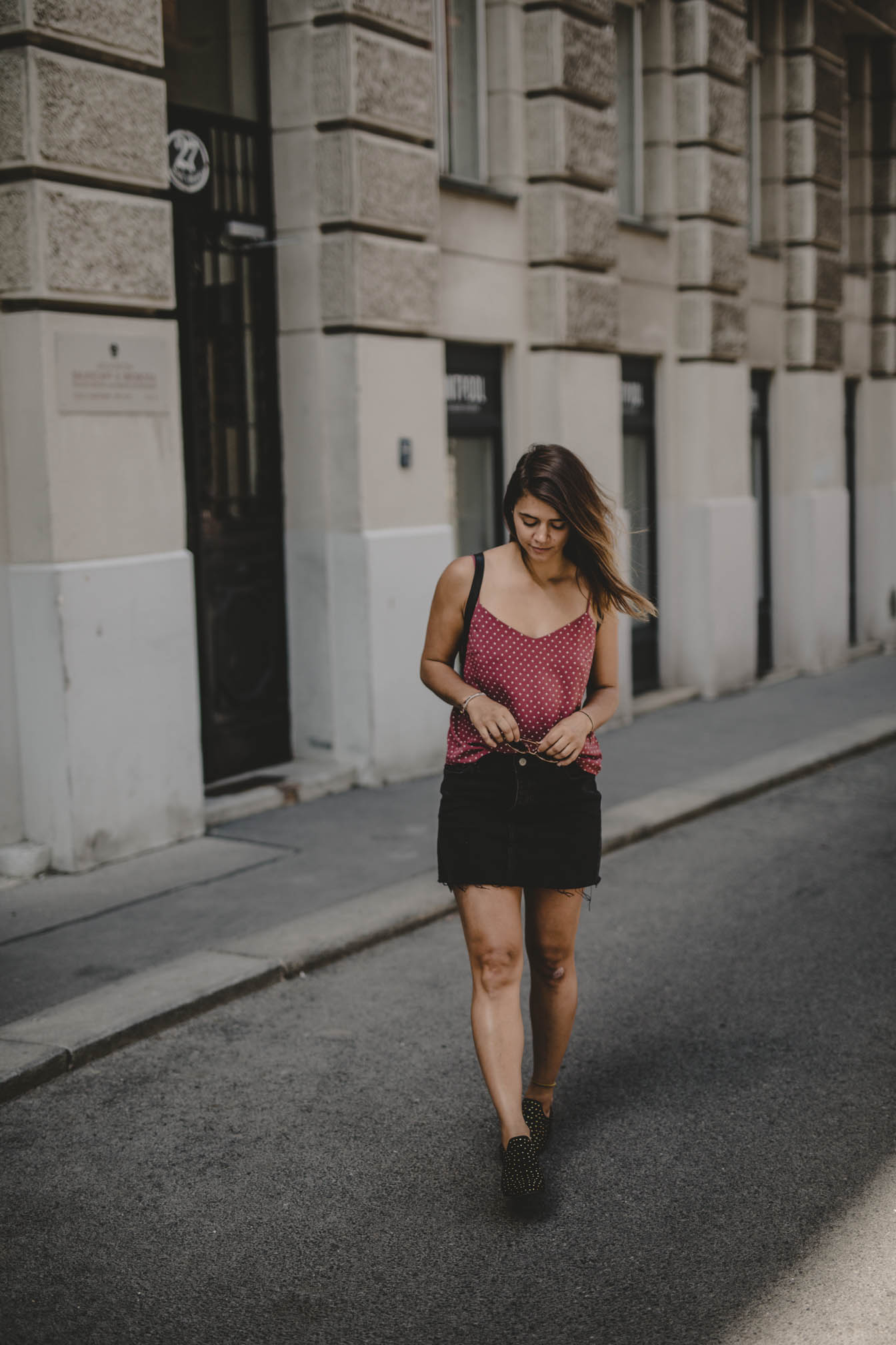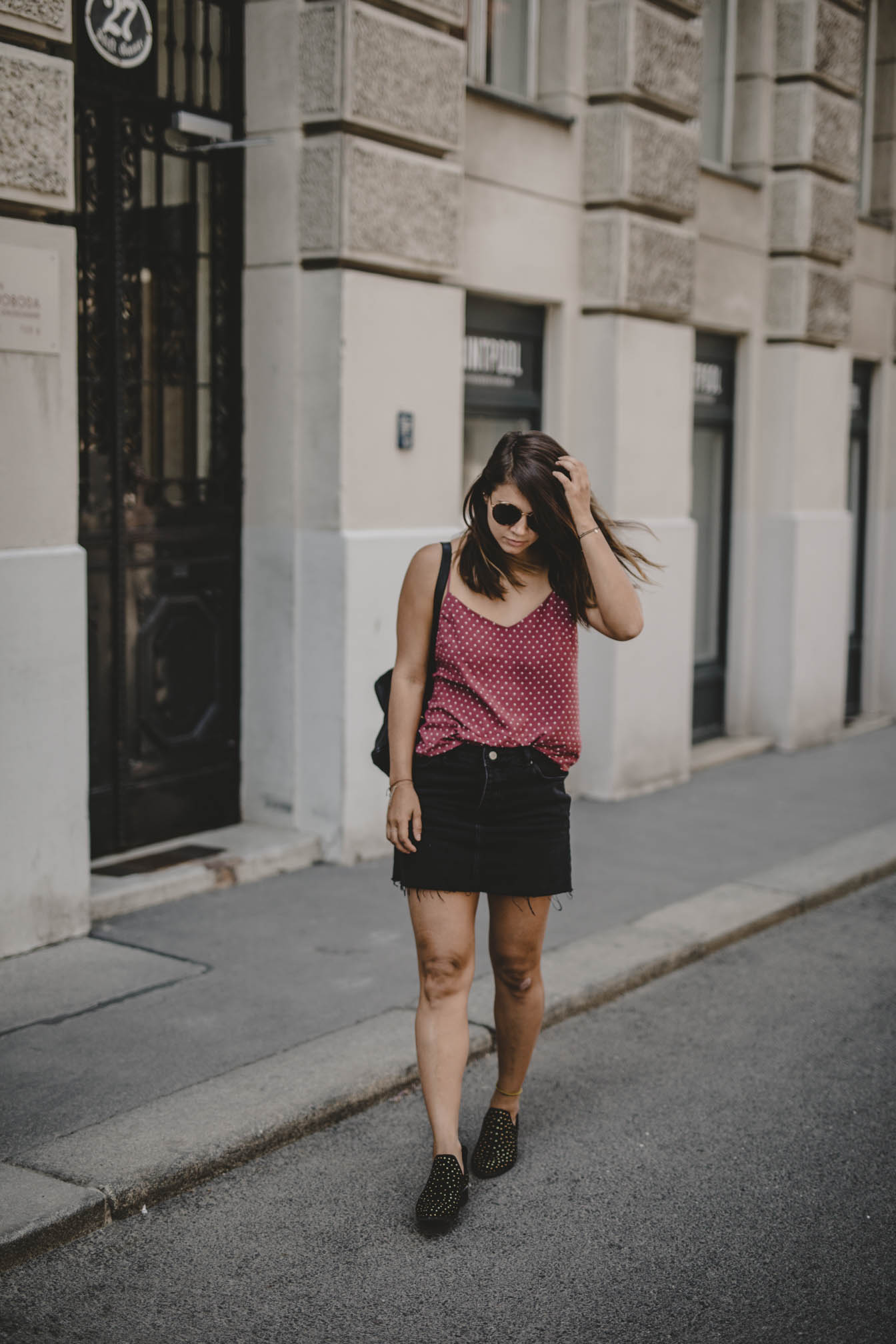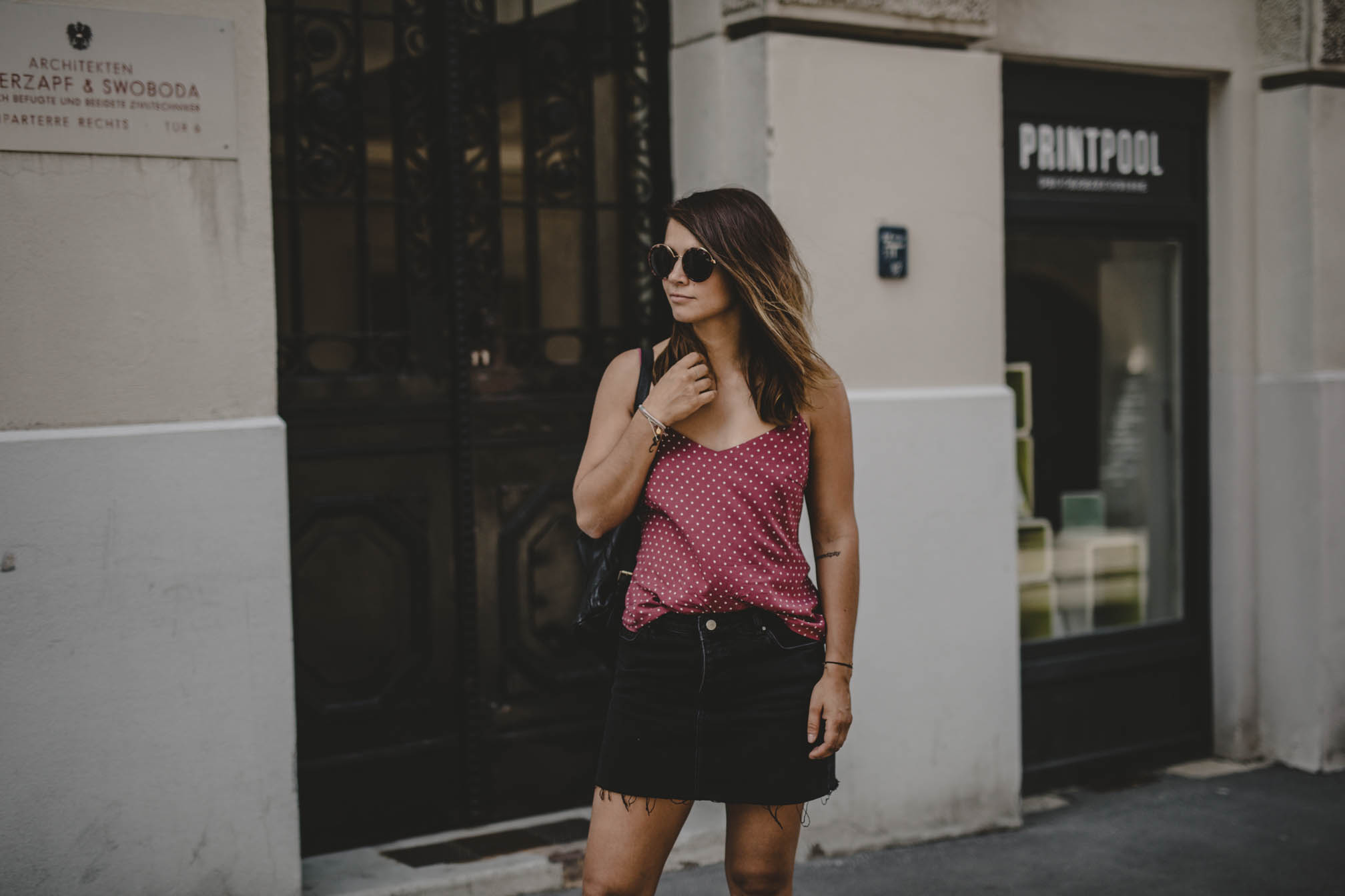Vom Winter direkt zum Sommer - Irgendwie wurde der Frühling einfach mal übersprungen und so gab es in den vergangenen Tagen bereits knackige 28 Grad in Wien. Ich hätte mich zwar auch auf ein paar frühlingshafte Tage gefreut, doch als absolutes Sommerkind bin ich eigentlich auch ganz happy mit den warmen Temperaturen. Endlich können die Shorts und Röcke wieder ohne Strümpfe getragen werden und die Jacken im Schrank bleiben. In der warmen Jahreszeit fällt es mir so viel leichter in der Früh mein Outfit zusammen zu suchen und greife dann auch viel lieber zu farbigen Sachen. Gestern stand irgendwie alles im Zeichen von Polka Dots - mit Punkten ist es eigentlich fast so wie mit Streifen, die gehen einfach immer. Ein gepunktetes Shirt ein simpler Jeansrock, meine Boots die ich im Sale in Australien ergattert habe und eine große Brille, mit der ich ein bisschen wie Puck die Stubenfliege aussehe - mehr braucht es nicht für einen Tag in der Stadt.
