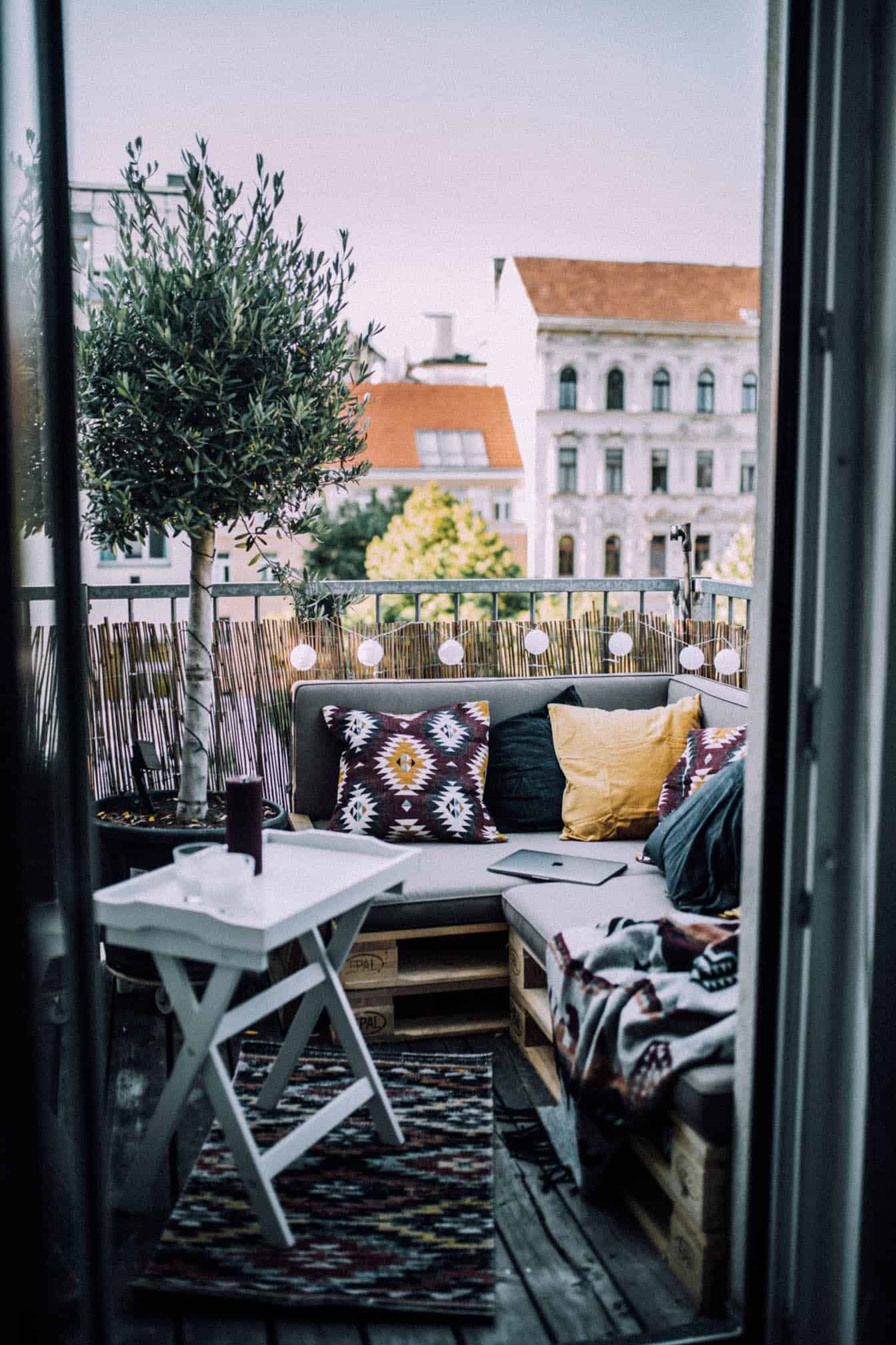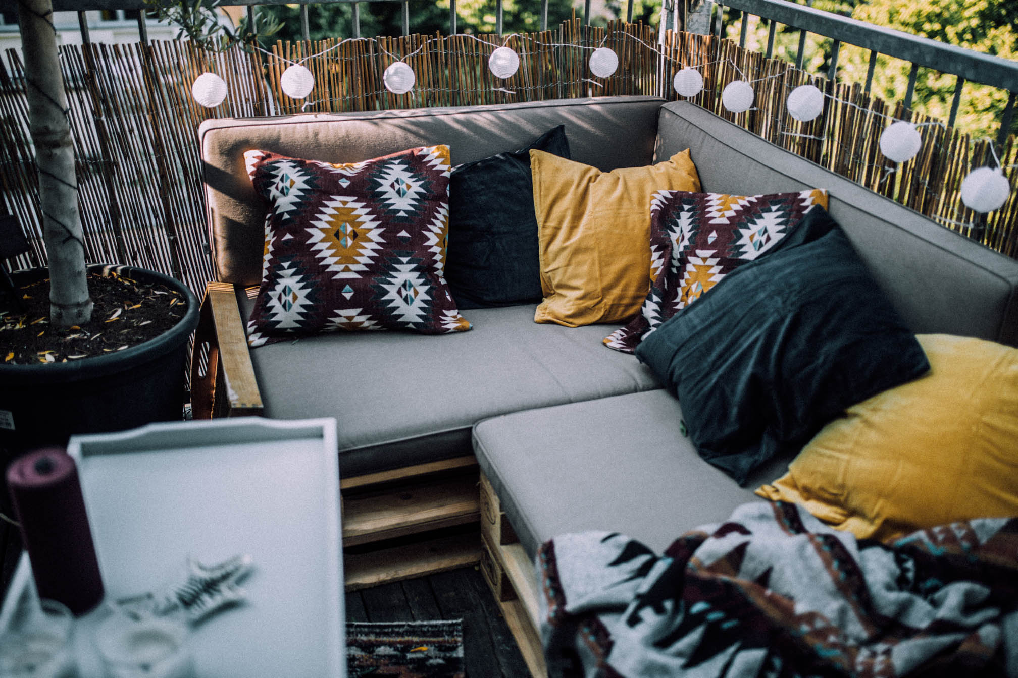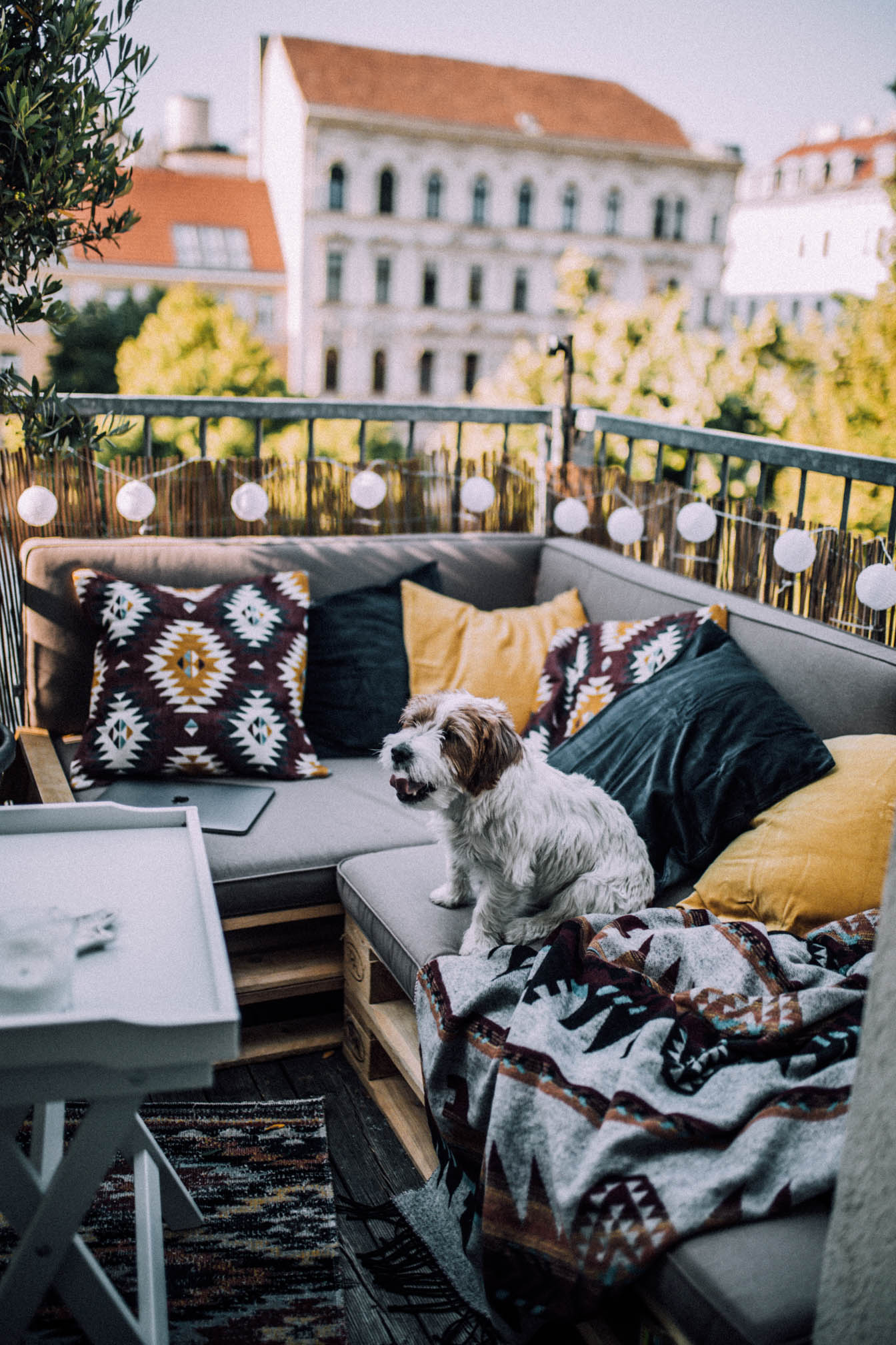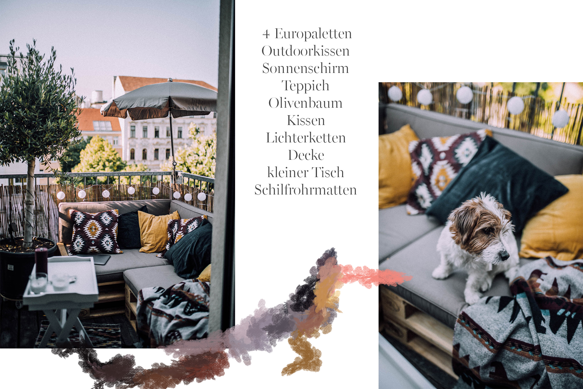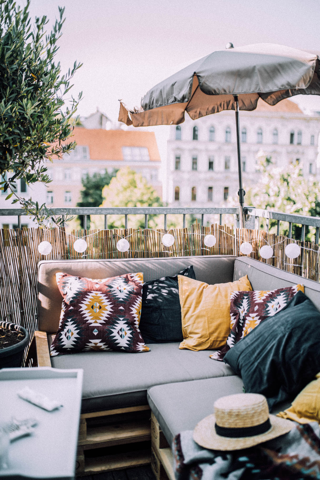 Eigentlich ist es wirklich keine Hexerei und man braucht nur ein paar wenige Dinge um den Balkon in ein kleines Paradies zu verwandeln. Da es eher schwer ist für so eine kleine Fläche eine Sitzecke zu finden und mir das Rustikale sowieso viel besser gefällt, habe ich mich für Europaletten entschieden. Die bekommt man in jedem Bauhaus oder online auf Amazon und man muss eigentlich nicht viel damit machen. Einfach übereinander stellen, zusammenschieben und fertig. Wer kein Fan von den klassischen Paletten ist, kann sich auch einfach lackierte kaufen, oder Geld sparen und sie selber anstreichen. Auch die Auflagen für die Paletten gibt es mittlerweile in allen Farben und Formen und man hat hier echt ziemlich viele Möglichkeiten. Damit ich einen Sichtschutz habe und auch Tobi bzw. sein Spielzeug sicher ist habe ich mich für eine Schilfrohrmatte entschieden, die einfach mit Kabelbinder befestigt wurde. Mein absolutes Highlight (neben den schönen Kissen), ist eindeutig mein Olivenbaum. Anfangs habe ich überlegt mir eine Palme hinzustellen, aber irgendwie fand ich die Idee mit dem Olivenbaum dann doch besser. Außerdem ist er sehr einfach zu pflegen und bis Oktober/November kann er im freien bleiben. Er war zwar etwas teurer, aber dafür ist er wunderschön und verleiht meinem Balkon das gewisse Etwas. All diese Dinge habe ich bei Obi gekauft und ich muss sagen ich war wirklich überrascht wieviel Auswahl es dort gibt. Die Lichterketten (HIER & HIER), den Teppich, die Kissen und auch den Tisch habe ich dann noch online bestellt. Achja und die hübsche Decke ist von Sackcloth & Ashes und hat ein kleines Vermögen gekostet, aber man gönnt sich ja sonst nichts, gell?