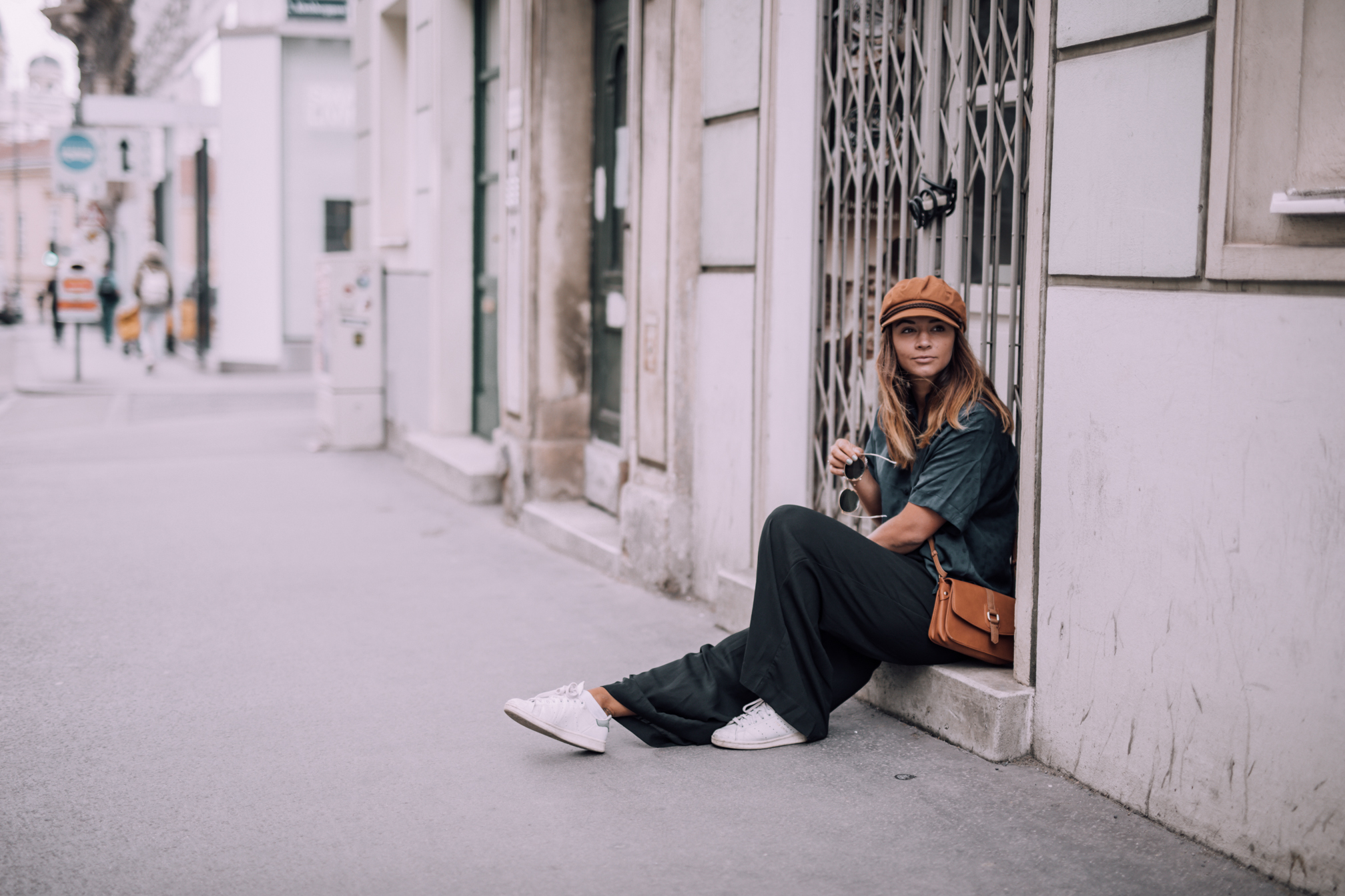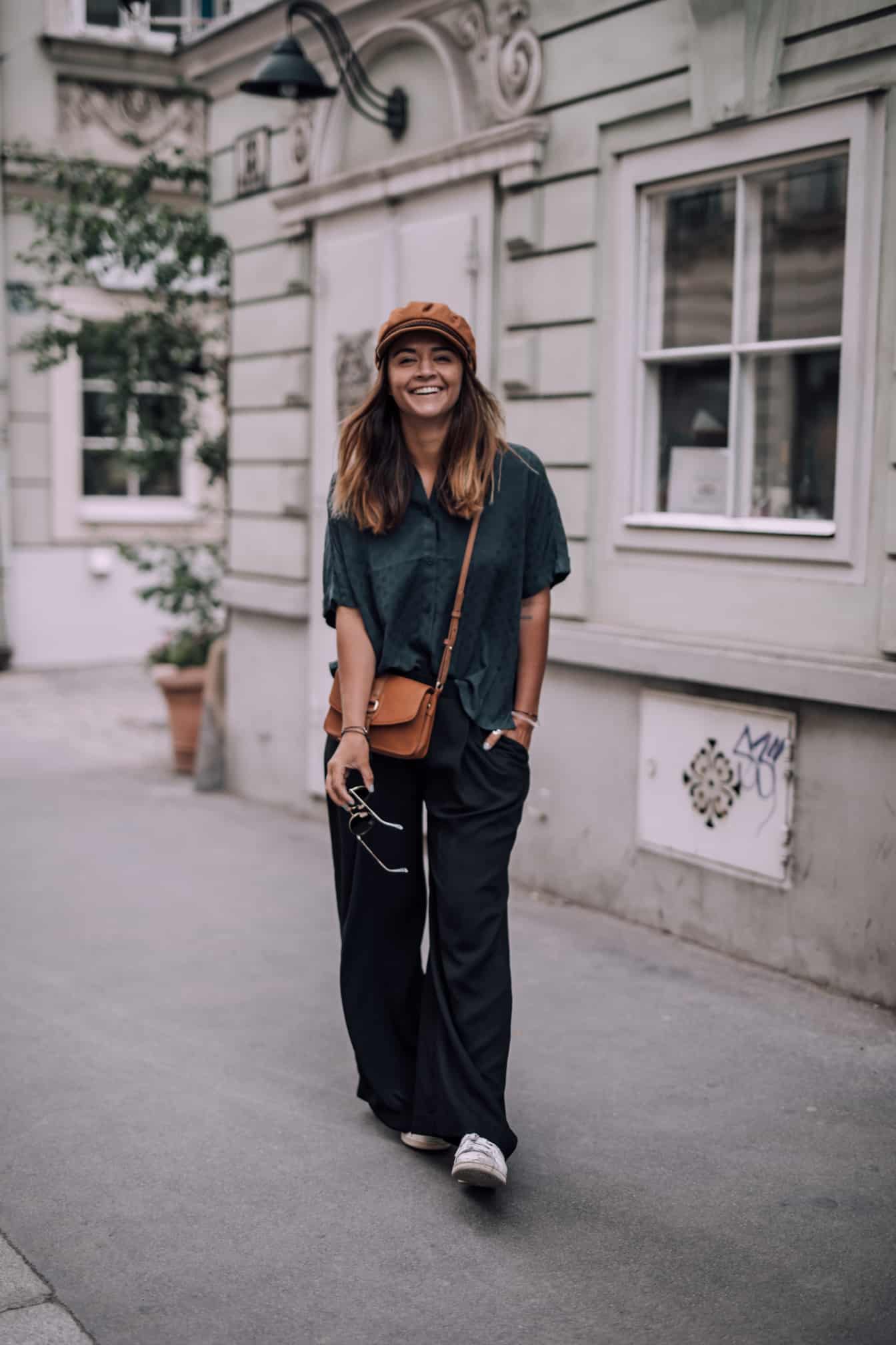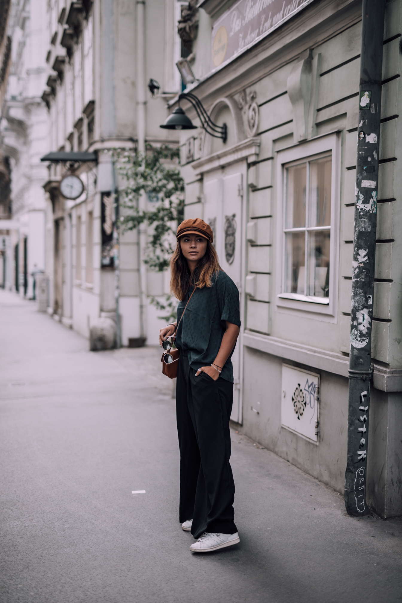 Hose - H&M (alt, ähnliche HIER) || Bluse - &Otherstories || Schuhe - Adidas Stan Smith (ähnliche HIER) Kappe- Brixton (ähnliche HIER) || Tasche - Urban Outfitters (alt, ähnliche HIER) || Sonnenbrille - Ray Ban