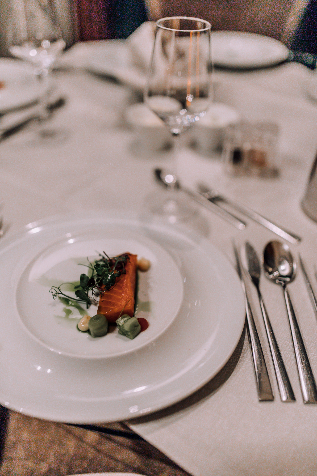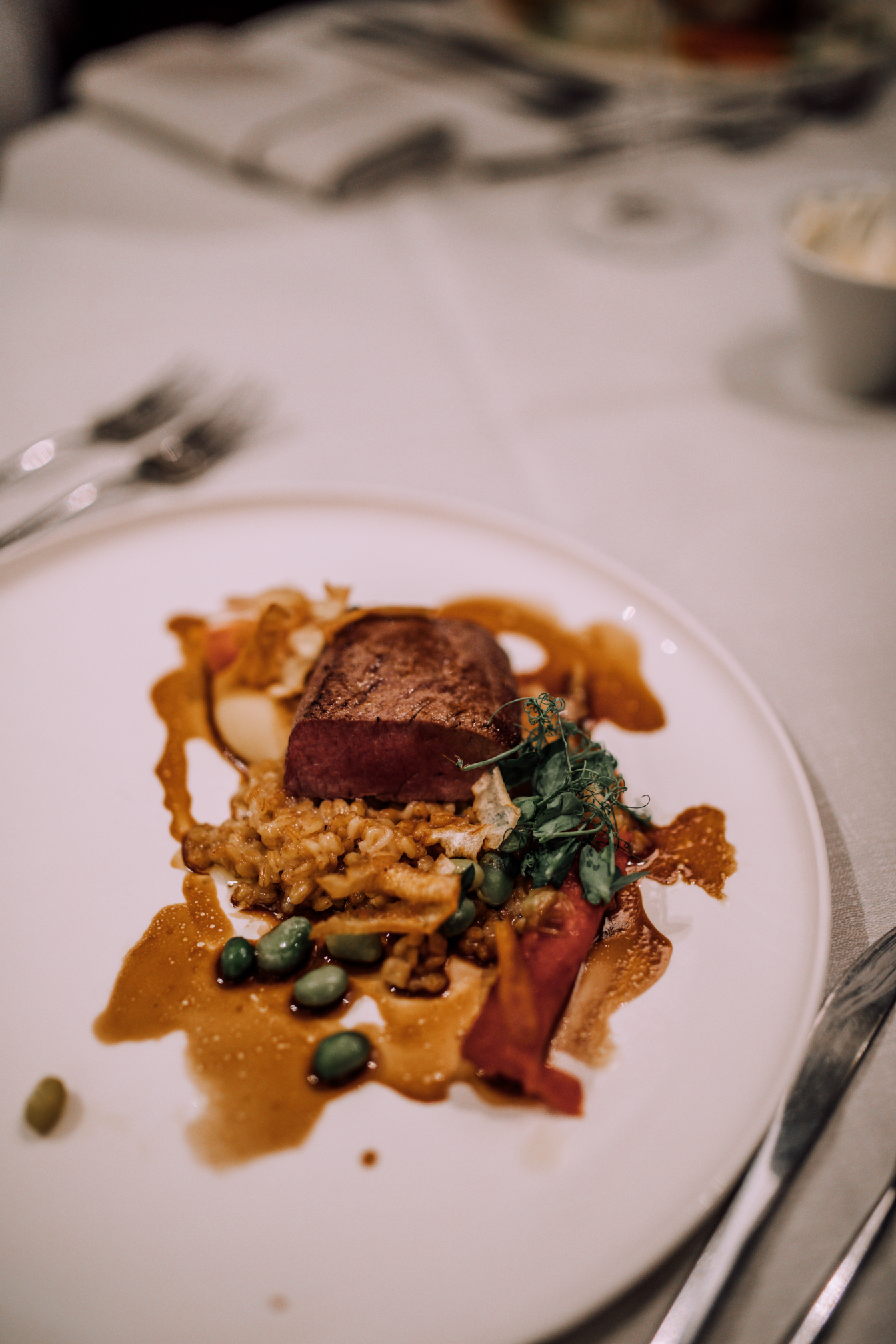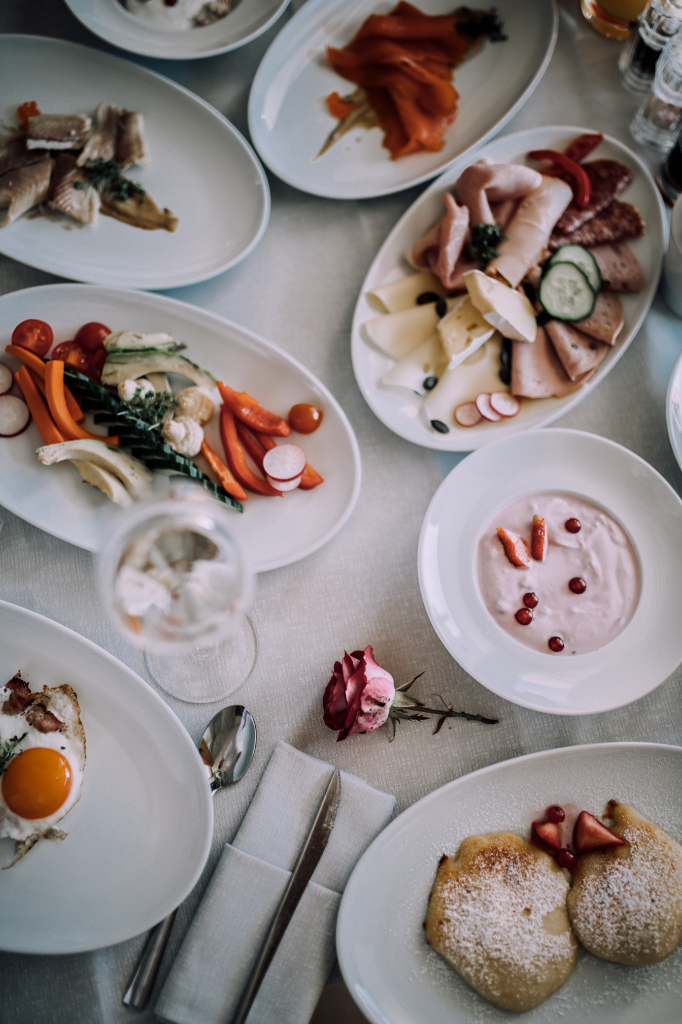 Auch das Essen möchte ich euch auf keinen Fall vorenthalten, denn wir haben uns natürlich auch ordentlich die Bäuche vollgeschlagen. Das tolle an Geinberg5 ist, dass man auch hier entscheiden kann, ob man für einen Aufschlag von 10 Euro lieber zu zweit in der Suite speist, oder ob man es sich im Restaurant bequem macht. Wir wollten ja beides ausprobieren, damit man einfach alles gesehen hat. Auch wenn das Ambiente im Restaurant sehr nett war, muss ich gestehen, dass es dann doch noch mal gemütlicher ist, wenn man sein Frühstück und Abendessen einfach im Bademantel im eigenen Zimmer genießen kann. Man bestellt ganz unkompliziert mittels iPad und zur gewünschten Zeit steht das Essen dann auch bereit. Die Auswahl beim Frühstück war einfach riesig und ja wir mussten einfach alles ausprobieren, denn wer kann sich schon zwischen Pancakes, Spiegelei, Weißwurst und Fruchtjoghurt entscheiden. Abends gab es dann ein 4 Gang Menü, wo man natürlich zwischen 2 unterschiedlichen Gerichten wählen konnte. Auch kulinarisch wird man im Geinberg5 verwöhnt und nur wenn ich an das Essen denke, läuft mir das Wasser im Mund zusammen. Nicht umsonst ist das Restaurant mit zwei Hauben ausgezeichnet.
