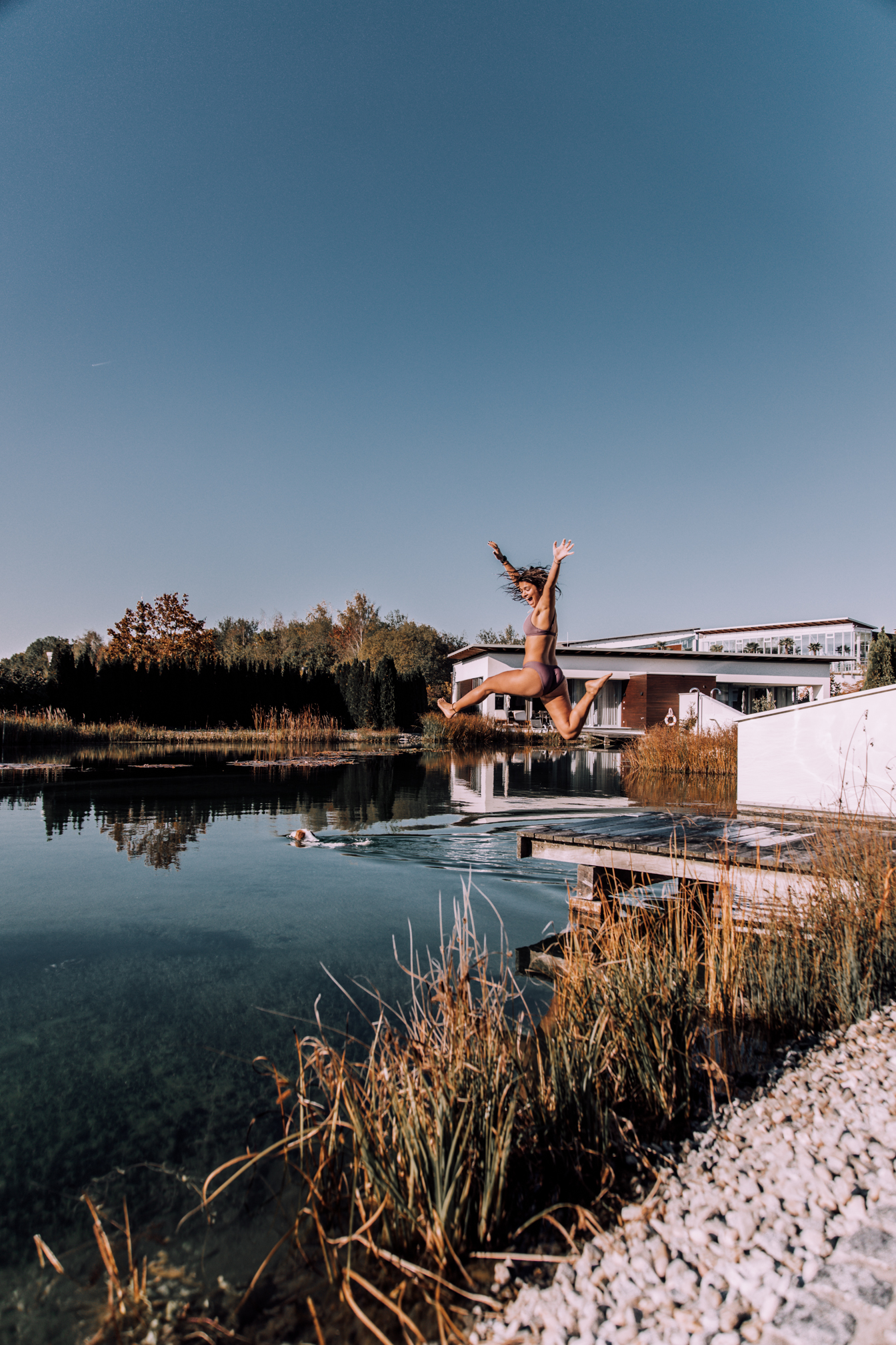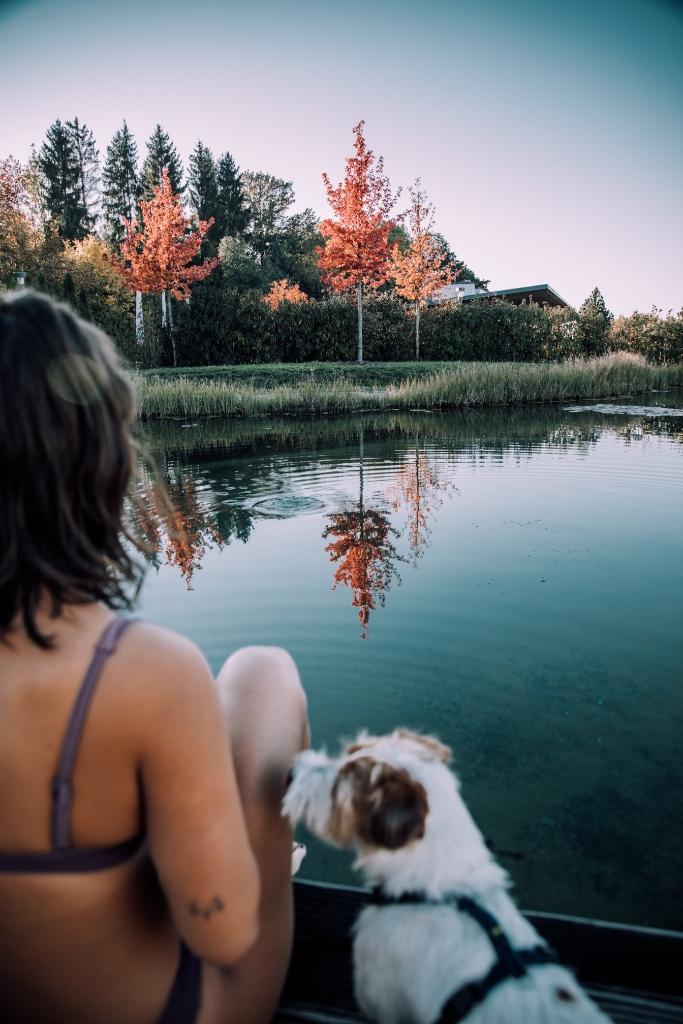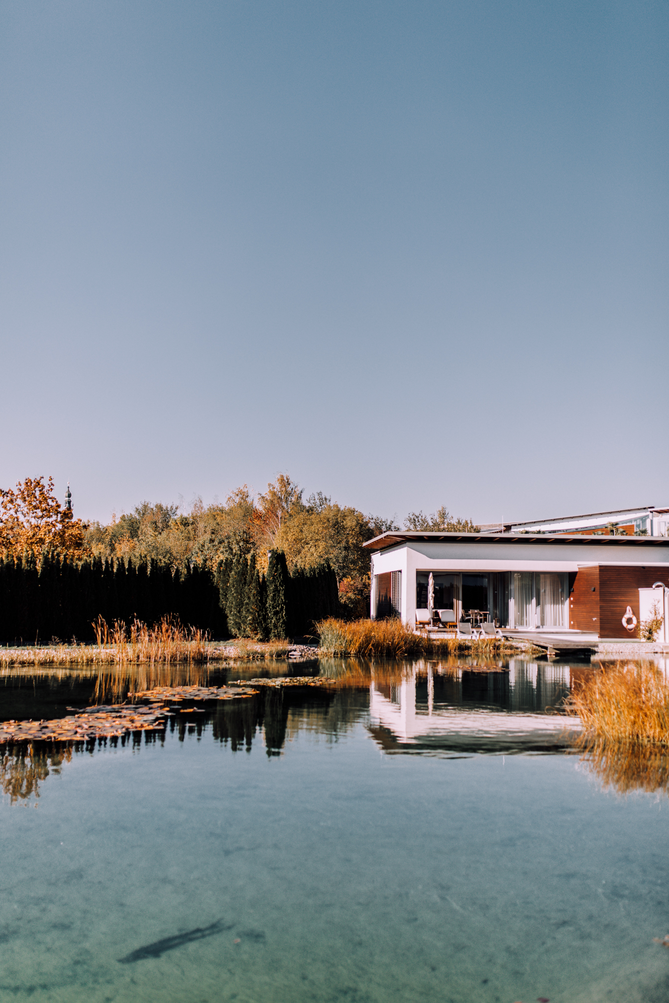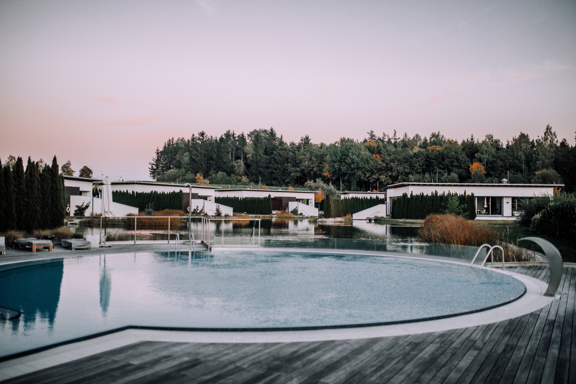 Das Geinberg5 ist wirklich ein Wellness-Resort der ganz besonderen Art. Hier wird einem jeder Wunsch von den Lippen abgelesen und wenn man möchte braucht man sein Zimmer während des gesamten Aufenthaltes nicht verlassen. Ihr fragt euch sicher, wie jetzt? Wellnessen fahren und dann nur im Zimmer hocken. Ja ganz genau, denn wenn das Zimmer, eine 114qm Suite mit eigener Sauna, Dampfbad, Whirlpool und eigenem Zugang zum Naturteich ist, lässt es sich schon ein bisschen aushalten. Sogar das Essen kann man sich aufs Zimmer liefern lassen und muss somit eigentlich keinen Fuß vor die Türe setzen, wenn man das nicht möchte. Eine Auszeit der anderen Art und hier kann man sich wirklich voll und ganz auf das Wesentliche konzentrieren. Am meisten wurde bei uns eindeutig der Whirlpool genutzt, denn was gibt es besseres als mit guter Musik im warmen sprudelndem Wasser zu sitzen und den Ausblick auf den wunderschönen Naturteich und die bunten Bäume zu genießen. Es war wirklich traumhaft und wenn ich ganz ehrlich bin, hätte ich es schon noch ein paar Tage ausgehalten. Zuerst entspannt in der Natur spazieren gehen oder laufen, gut essen, ein bisschen wellnessen, in der Sonne ein gutes Buch lesen und abends wird dann noch der Kamin angemacht, die Sauna eingeheizt und ein Gläschen (oder zwei) Rotwein getrunken - ja diese kleine Auszeit war einfach perfekt und es war schön den Alltag mal vor der Tür zu lassen.