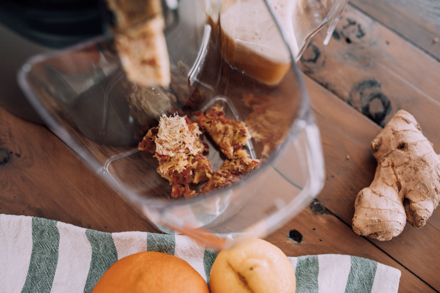 Orangen schälen und gemeinsam mit dem Ingwer in den Entsafter geben und zum Schluss noch den Kurkuma hinzufügen und gut schütteln. Vorsicht mit diesem Shot, Kurkuma färbt nämlich ziemlich ab und ich habe mir schon mal einen Schreibtisch damit zerstört.