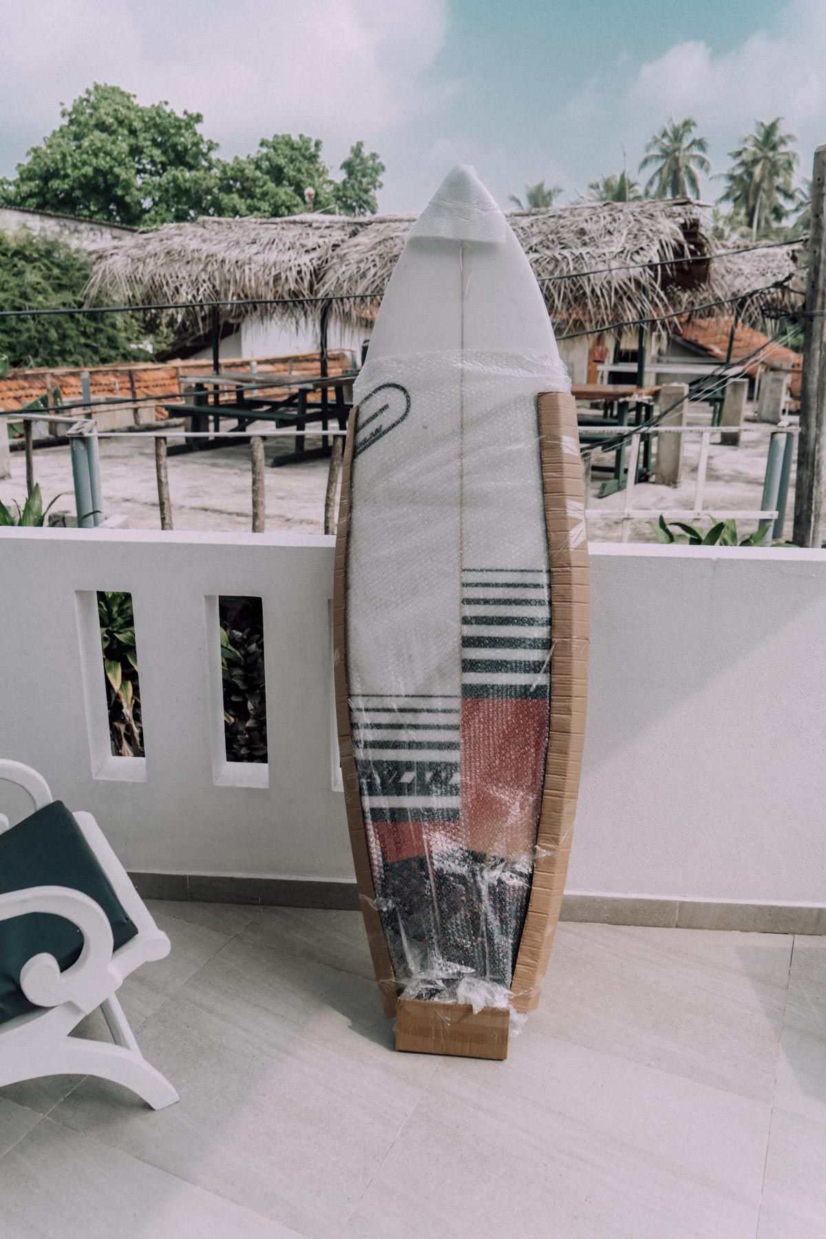 Damit das Brett den Flug gut übersteht wurde es mit Luftpolsterfolie und Karton verpackt, in eine Surfsocke gesteckt und dann ins Surfbag gepackt. Ich hatte echt Angst und war übervorsichtig, denn dieses Brett habe ich mir in Bali gekauft und es hat irgendwie eine ganz besondere Bedeutung für mich. Es hat bis auf eine ganz kleine Delle (mein Herz hat geblutet) die nicht weiter schlimm war den Flug gut überstanden.