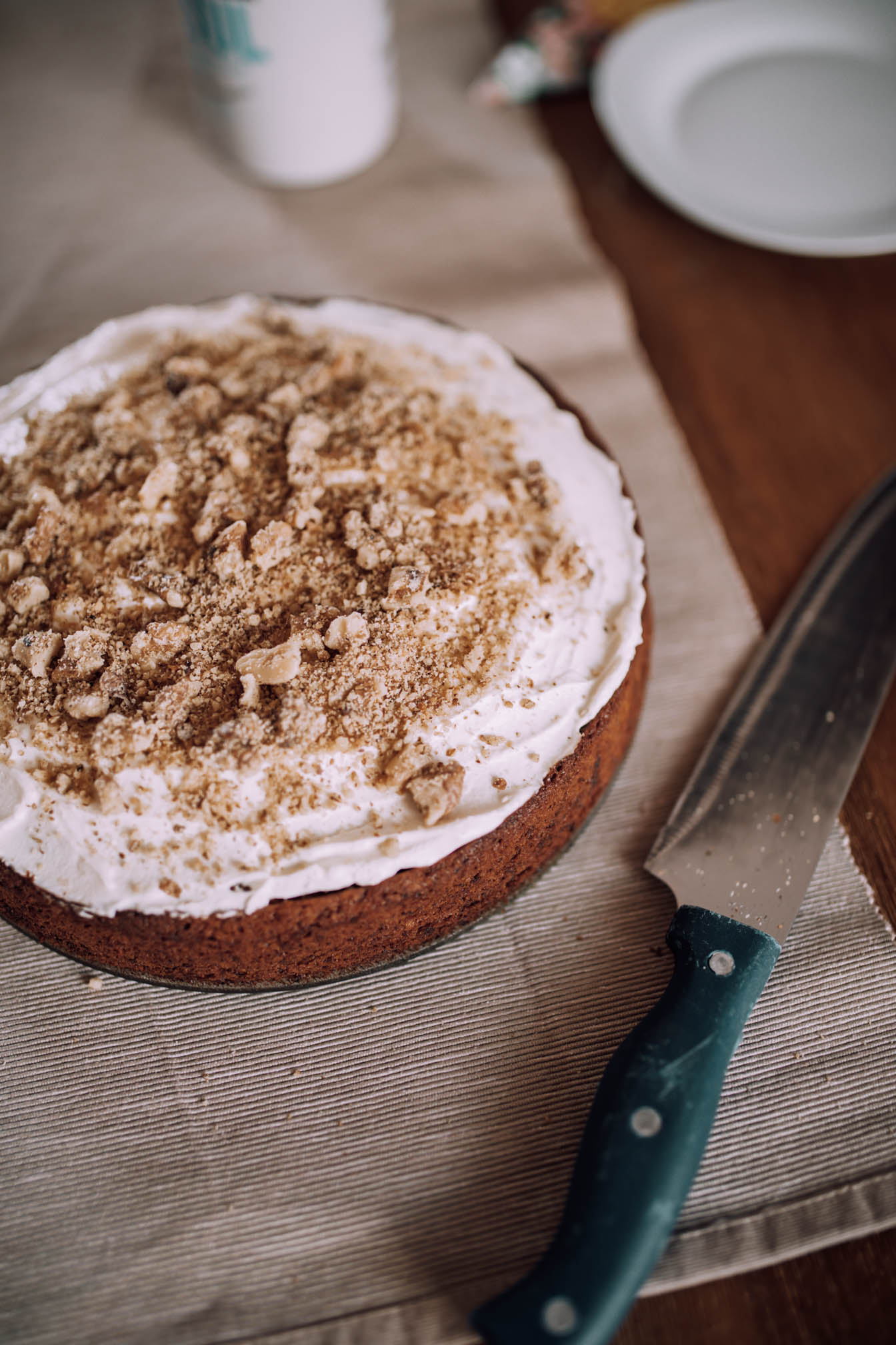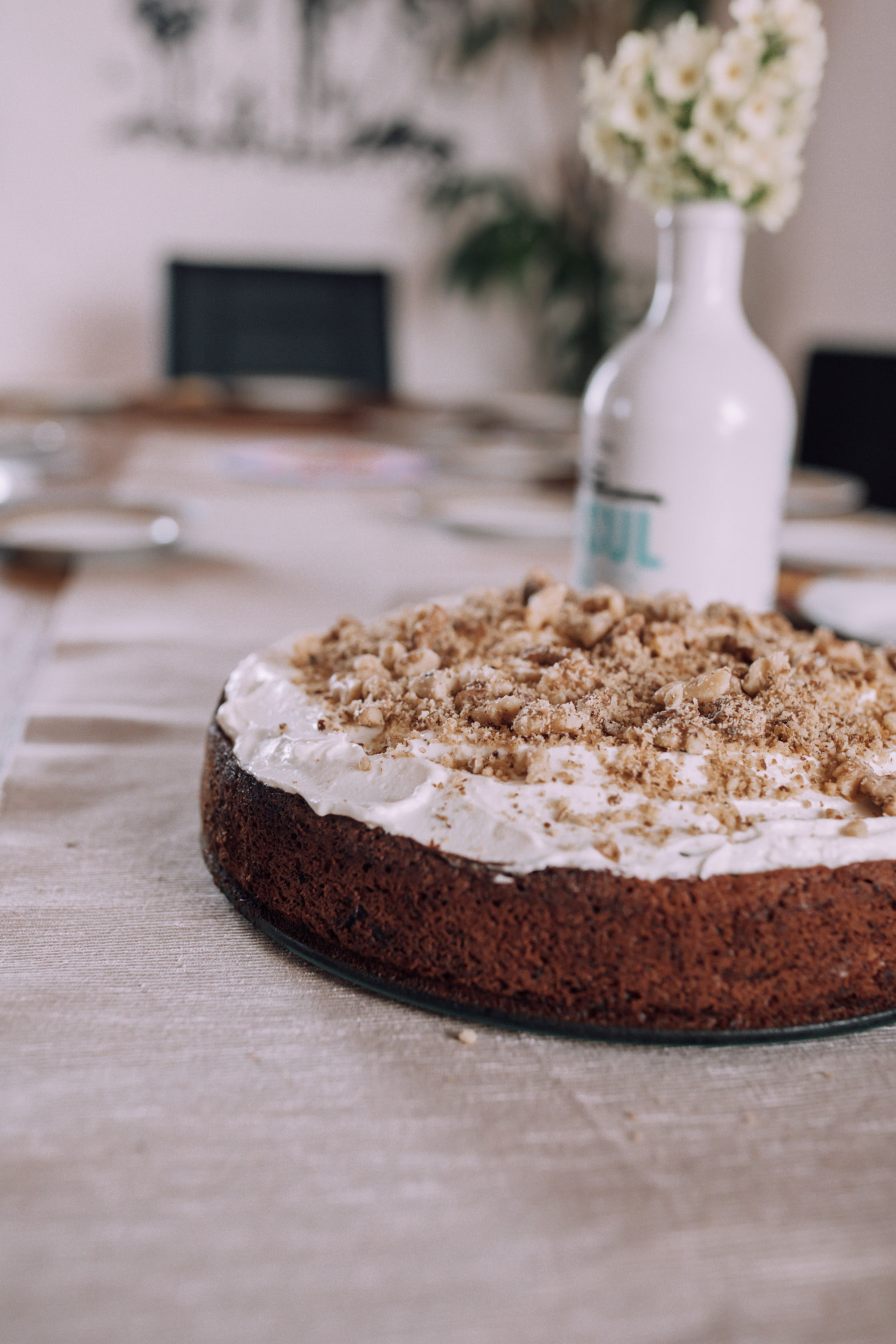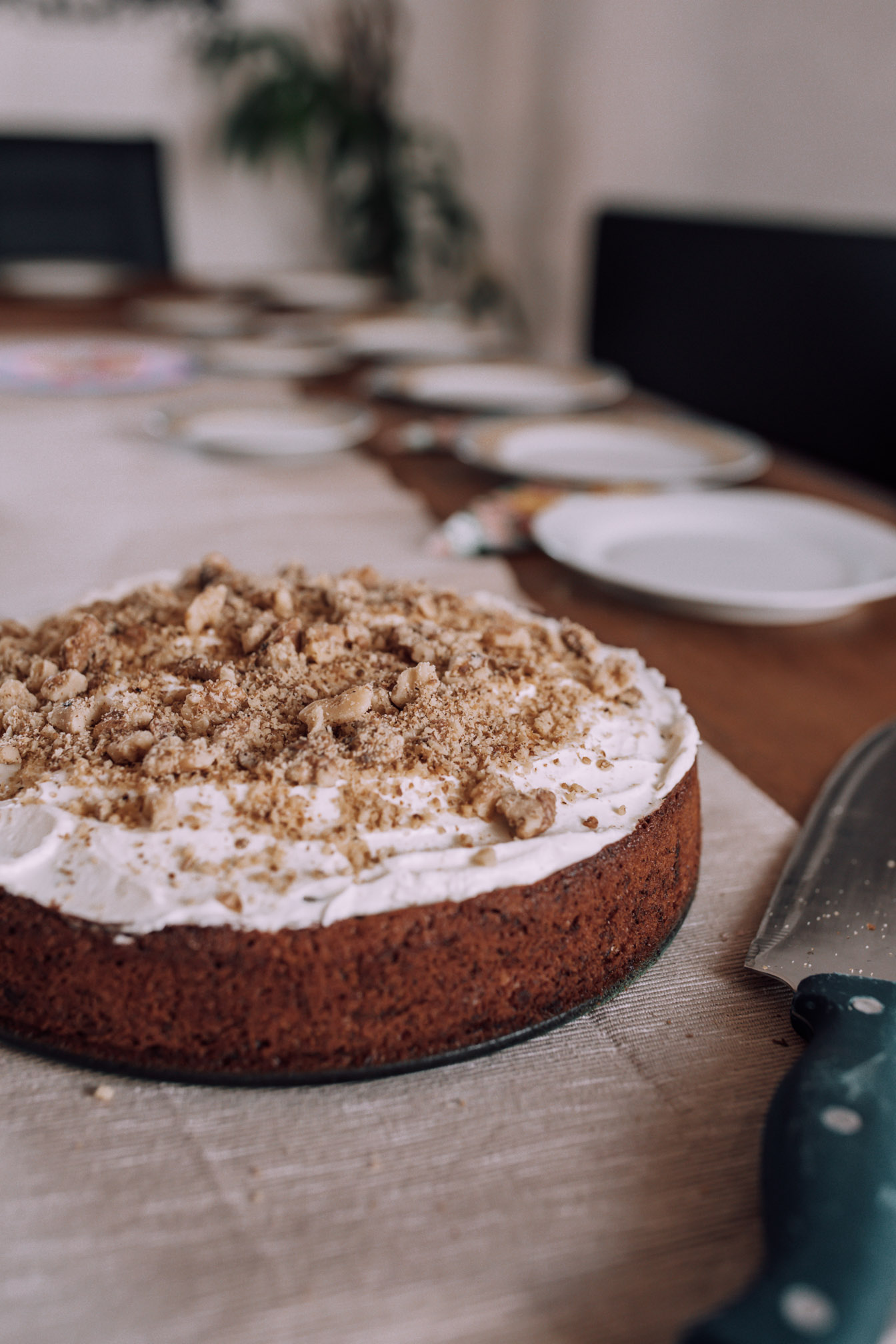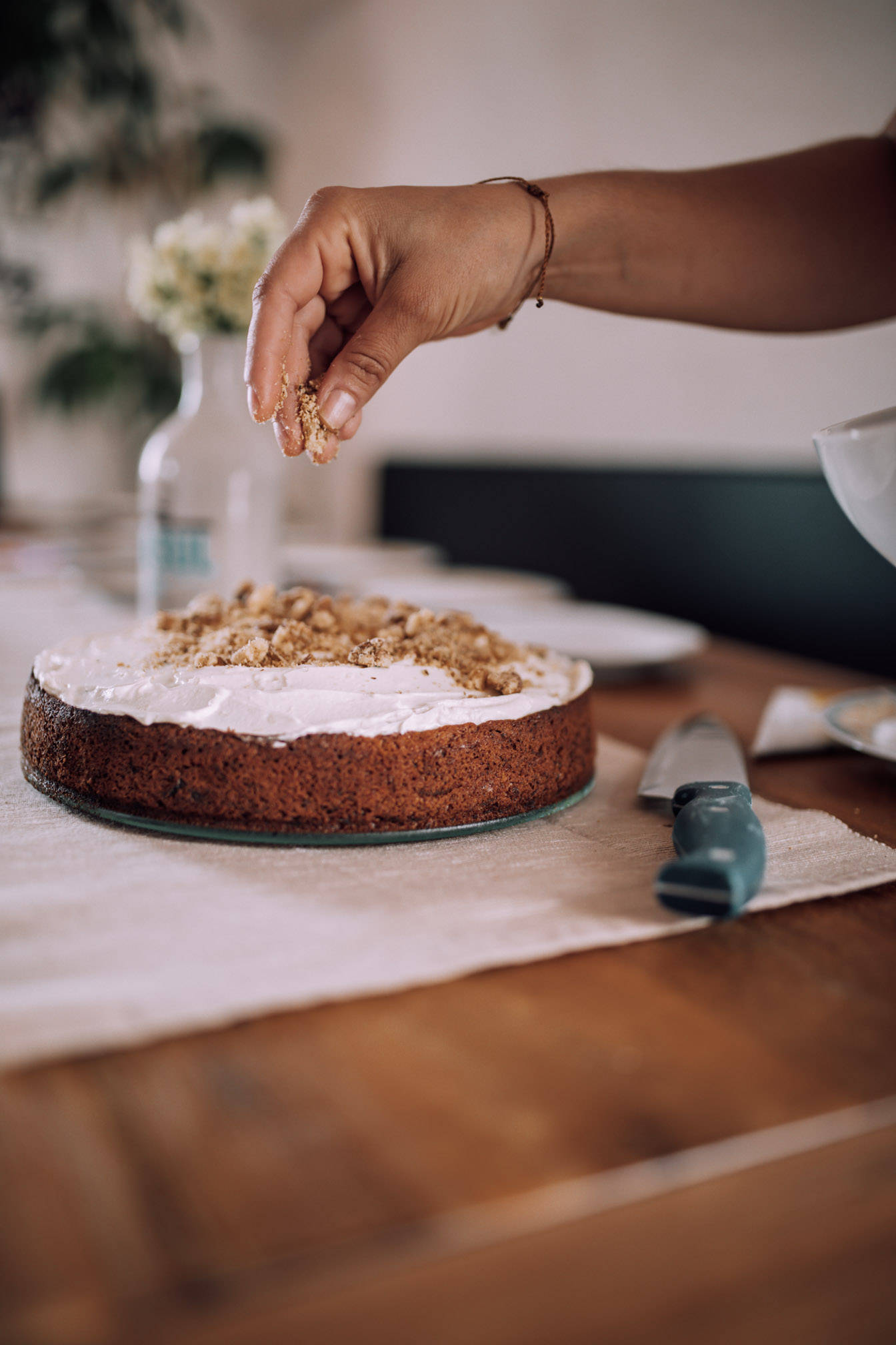 - Zum Schluss könnt ihr noch ein paar ganze Walnüssen in der Hand in Stücke brechen und über den Kuchen streuen.
