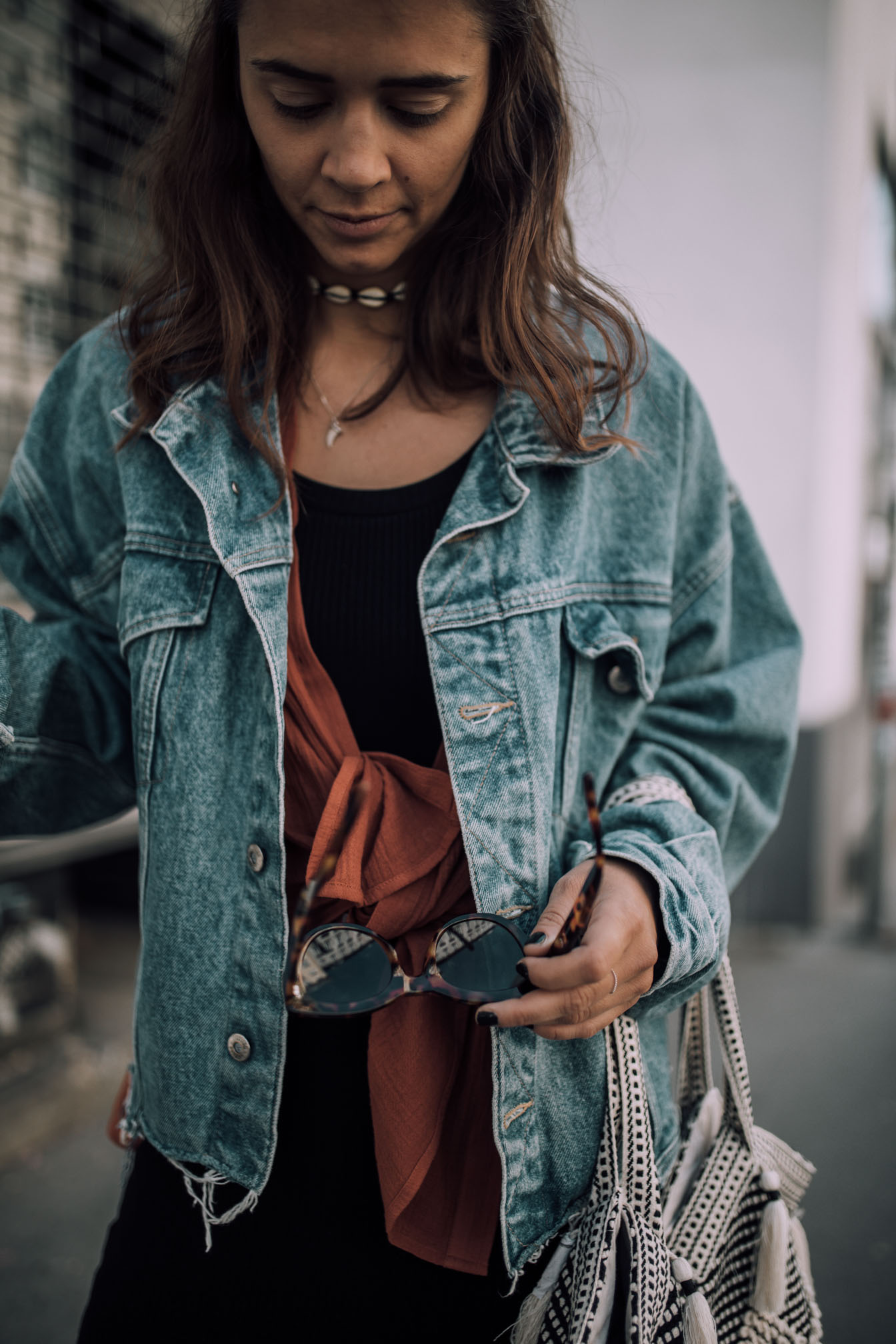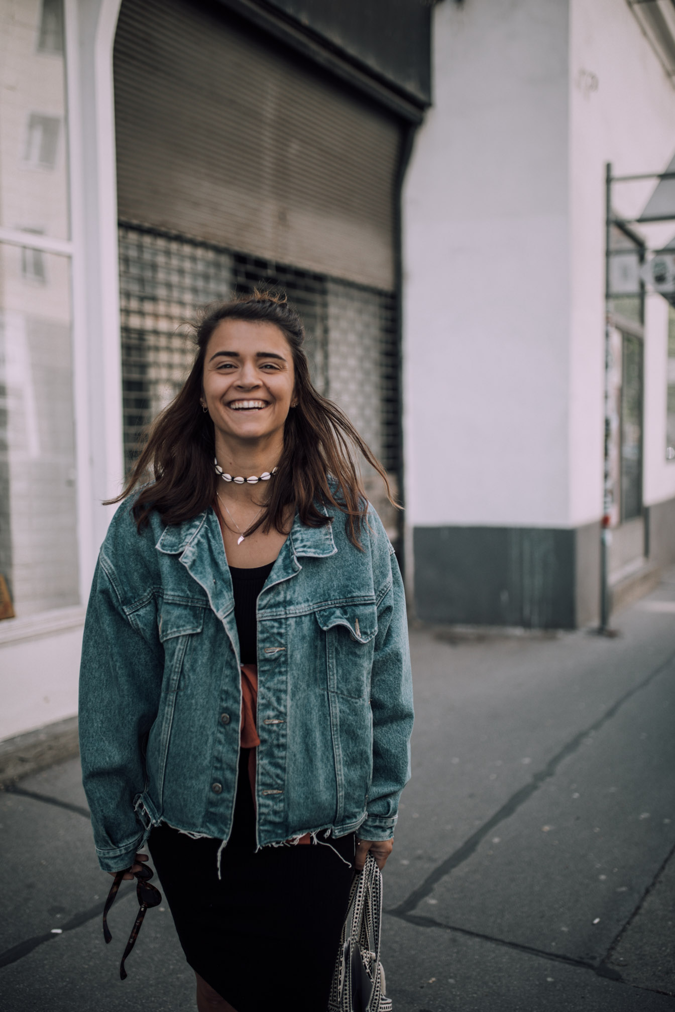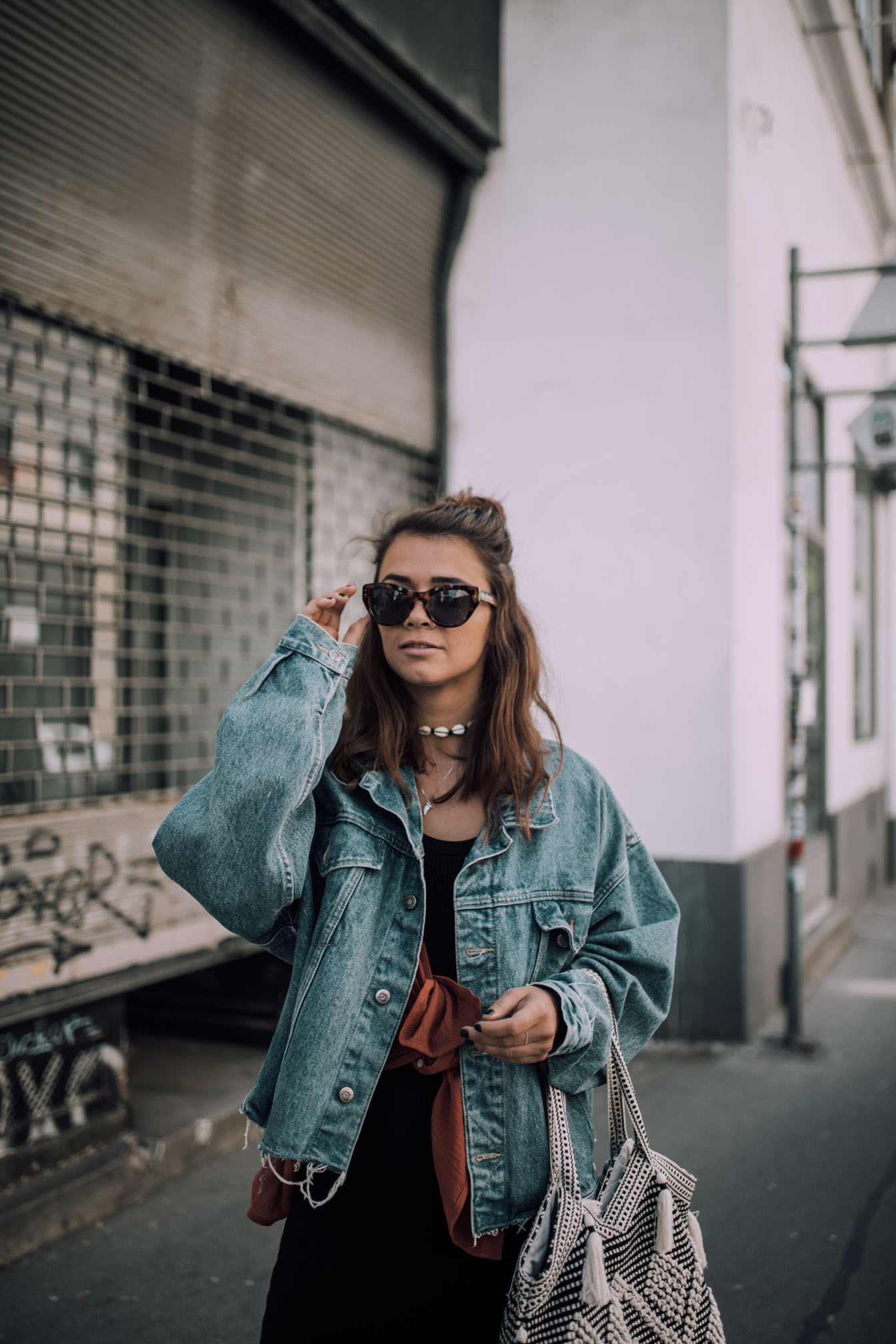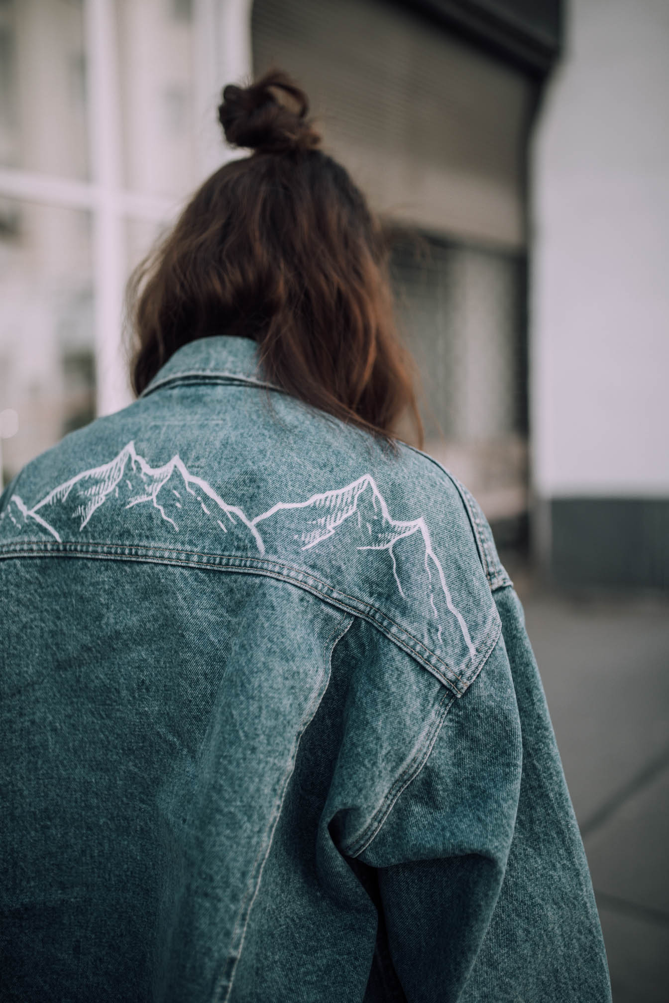 Ach wie schön war das letzte Woche, endlich einen Tag ohne Hose raus zu gehen. Die liebe (erfrorene) Denise hat mich zwar gefragt ob ich noch ganz dicht bin, aber es war echt schon richtig warm und das musste ich einfach ausnutzen. Tja und wenn ich jetzt so aus dem Fenster schauen, bin ich froh darüber, denn momentan sieht es eher nicht so prickelnd aus und wenn es so weiter geht, packe ich doch nochmal die Winterjacke aus. Am Wochenende soll es aber endlich wieder ein bisschen wärmer werden und ich hoffe es so sehr, denn ich bin schon so richtig in Sommerstimmung. Seit einigen Monaten bin ich total verrückt nach erdigen Tönen und dieses rostrote Hemd wird auf jeden Fall auch für den nächsten Urlaub am Meer eingepackt. Außerdem habe ich mir vorgenommen, mehr auf Second Hand Mode zu setzen. Denn ersten gibt es nicht nur ziemlich viele coole Läden in Wien, sondern man bekommt so auch ganz besondere Teile, die Geschichten erzählen und nicht jeder hat. So wie zum Beispiel diese coole Jeansjacke, die ich vor kurzem der lieben Angela abgekauft habe. Eine Jacke mit Bergen, wie soll man da nur widerstehen.