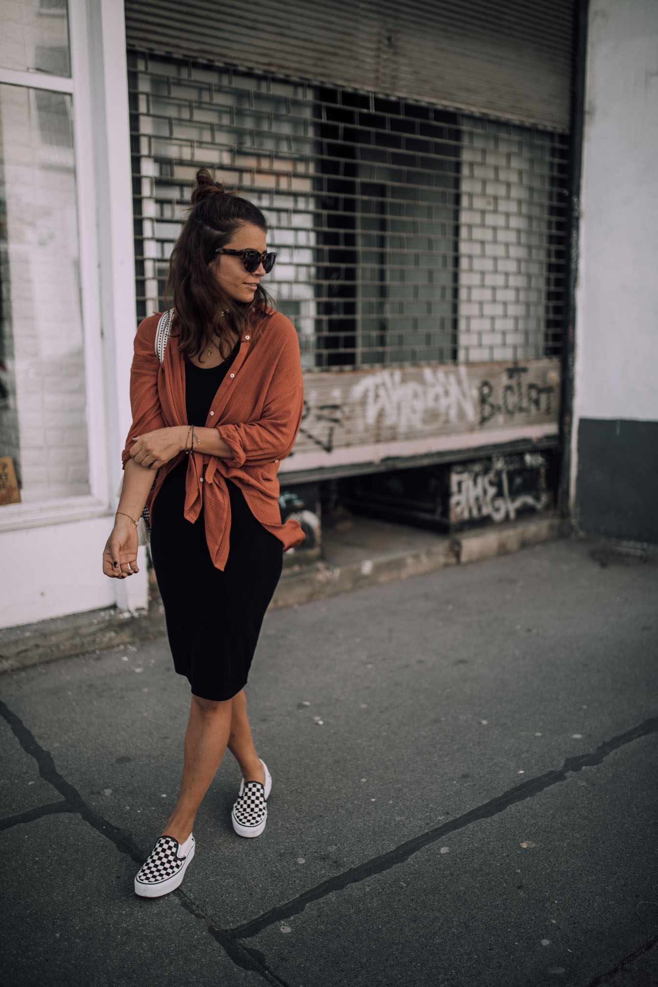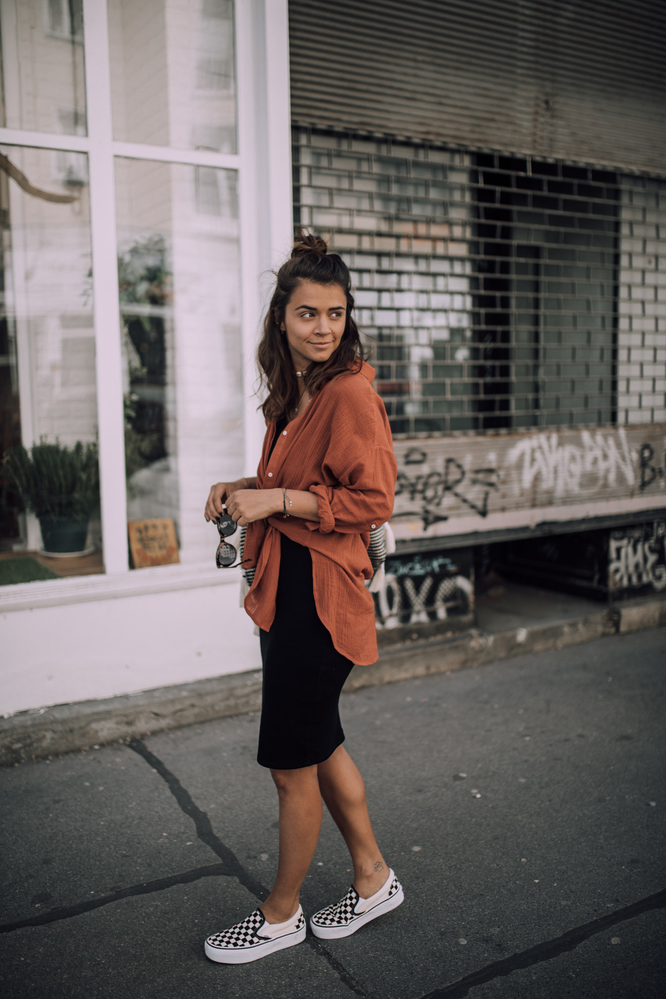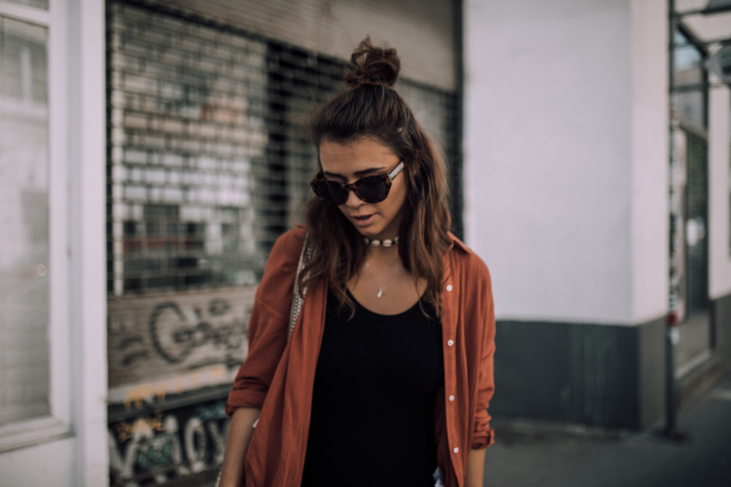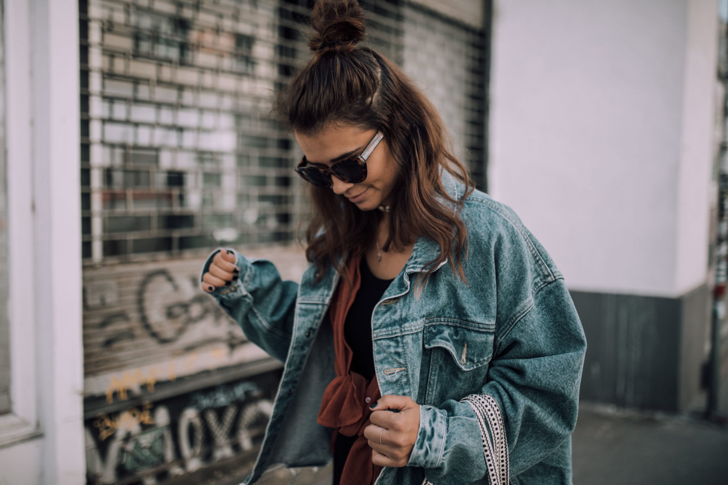 Ach wie schön war das letzte Woche, endlich einen Tag ohne Hose raus zu gehen. Die liebe (erfrorene) Denise hat mich zwar gefragt ob ich noch ganz dicht bin, aber es war echt schon richtig warm und das musste ich einfach ausnutzen. Tja und wenn ich jetzt so aus dem Fenster schauen, bin ich froh darüber, denn momentan sieht es eher nicht so prickelnd aus und wenn es so weiter geht, packe ich doch nochmal die Winterjacke aus. Am Wochenende soll es aber endlich wieder ein bisschen wärmer werden und ich hoffe es so sehr, denn ich bin schon so richtig in Sommerstimmung. Seit einigen Monaten bin ich total verrückt nach erdigen Tönen und dieses rostrote Hemd wird auf jeden Fall auch für den nächsten Urlaub am Meer eingepackt. Außerdem habe ich mir vorgenommen, mehr auf Second Hand Mode zu setzen. Denn ersten gibt es nicht nur ziemlich viele coole Läden in Wien, sondern man bekommt so auch ganz besondere Teile, die Geschichten erzählen und nicht jeder hat. So wie zum Beispiel diese coole Jeansjacke, die ich vor kurzem der lieben Angela abgekauft habe. Eine Jacke mit Bergen, wie soll man da nur widerstehen.
