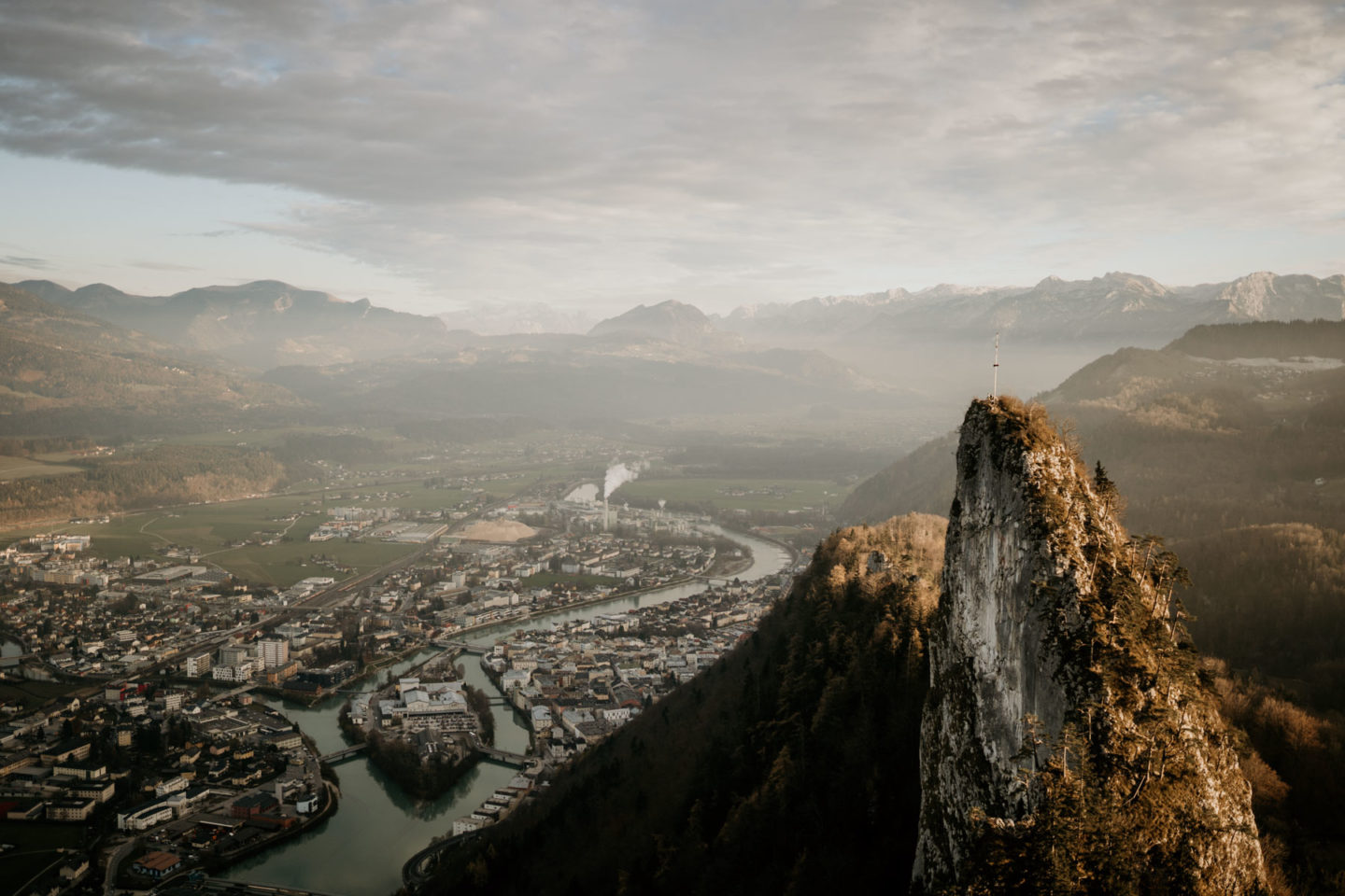 Oben angekommen wird man mit einer tollen Aussicht über Hallein belohnt. Ja und wer noch einen wunderschöne Blick auf den kleinen Barmstein haben möchte, sollte unbedingt die letzten Meter noch weitergehen. Einfach am Gipfelkreuz vorbei und dem kleinen Weg folgen - es zahlt sich wirklich aus und dauert keine 2 Minuten. Nach einer kleine Pause bin ich dann den selben Weg wieder retour gegangen. Eine wirklich nette und nicht zu lange Wanderung, die man auch mal schnell einschieben kann, denn in ca. 1,5 bis 2 Stunden ist man oben und wieder unten. Ja und wer noch nicht genug hat, kann am Rückweg noch Richtung kleinen Barmstein abbiegen. Der Anstieg dauert laut Wegbeschreibung ca. 15 Minuten. Selber war ich aber noch nicht oben. Da ich aber erfahren habe, dass es noch eine andere Tour auf den großen Barmstein über eine Ruine gibt, werde ich auf jeden Fall bald mal wieder spontan dort halten.