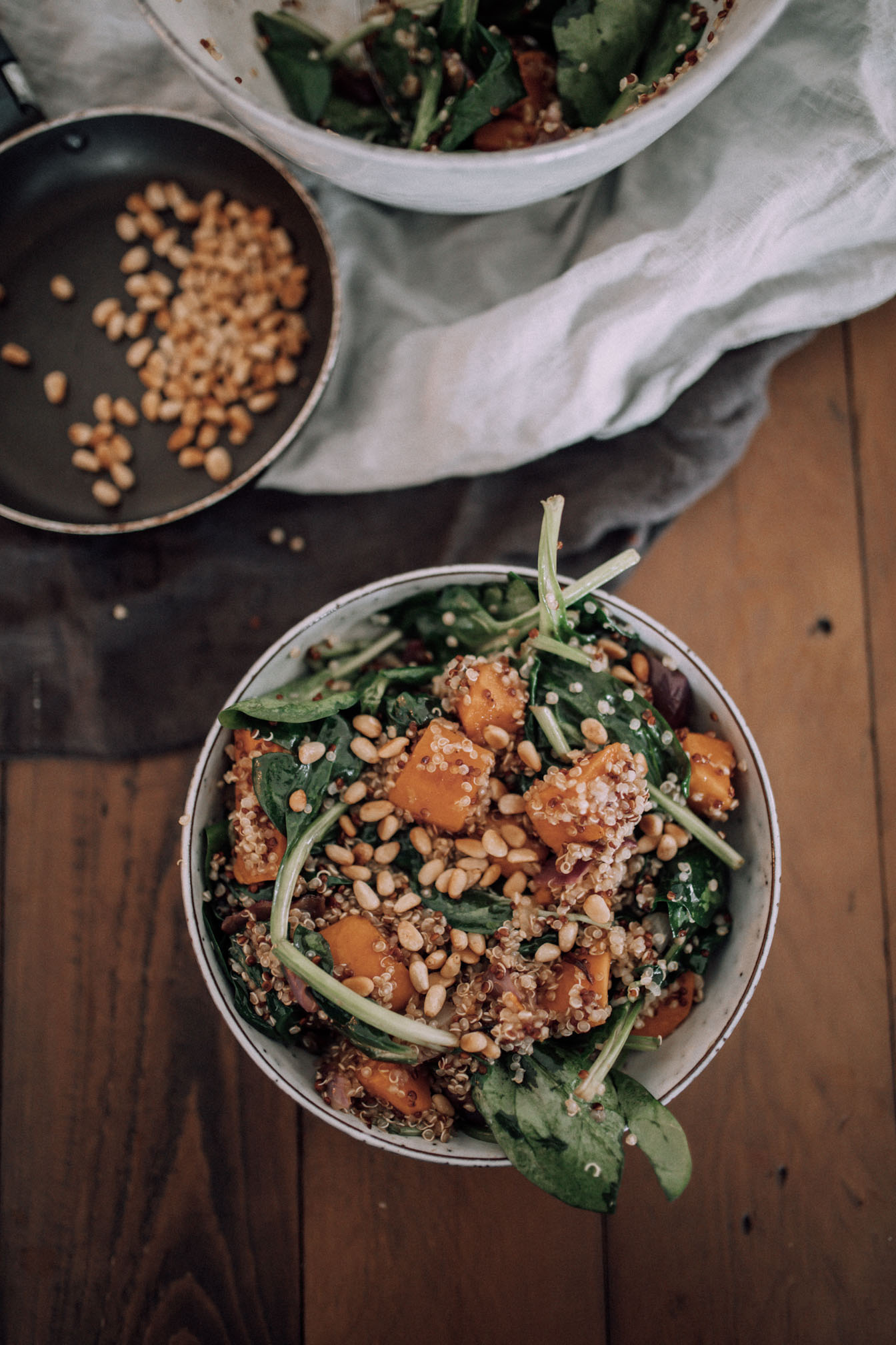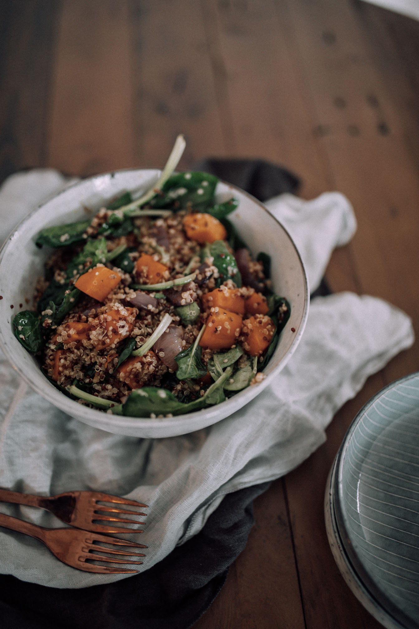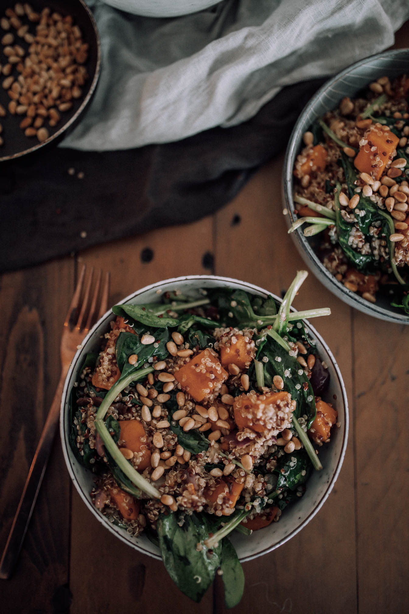 - Das Gemüse zusammen mit dem Blattspinat zum Quinoa geben.