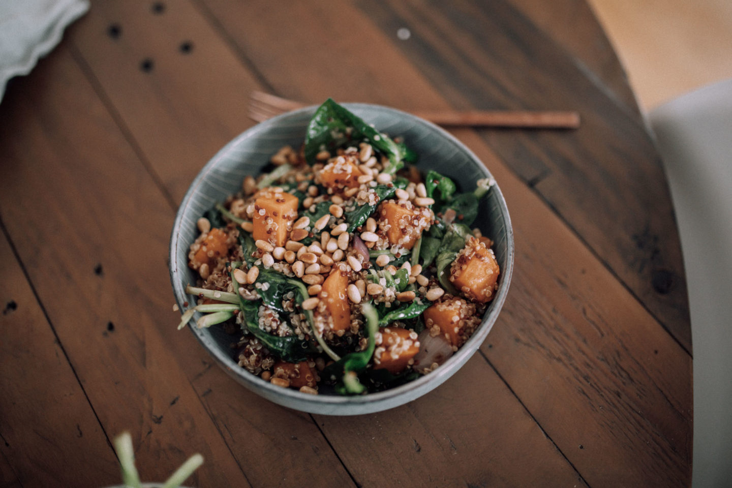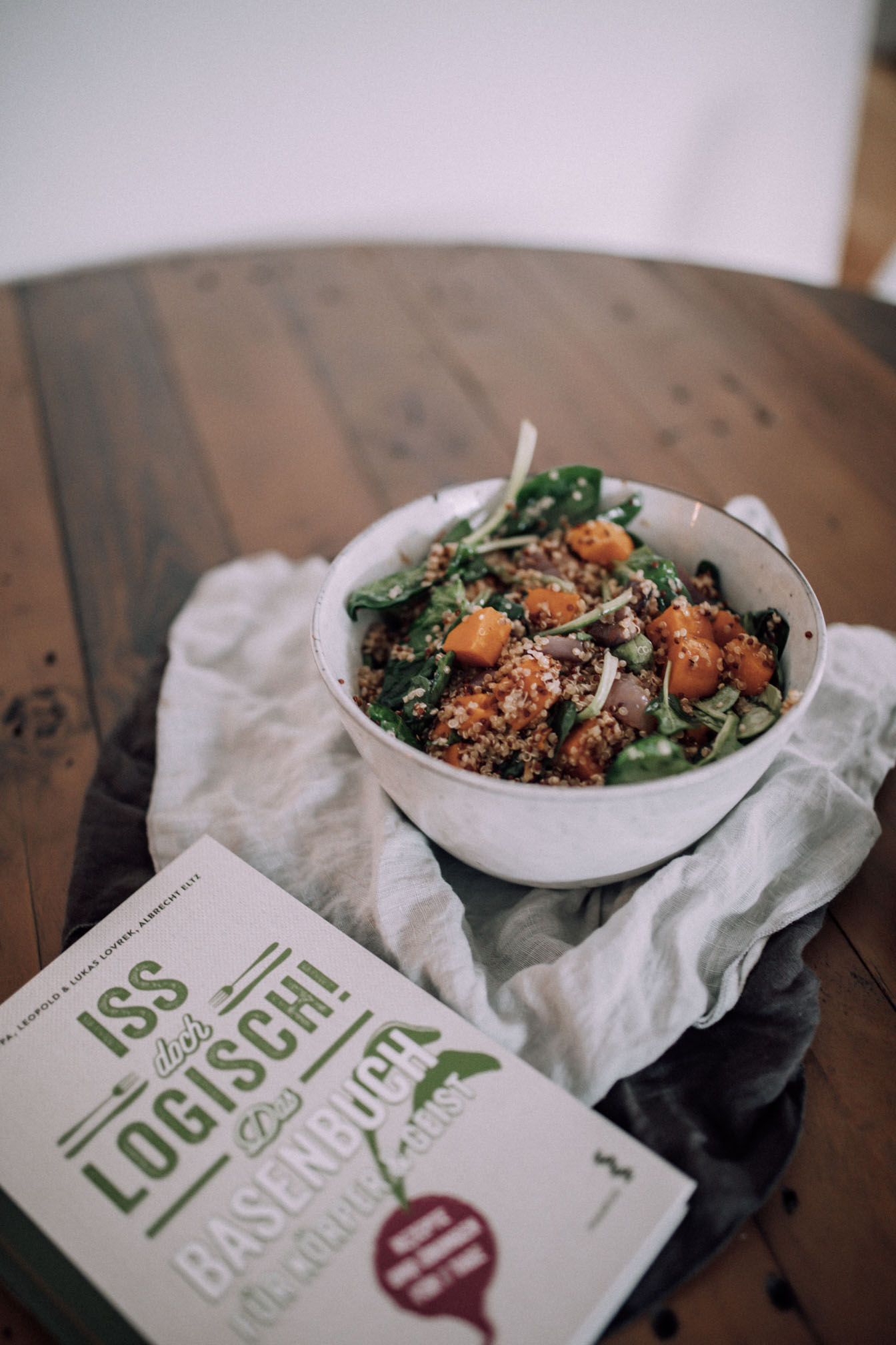 Es enthält einen Wochenplan mit basischen Gerichten für morgen, mittags und abends. Meine bisherigen Highlights waren die Gemüseaufstriche, eine richtig leckere Gemüse-Lasagne und dieser wirklich schnell zubereitete aber ausgezeichnete Quinoasalat mit Süßkartoffeln. Das Rezept dazu ist so leckere, dass ich es einfach mit euch teilen muss um euch damit auch ein bisschen auf den Geschmack zu bringen. Basische Gerichte können nämlich wirklich gut sein.