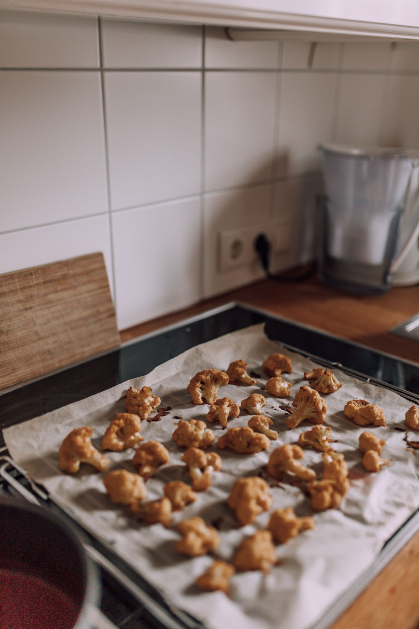 Karfiol für ca. 20 Minuten im Rohr backen, nach 10 Minuten wenden, damit alle Seiten goldbraun gebacken werden.