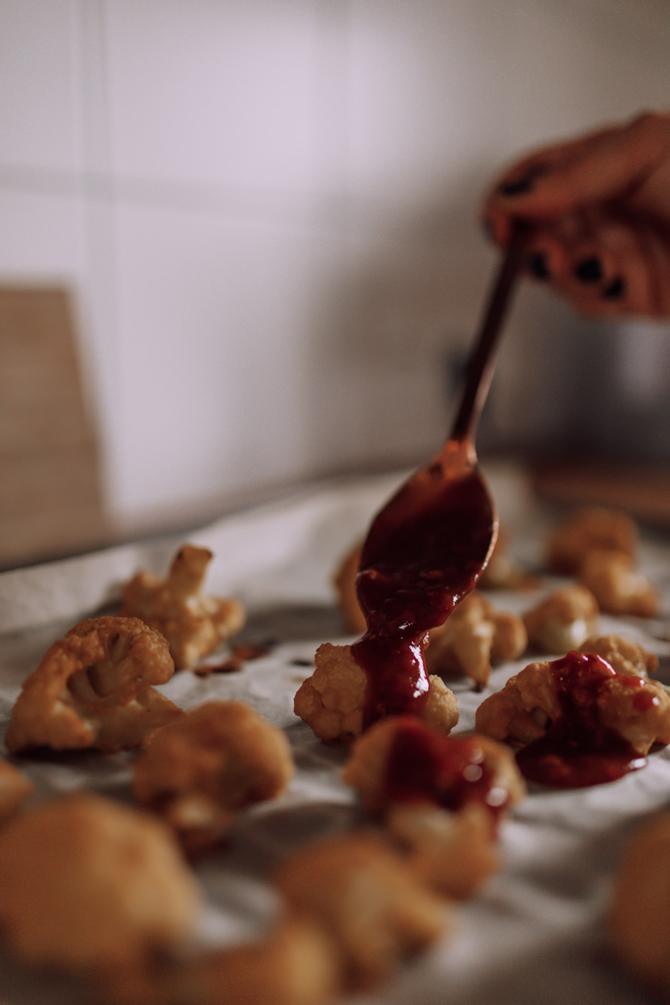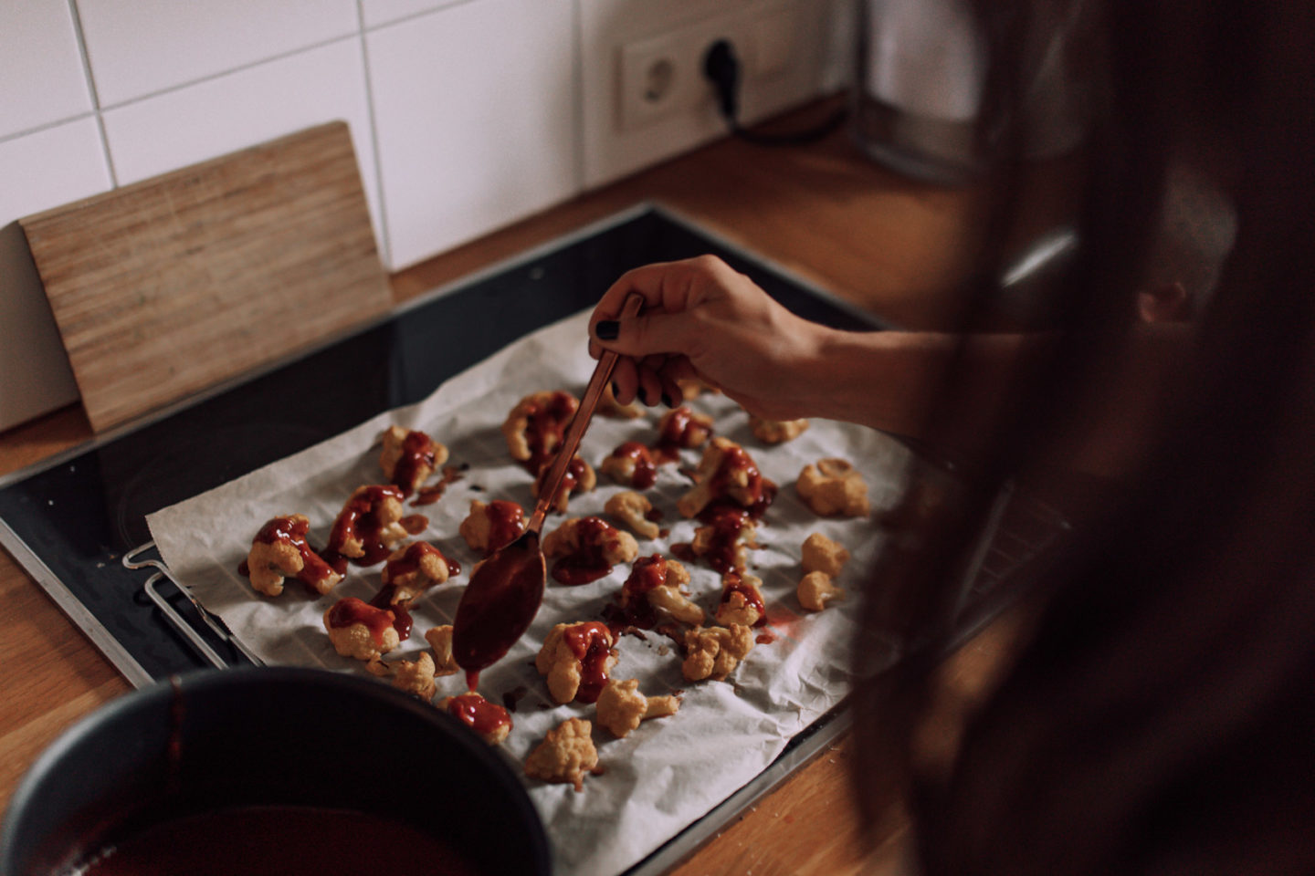 Karfiol nach den 20 Minuten aus dem Rohr nehmen, mit der selbstgemachten BBQ-Sauce bestreichen und nochmals 15 Minuten zurück ins Rohr.