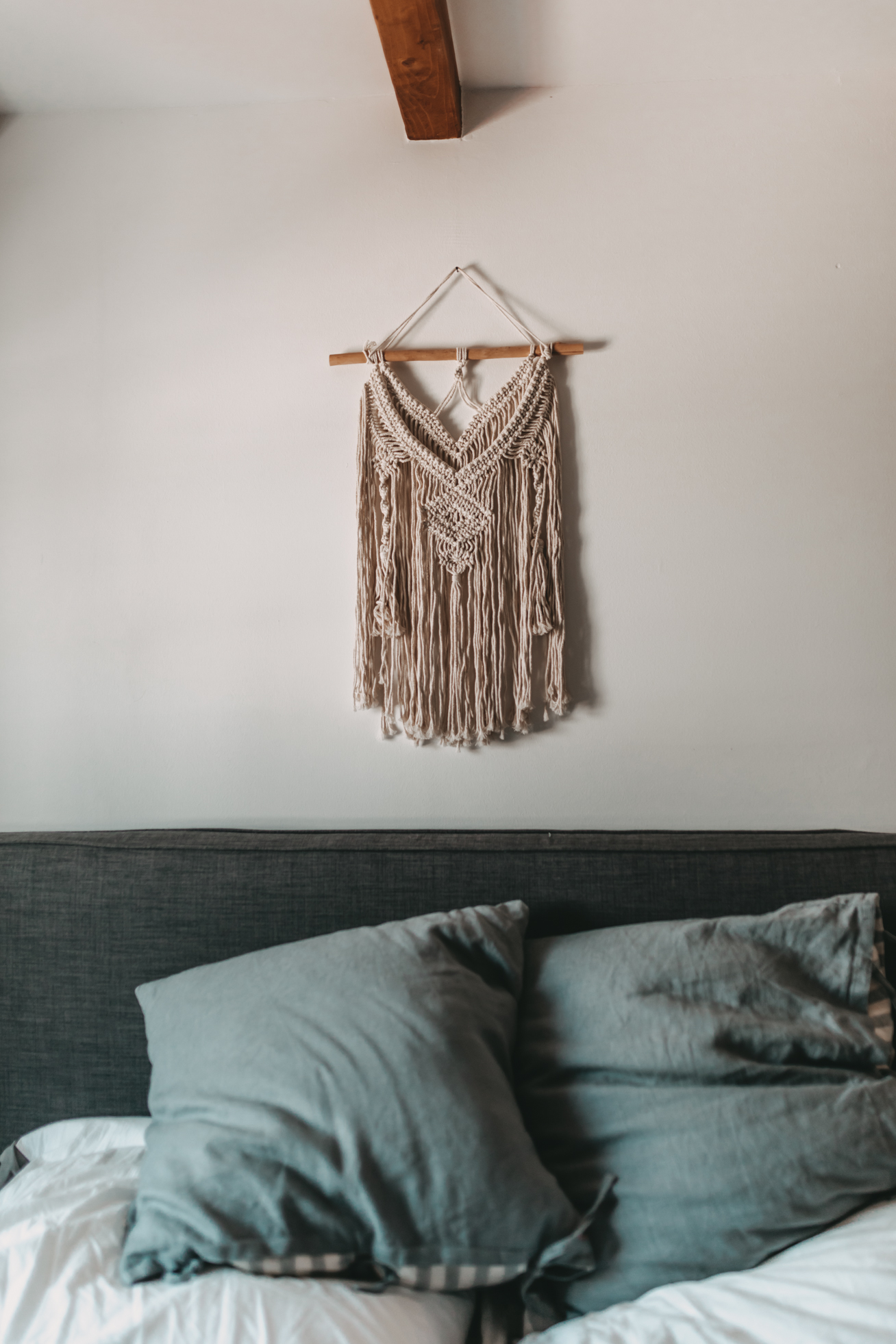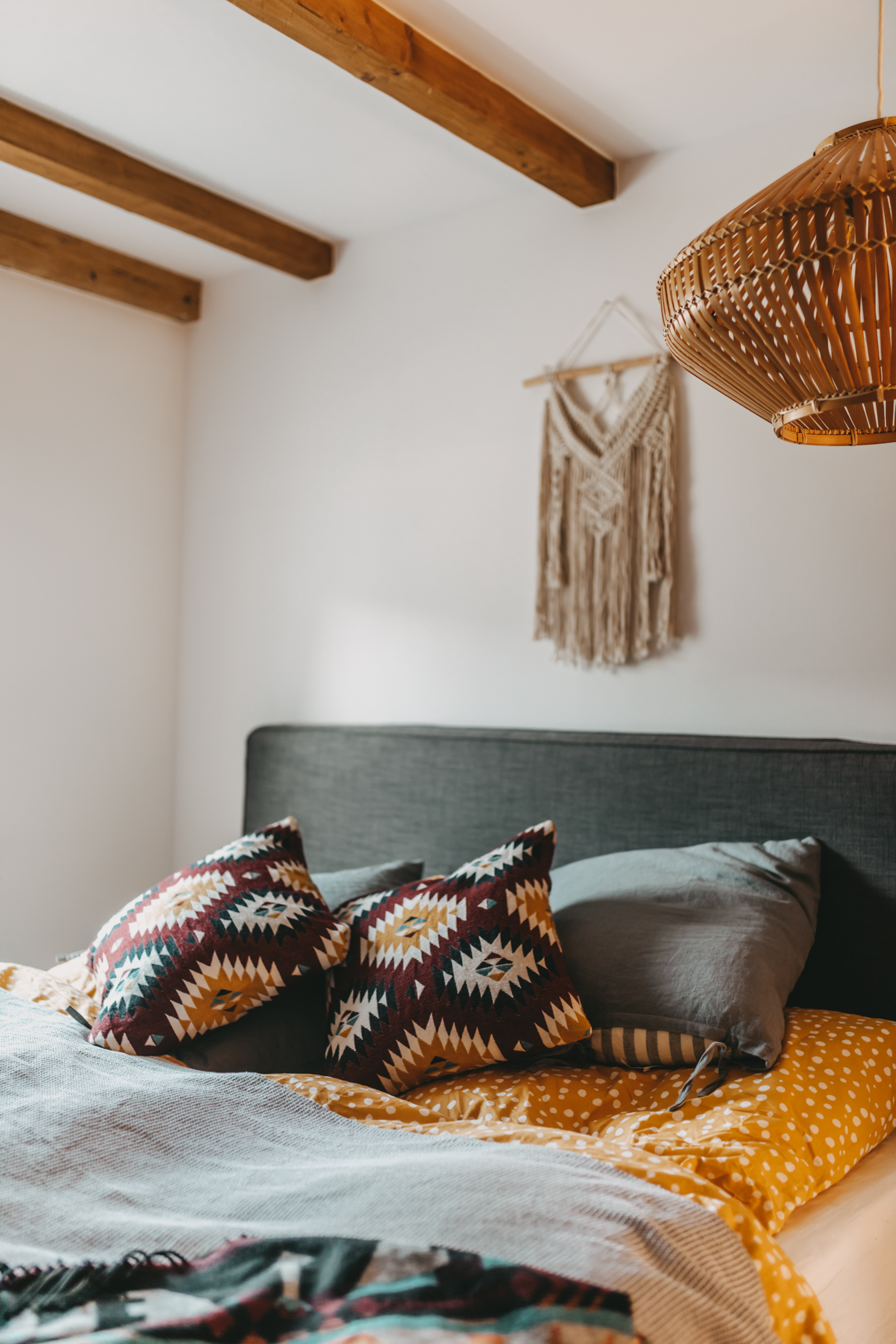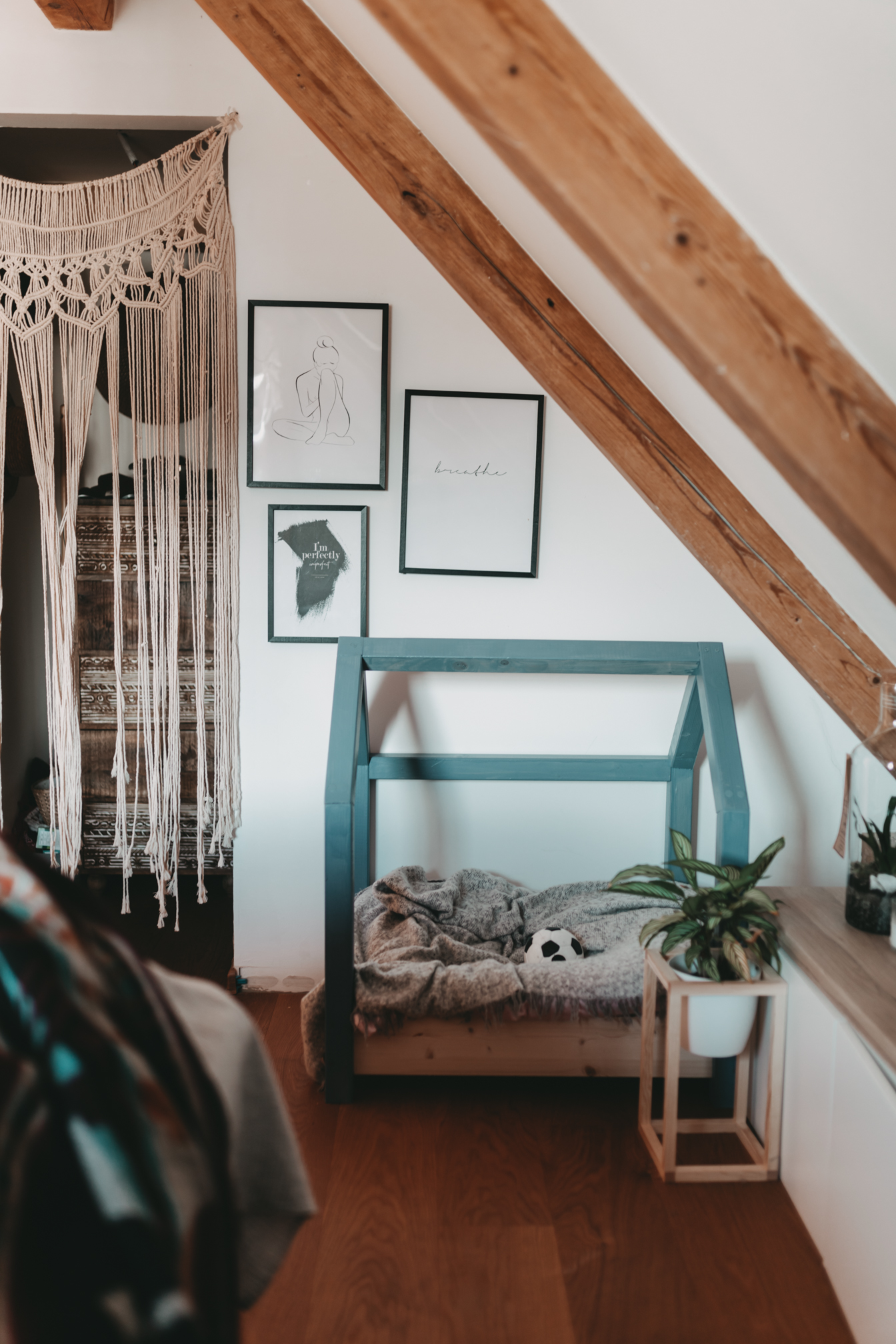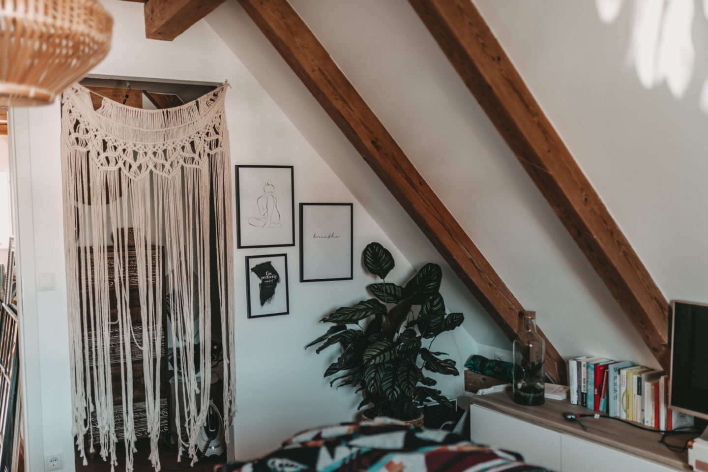 Den Beginn macht heute mein Schlafzimmer. Wie ihr vielleicht auf den Fotos sehen könnt, sind nach und nach noch ein paar Dinge eingezogen und die eine oder andere Pflanze musste weichen und in einen anderen Raum ziehen. Ich würde den Einrichtungsstil jetzt einfach mal Boho-Chic nennen, denn neben schönen gehäkelten Dekostücken wie z.B dem Makrame Vorhang, schmücken diesen Raum schöne Holzmöbel und viele Pflanzen. Ich habe versucht den Raum farblich eher schlicht zu halten und das ganze einfach mit bunter Bettwäsche und Kissen aufzupeppen. Neben den tollen Dachschrägen, finde ich den kleinen Abstellraum in meinem Schlafzimmer richtig grandios, denn dort kann ich einen Teil meiner Kleidung und Staubsauger und Co verstauen. Auch meine Hüte haben in diesem Eck Platz gefunden und machen sich auch ganz gut als Wanddeko.