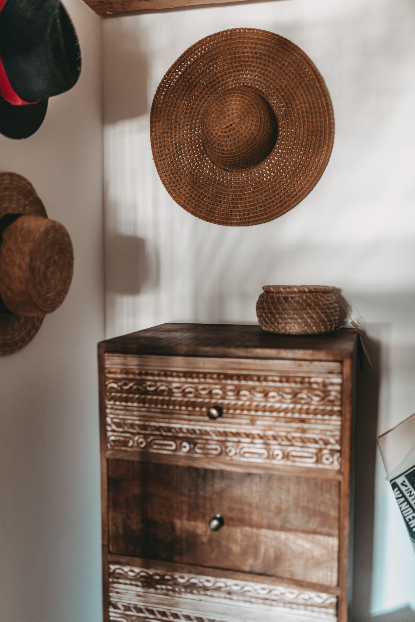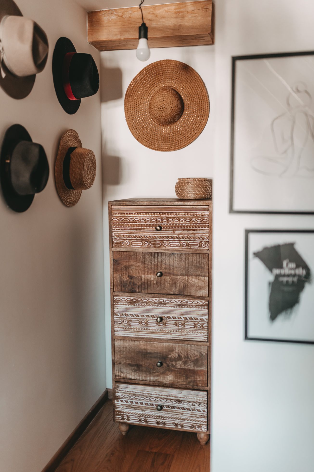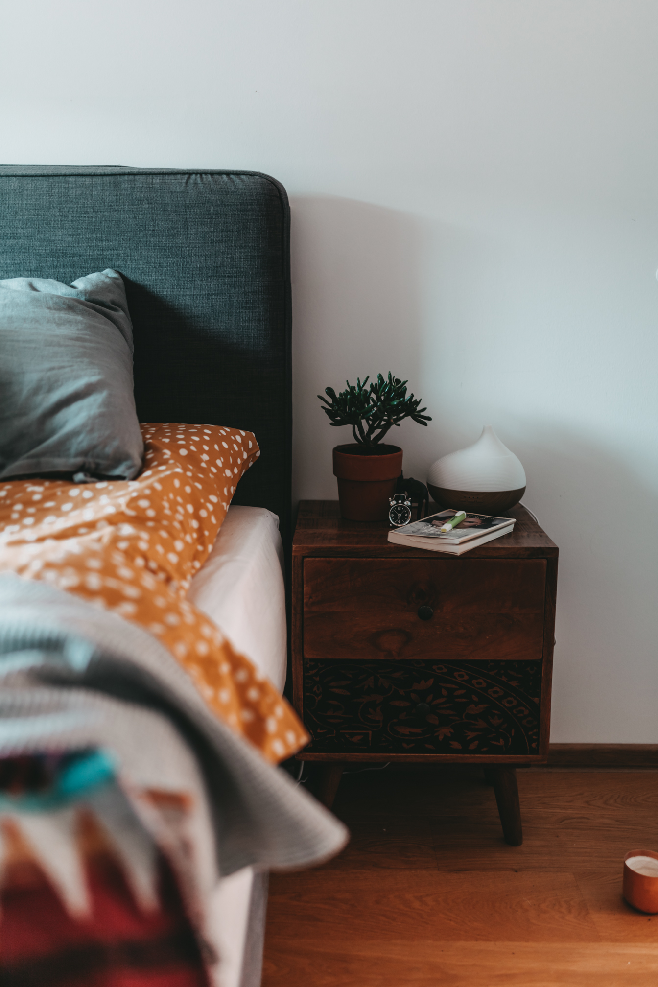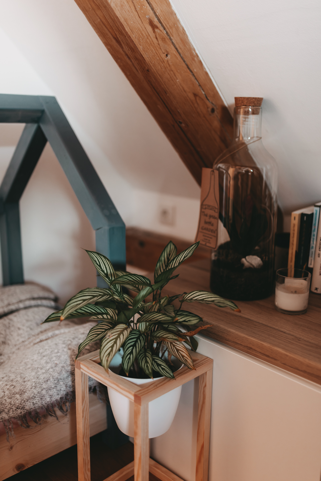 Den Beginn macht heute mein Schlafzimmer. Wie ihr vielleicht auf den Fotos sehen könnt, sind nach und nach noch ein paar Dinge eingezogen und die eine oder andere Pflanze musste weichen und in einen anderen Raum ziehen. Ich würde den Einrichtungsstil jetzt einfach mal Boho-Chic nennen, denn neben schönen gehäkelten Dekostücken wie z.B dem Makrame Vorhang, schmücken diesen Raum schöne Holzmöbel und viele Pflanzen. Ich habe versucht den Raum farblich eher schlicht zu halten und das ganze einfach mit bunter Bettwäsche und Kissen aufzupeppen. Neben den tollen Dachschrägen, finde ich den kleinen Abstellraum in meinem Schlafzimmer richtig grandios, denn dort kann ich einen Teil meiner Kleidung und Staubsauger und Co verstauen. Auch meine Hüte haben in diesem Eck Platz gefunden und machen sich auch ganz gut als Wanddeko.