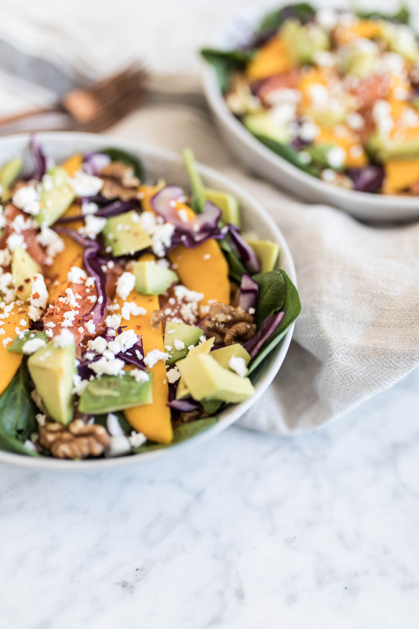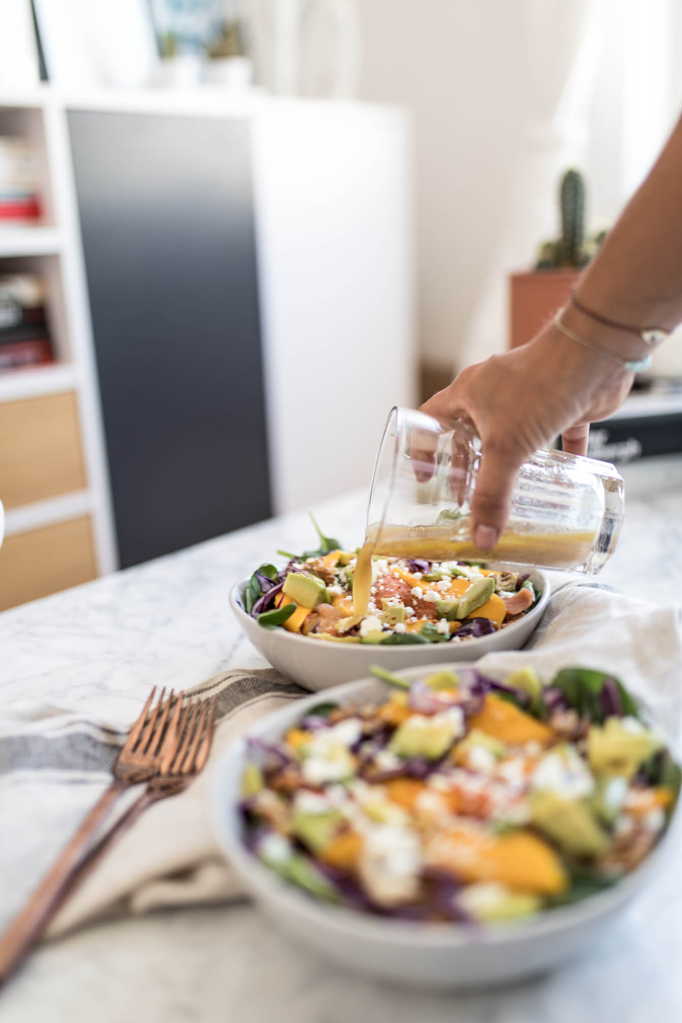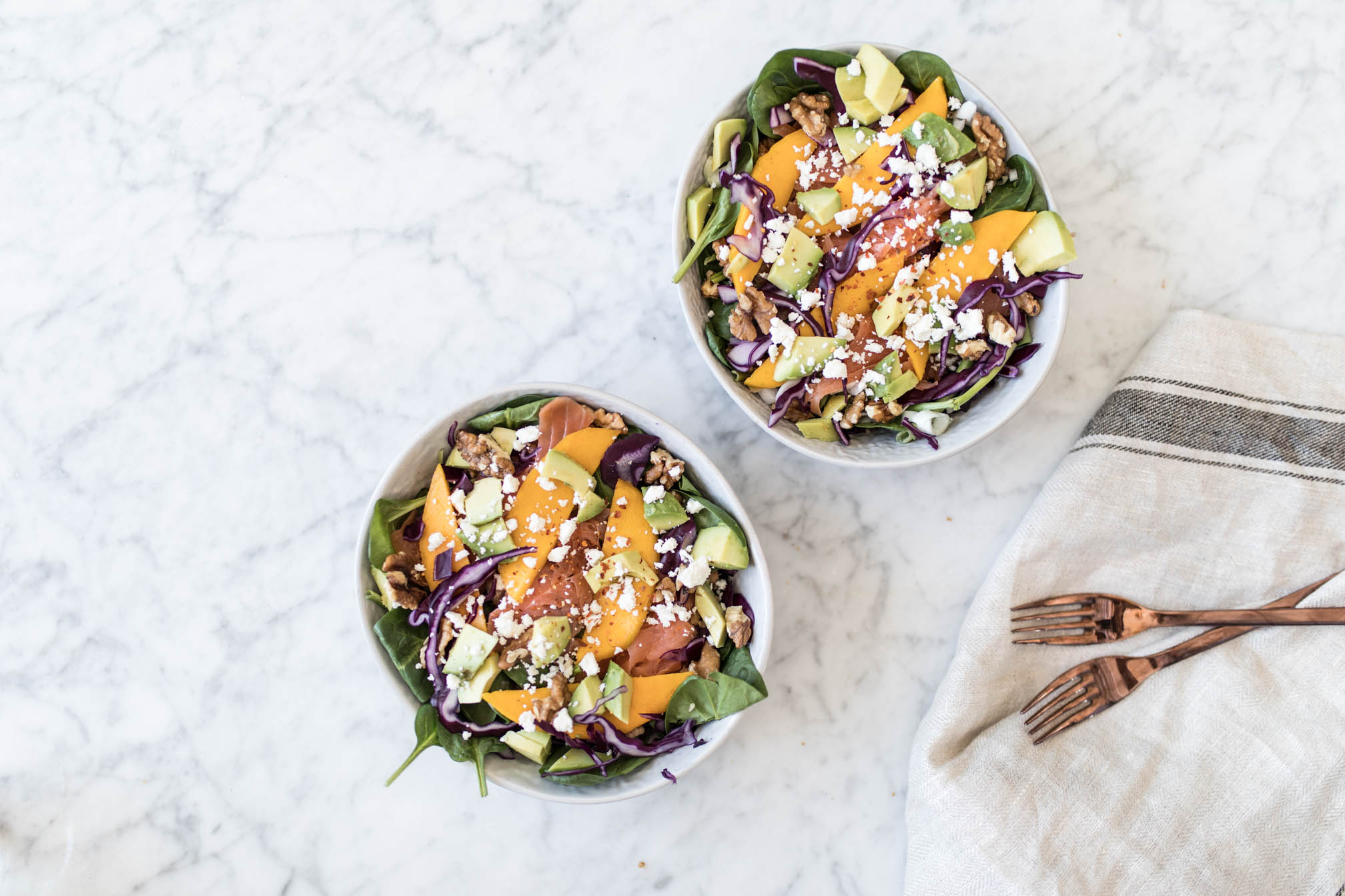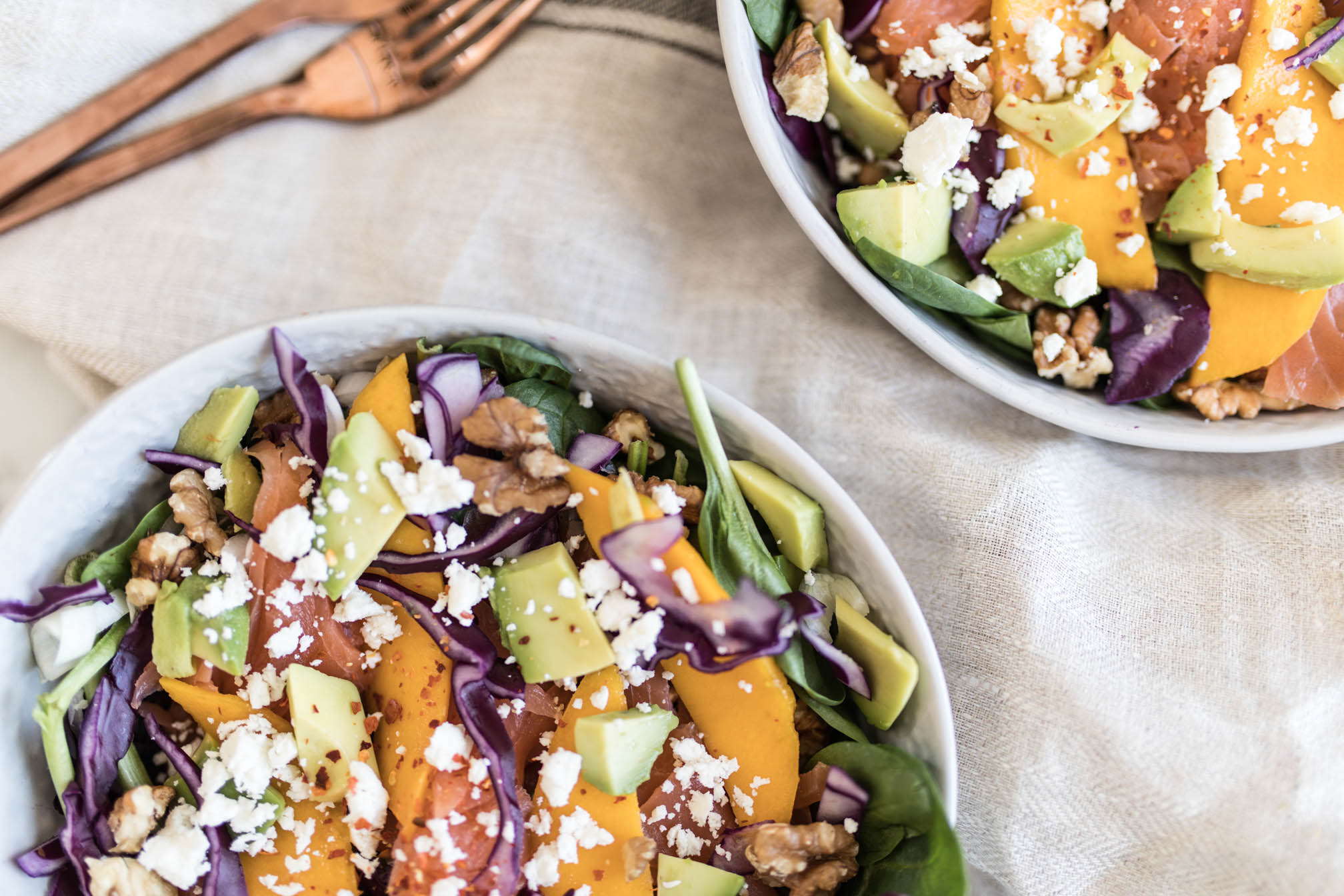 Da ich schon während meiner Reise einige Frage zu diesem leckeren Salat bekommen habe, musste ich ihn zuhause gleich nachmachen und ein bisschen Bali-Feeling nach Wien holen. Ihr müsst wissen, ich habe mich nämlich nicht nur in die Insel, sondern auch in das gute Essen verliebt. Es gibt so viele tolle Cafés und Restaurant und gesund Essen ist dort wirklich so unglaublich einfach und vor allem abwechslungsreich. Vor allem diese leckere Kombi aus Mango, Lachs und Avocado hat es mir angetan und ich kann euch gar nicht mehr genau sagen wie oft ich diesen Salat im Motion Café in Canggu gegessen habe. Irgendwie bekomme ich einfach nicht genug davon und seit ich wieder im Lande bin ist diese Kombi schon zwei Mal bei mir am Tisch gestanden – es ist einfach alles drinnen was ich gerne esse und auch die liebe Sophie habe ich schon damit angesteckt. Außerdem finde ich, dass die Walnüsse und das Rotkraut dem Salat noch das gewisse Etwas verleihen und ja er schreit einfach nach Sommer und Sonnenschein. Deshalb möchte ich euch das Rezept dafür natürlich auch nicht vorenthalten. Ich muss zwar zugeben auf Bali hat er noch eine Spur besser geschmeckt, aber das liegt wahrscheinlich eher dem Wetter und der Atmosphäre.