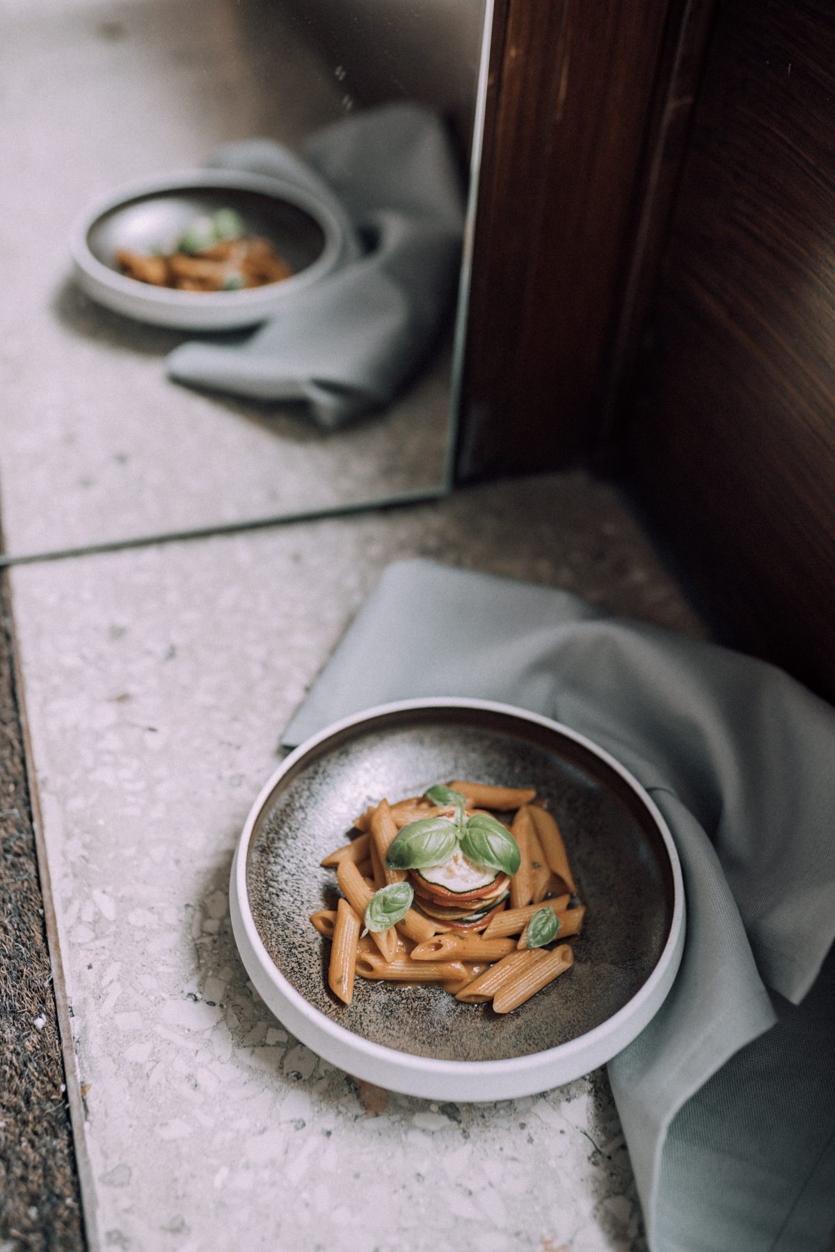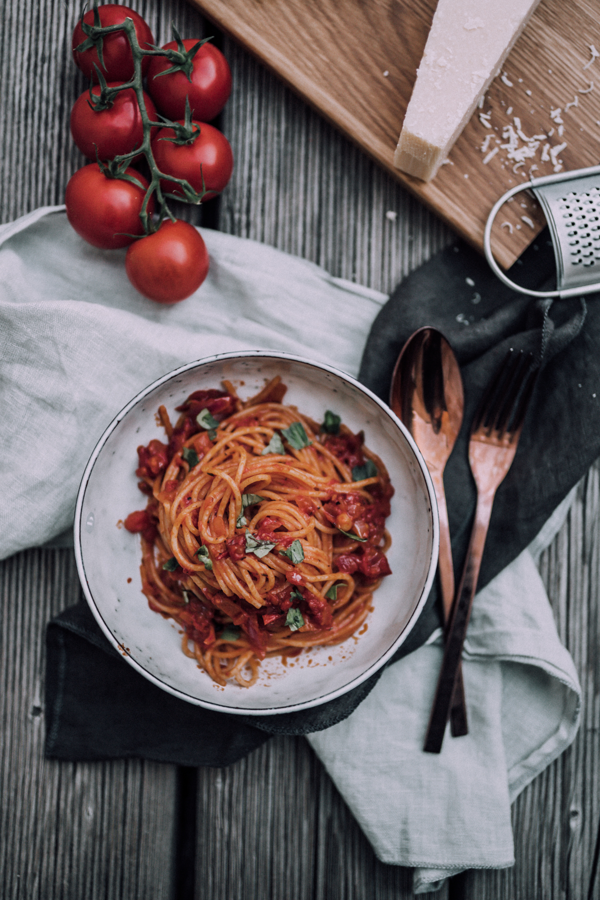 - Wenn die Nudeln fertig sind, kann man den Stängel der Tomaten entfernen. Mitgegessen wird der nämlich nicht. Ja und dann können die Nudeln auch schon mit der Sauce vermengt werden. Zum Schluss noch frischen Basilikum dazugeben, mit Parmesan anrichten und genießen.