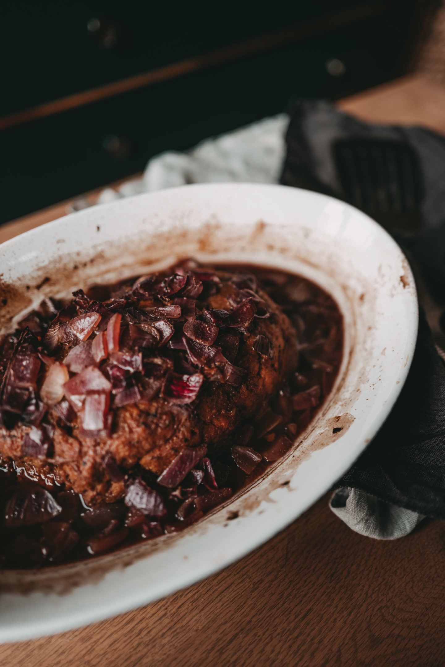 - Für die Zubereitung der Sauce alle Zutaten miteinander verrühren, abschließend die Zwiebel hinzugeben und über den Braten leeren,